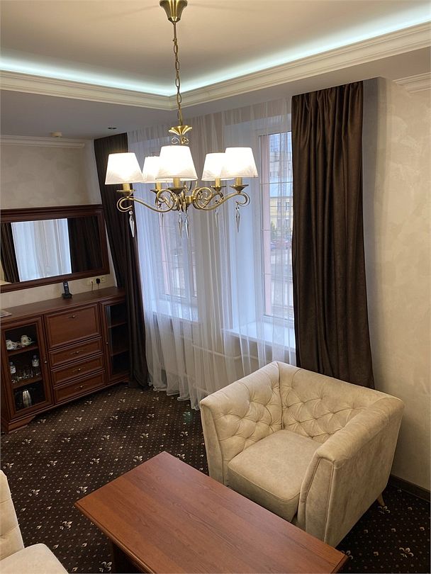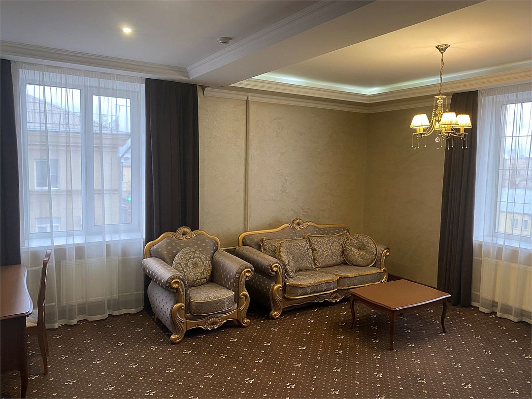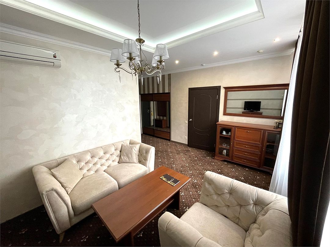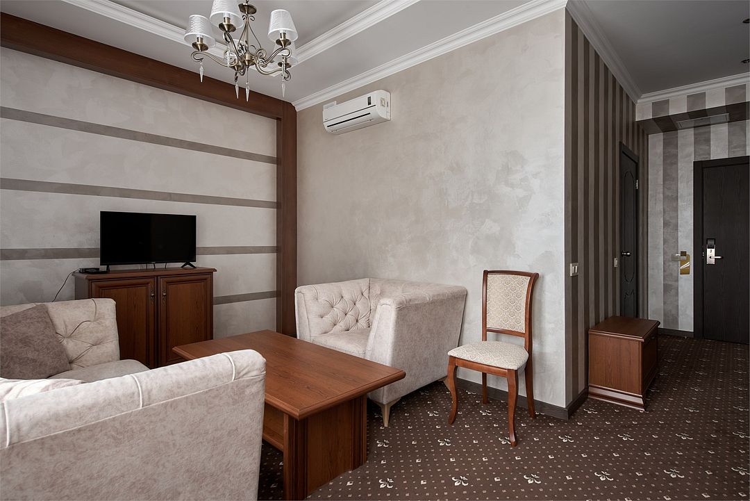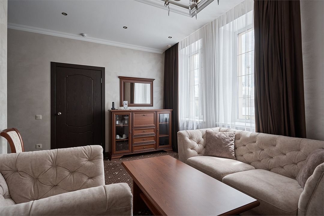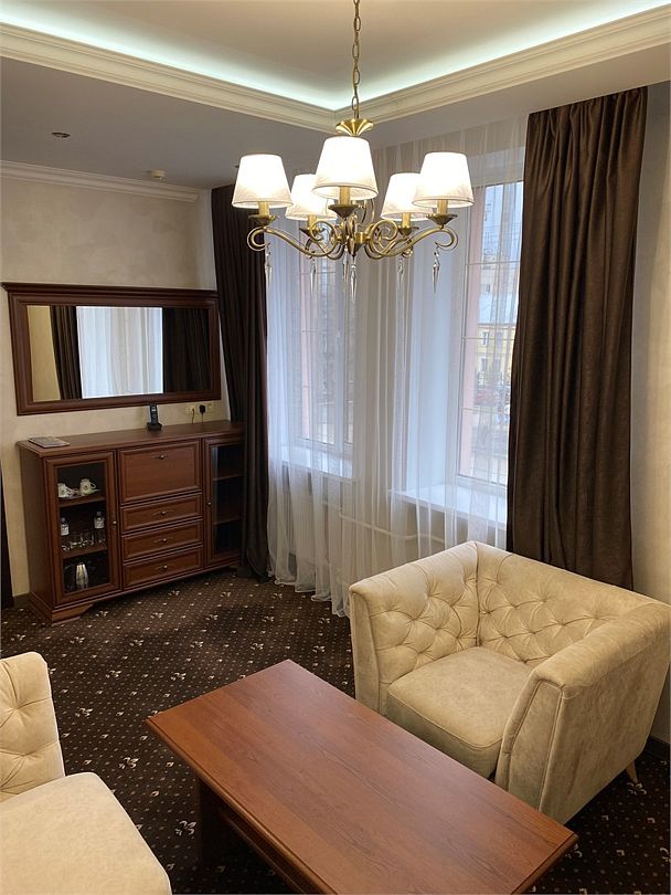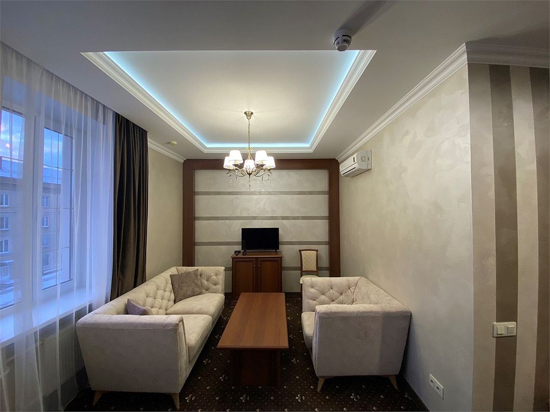 «Люкс Комфорт» (50 м2, макс. 2 чел.) - представляют собой классический вариант: две комнаты – гостиная и спальня. Номер оформлен в классическом стиле с элементами современного дизайна. Тёплые цвета интерьера создают уютную атмосферу, подходящую для отдыха и работы. Просторная спальня с большим окном обеспечивает естественное освещение в течение дня. Гостиная зона приглашает отдохнуть на удобном диване. Оснащение номера: Двуспальная кровать Удобный диван и кресло в гостиной Телевизор Шкаф-купе с зеркалом Письменный стол Кондиционер Холодильник Шторы и легкие занавески для регулировки освещения Мини-барУслуги и удобства