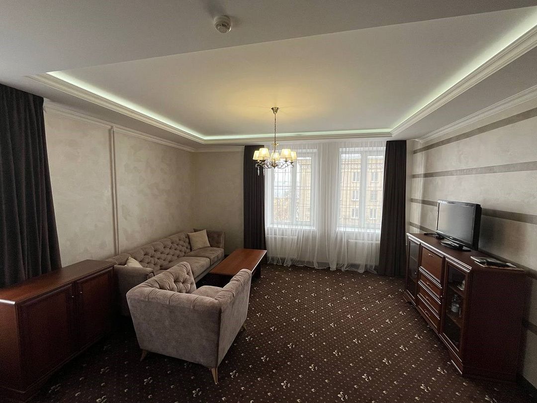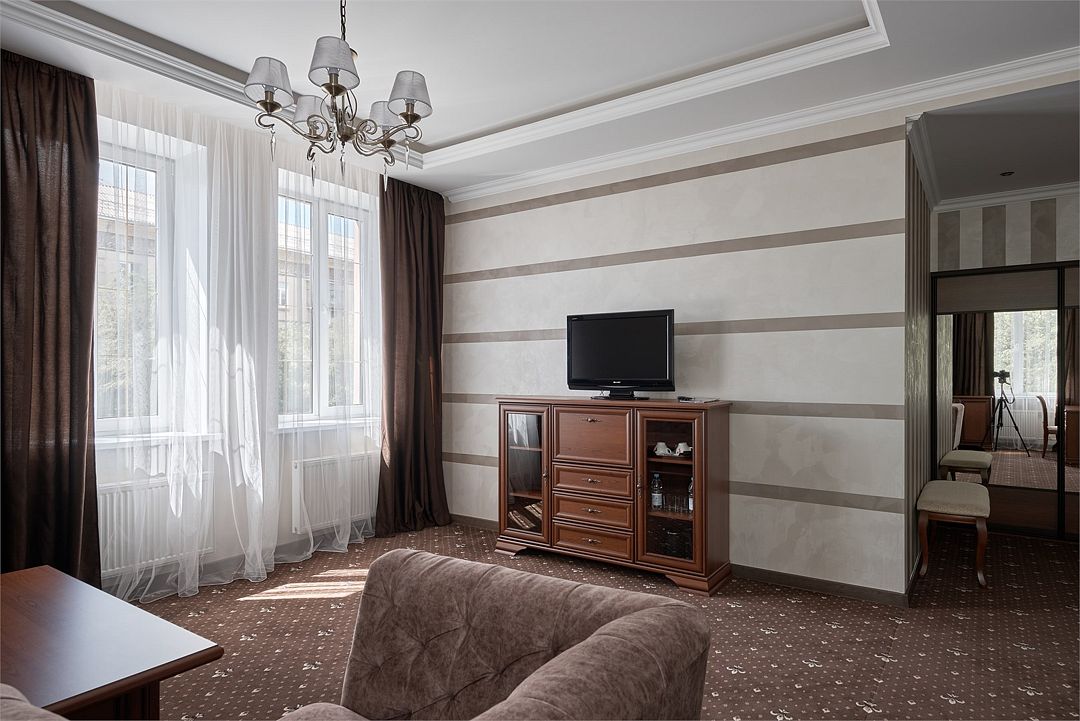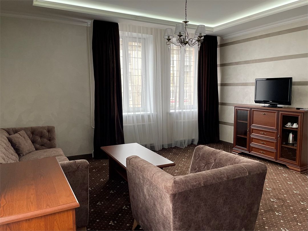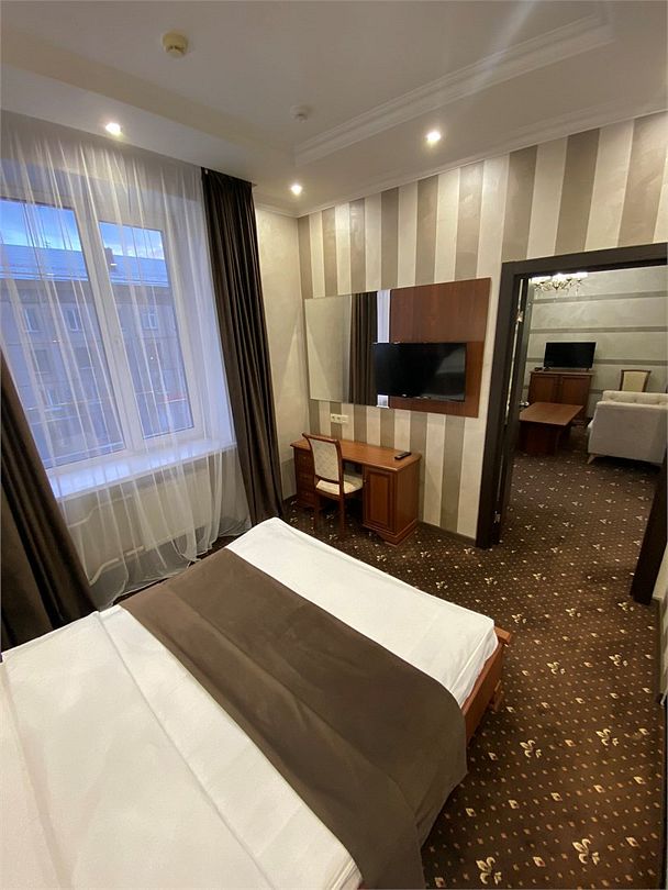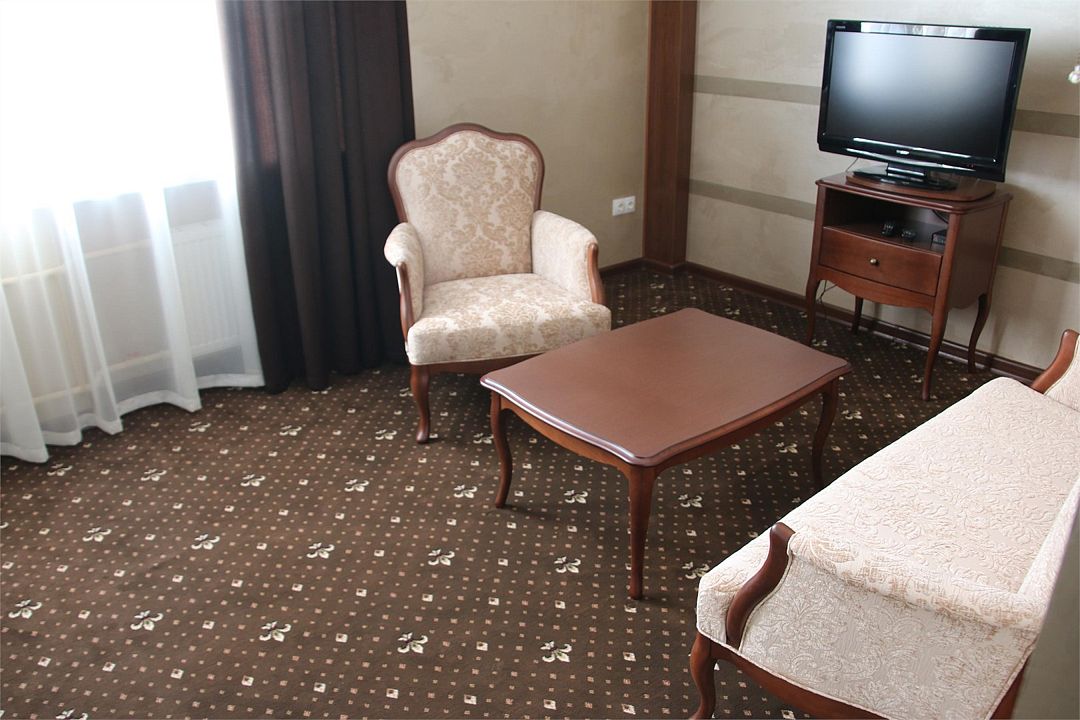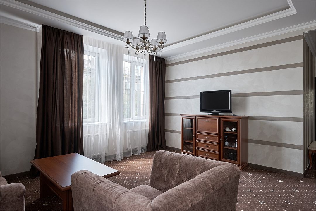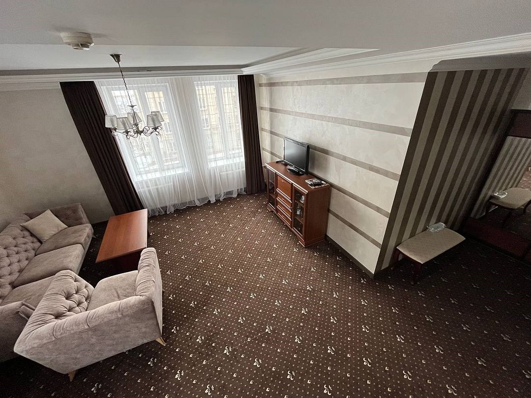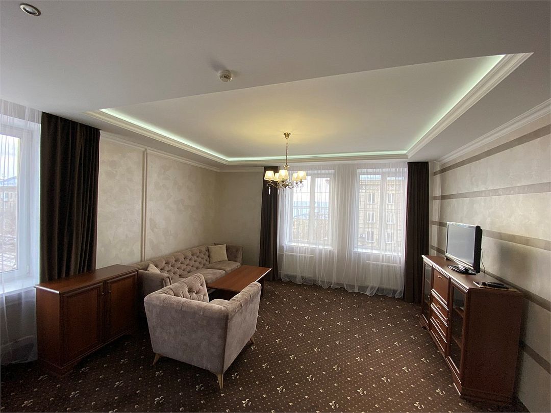 «Люкс Комфорт» (50 м2, макс. 2 чел.) - представляют собой классический вариант: две комнаты – гостиная и спальня. Номер оформлен в классическом стиле с элементами современного дизайна. Тёплые цвета интерьера создают уютную атмосферу, подходящую для отдыха и работы. Просторная спальня с большим окном обеспечивает естественное освещение в течение дня. Гостиная зона приглашает отдохнуть на удобном диване. Оснащение номера: Двуспальная кровать Удобный диван и кресло в гостиной Телевизор Шкаф-купе с зеркалом Письменный стол Кондиционер Холодильник Шторы и легкие занавески для регулировки освещения Мини-барУслуги и удобства
