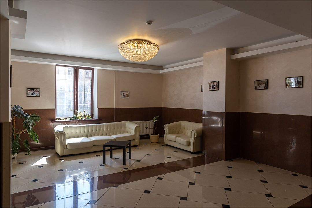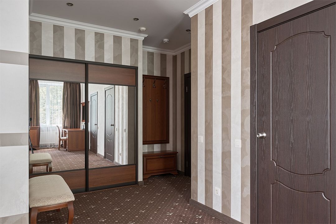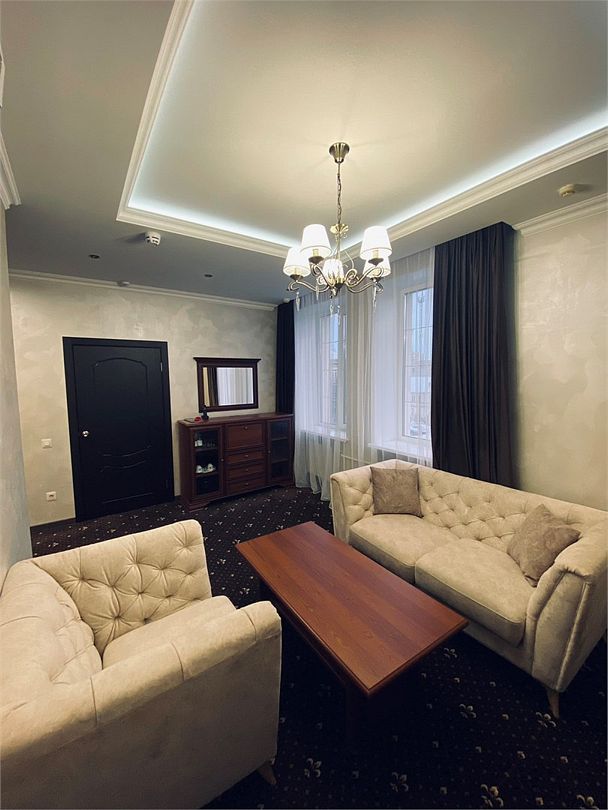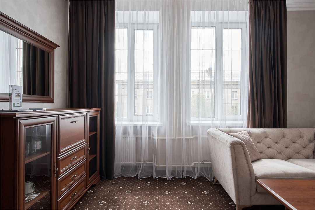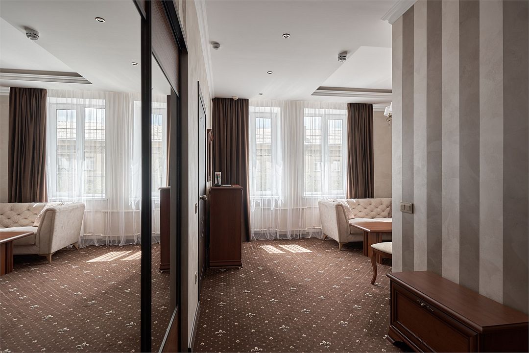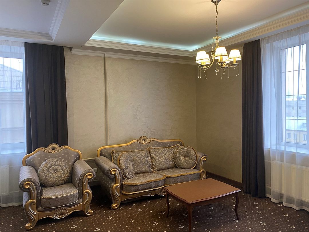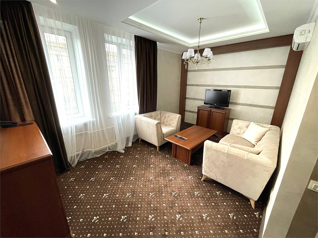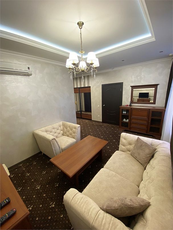 «Люкс Комфорт» (50 м2, макс. 2 чел.) - представляют собой классический вариант: две комнаты – гостиная и спальня. Номер оформлен в классическом стиле с элементами современного дизайна. Тёплые цвета интерьера создают уютную атмосферу, подходящую для отдыха и работы. Просторная спальня с большим окном обеспечивает естественное освещение в течение дня. Гостиная зона приглашает отдохнуть на удобном диване. Оснащение номера: Двуспальная кровать Удобный диван и кресло в гостиной Телевизор Шкаф-купе с зеркалом Письменный стол Кондиционер Холодильник Шторы и легкие занавески для регулировки освещения Мини-барУслуги и удобства