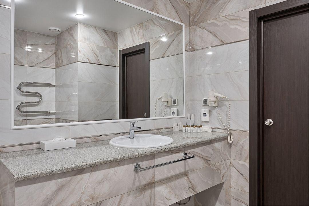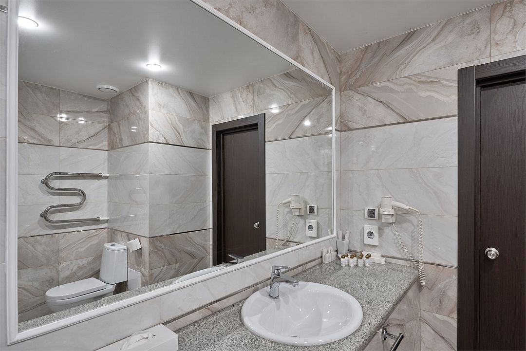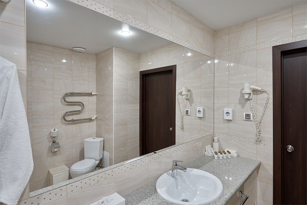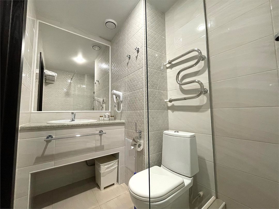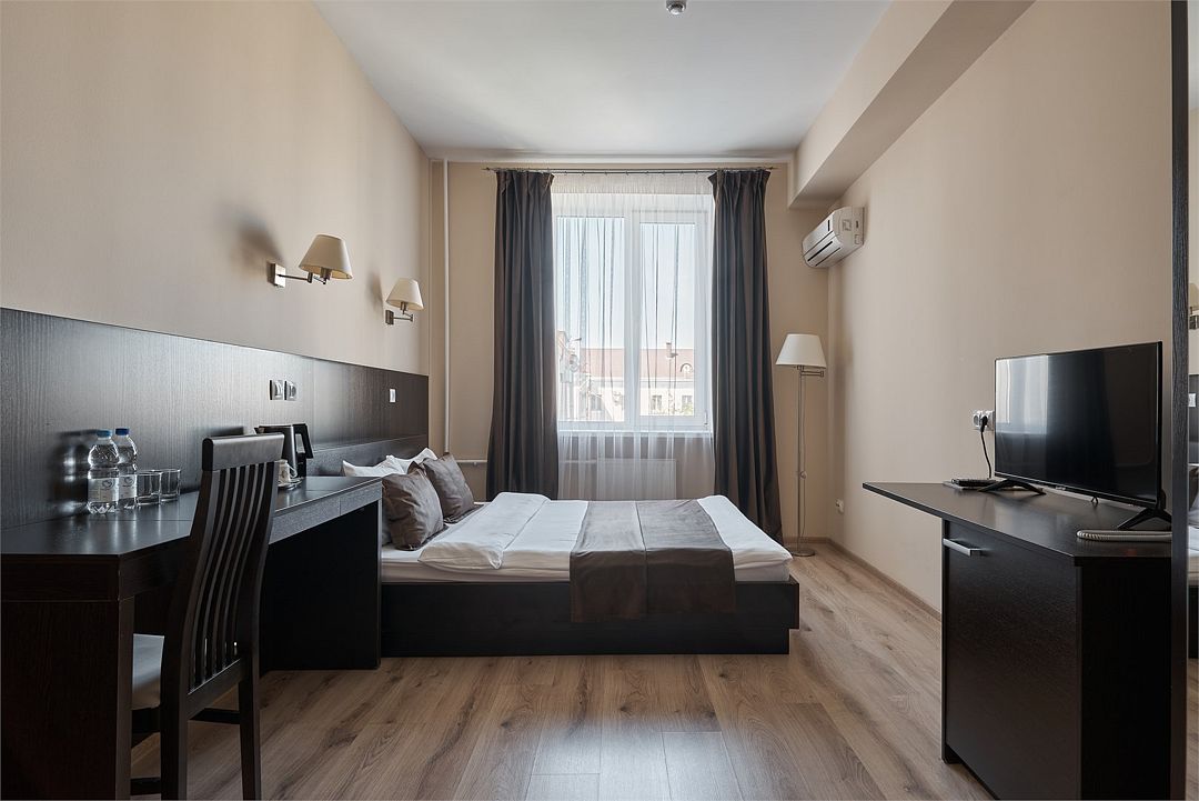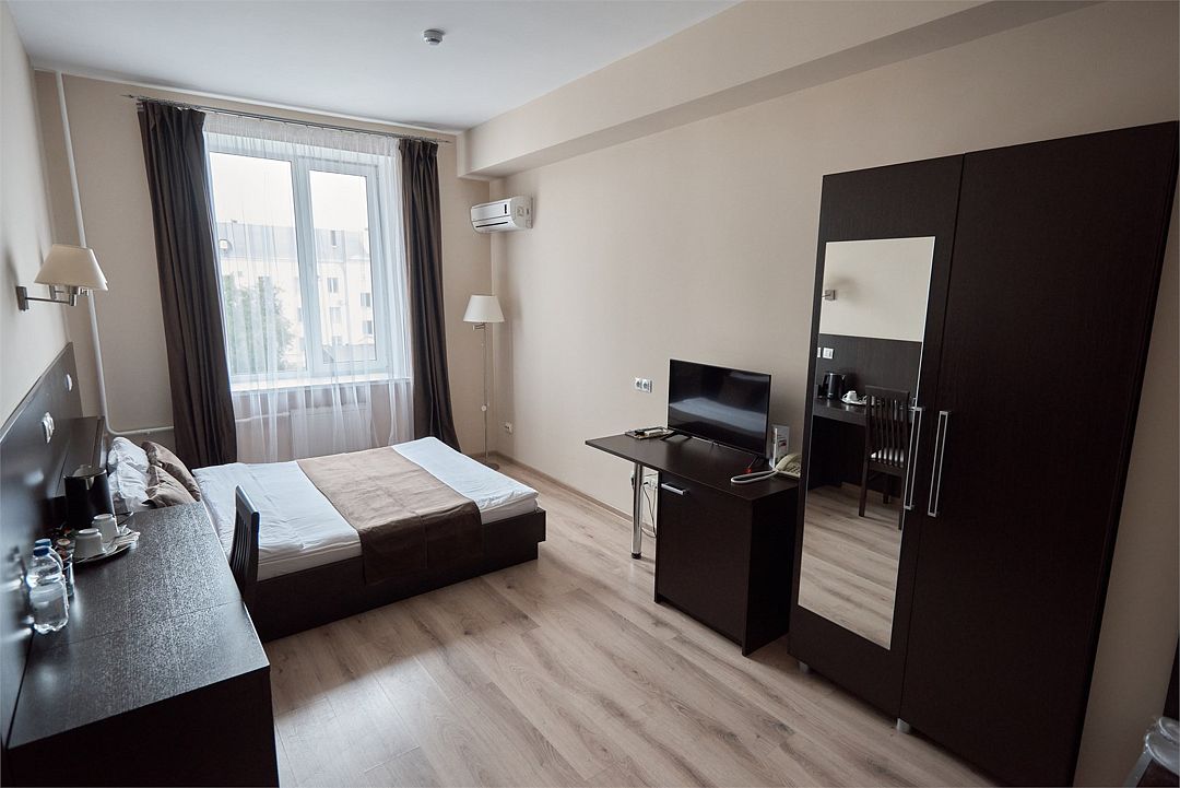 телевизор, кабельное телевидение, Wi-Fi, интернет, кондиционер, светильник, фен, система безопасности, электронные замки, душевая кабина, санузел, банные принадлежности, банные полотенца, тапочки, гигиенические средства, косметические средства, двуспальная кровать, тумбы, стулья, шкаф для одежды, письменный стол, багажная тумба, зеркало, обслуживание номеров, информационная карта, меню, сейф, унитаз, раковина, питьевая вода, отопление, душ, вид на город, кулер на этаже, вид во двор, ламинат, стаканы, стул, туалетные средства, внутренний телефон, мини-холодильник, уборка номера, услуги прачечной (платно), вешалки-плечики, шапочка для душа, мыло, прачечная (за дополнительную плату), онлайн-регистрацияВ гостиничном номере
