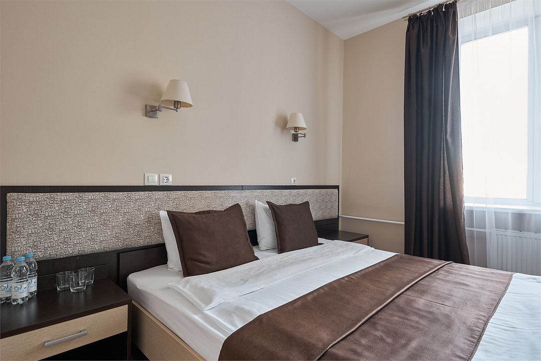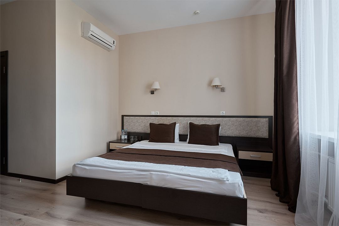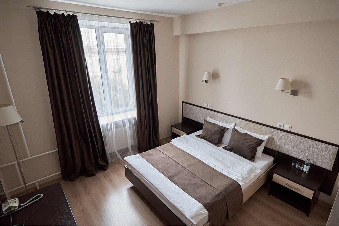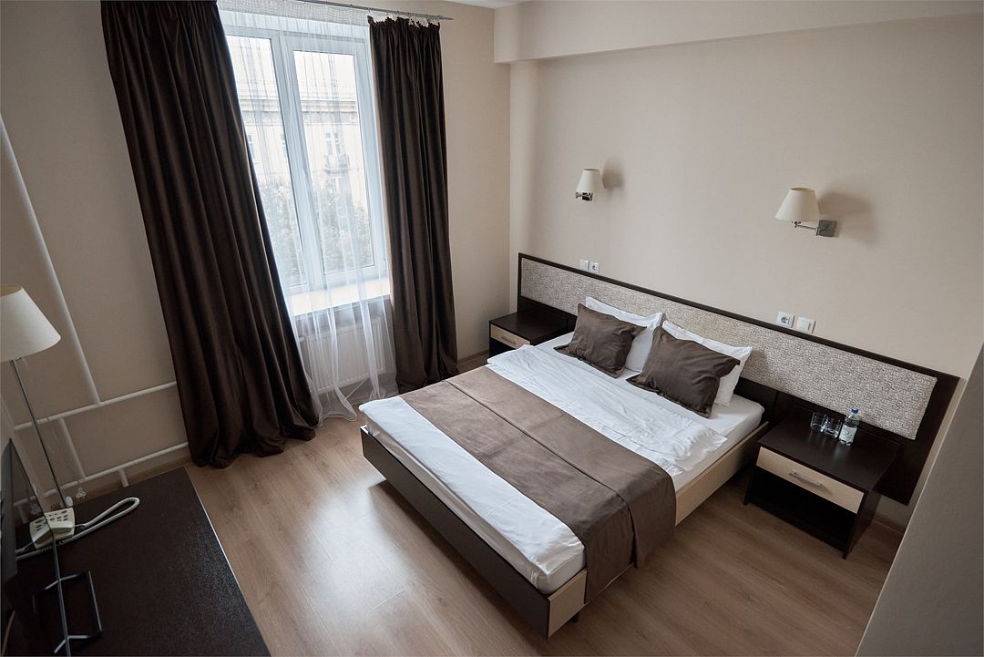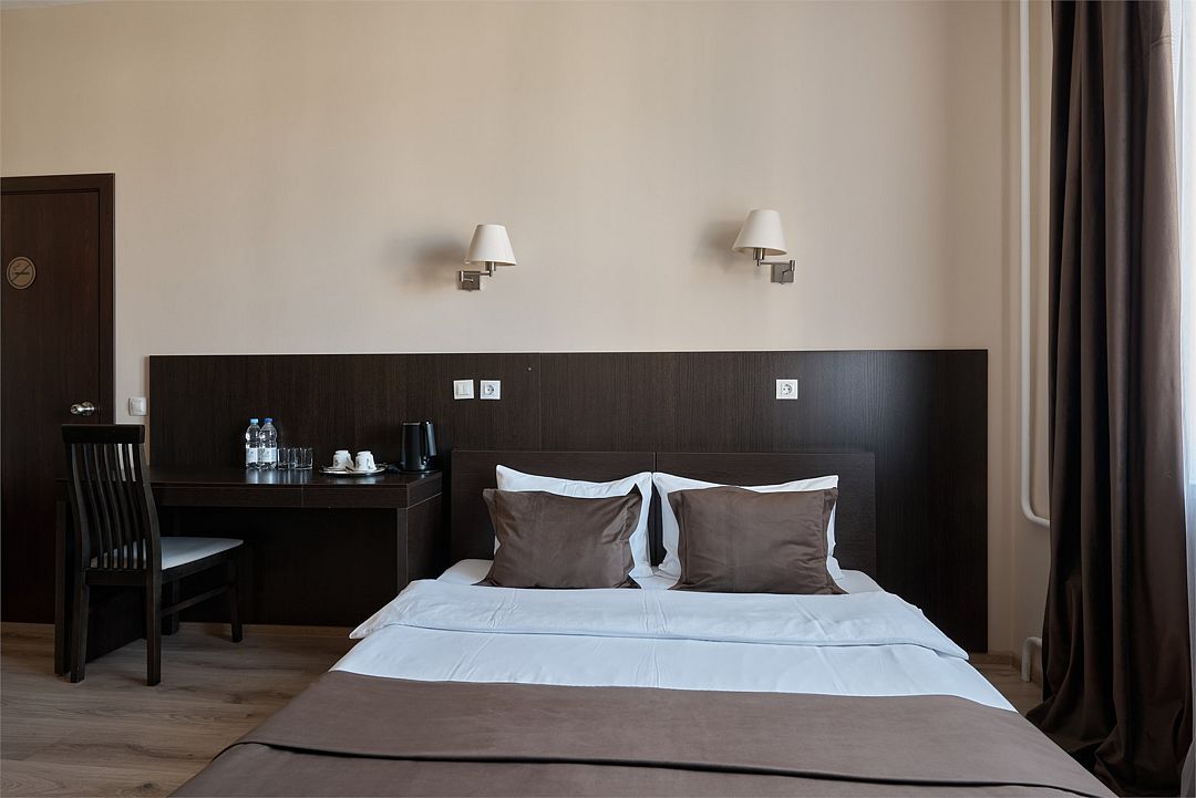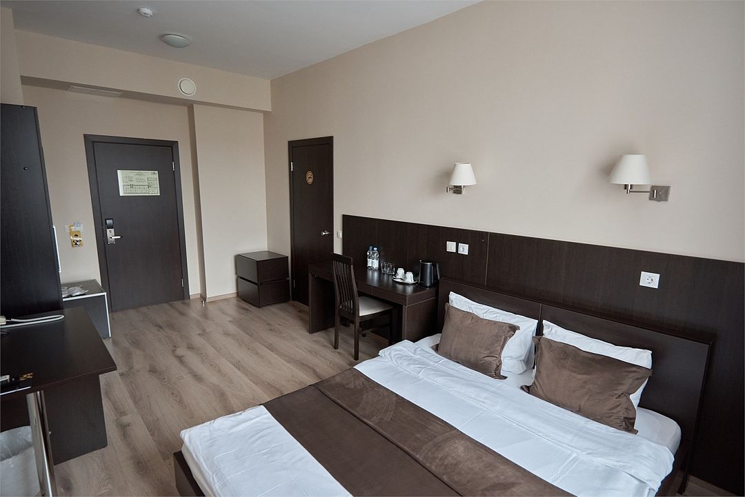 «ДВУХМЕСТНЫЙ СТАНДАРТ» (22м2, макс. 2 чел.) - представляют собой классический вариант: одна комната. Выполненный в бежевых тонах интерьер, мебель цвета венге – все это придает номеру исключительно благородный стиль. В ванной комнате: душ, комплект полотенец, косметические принадлежности, фен, набор полотенец, тапочки. «DOUBLE ROOM» одна комната, одна двуспальная кровать ЖК телевизор, высокоскоростной WI-FI Интернет, шкаф для верхней одежды, кондиционер, холодильник, сейф (бесплатно), письменный стол, душевая кабина, фен, телефон, покрытие – ламинат.Услуги и удобства