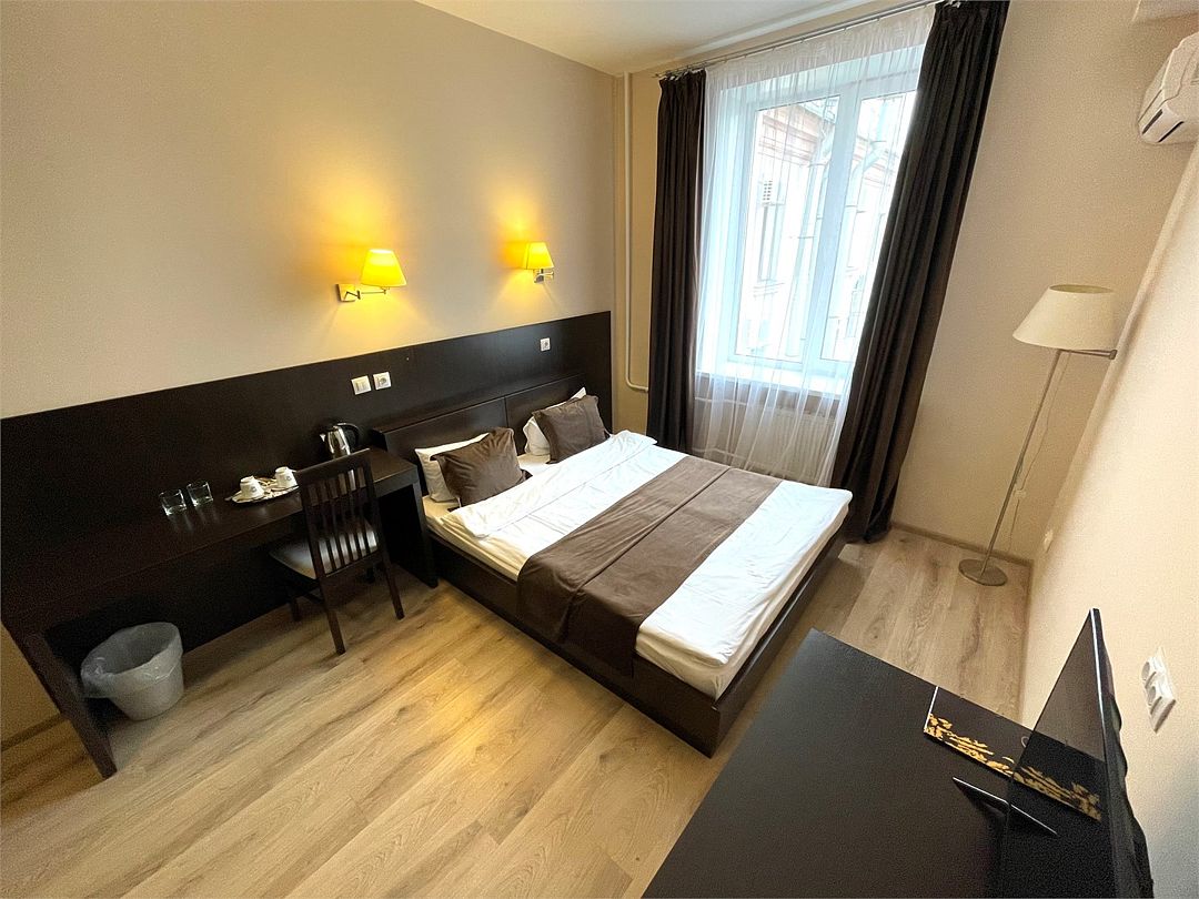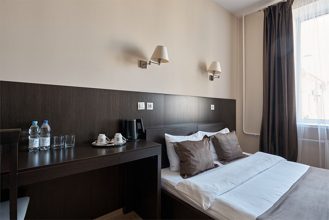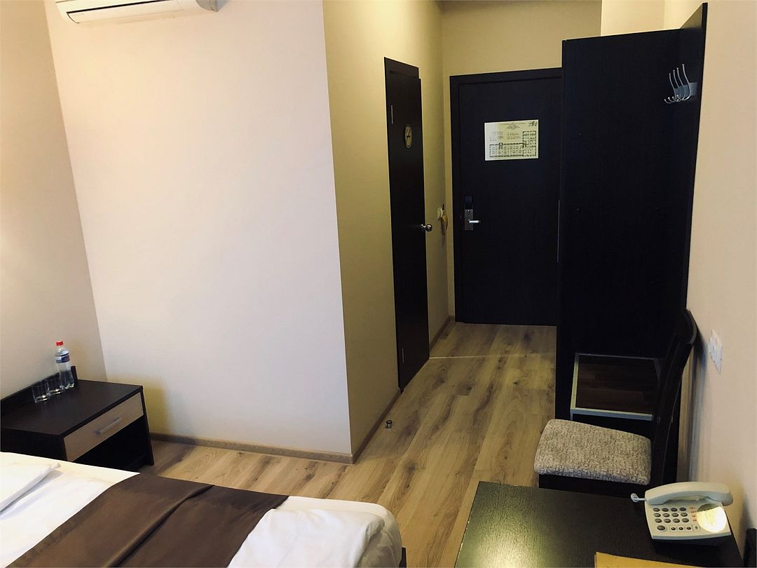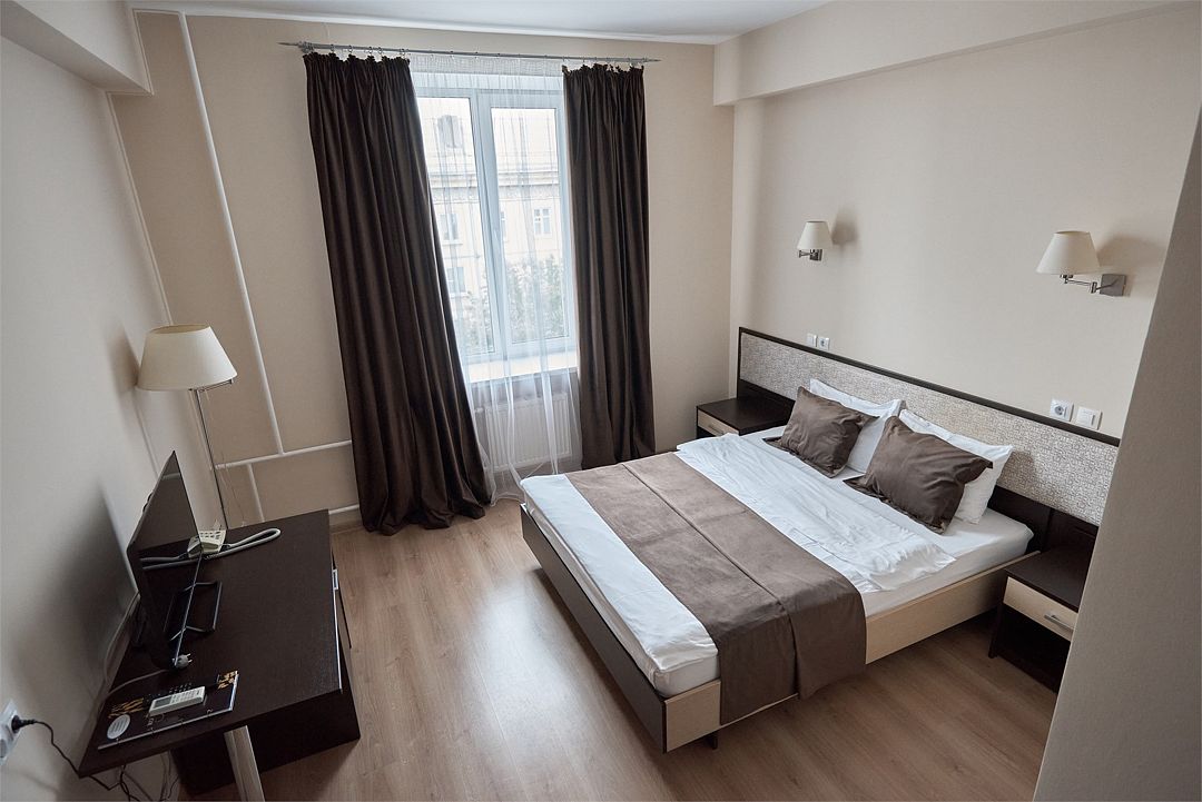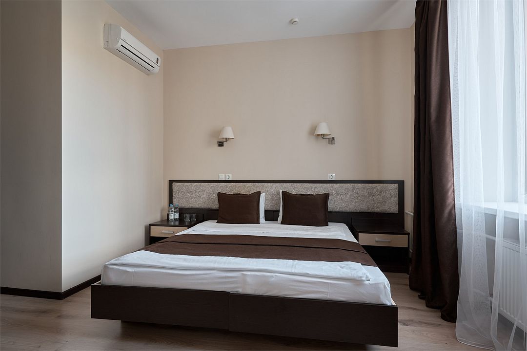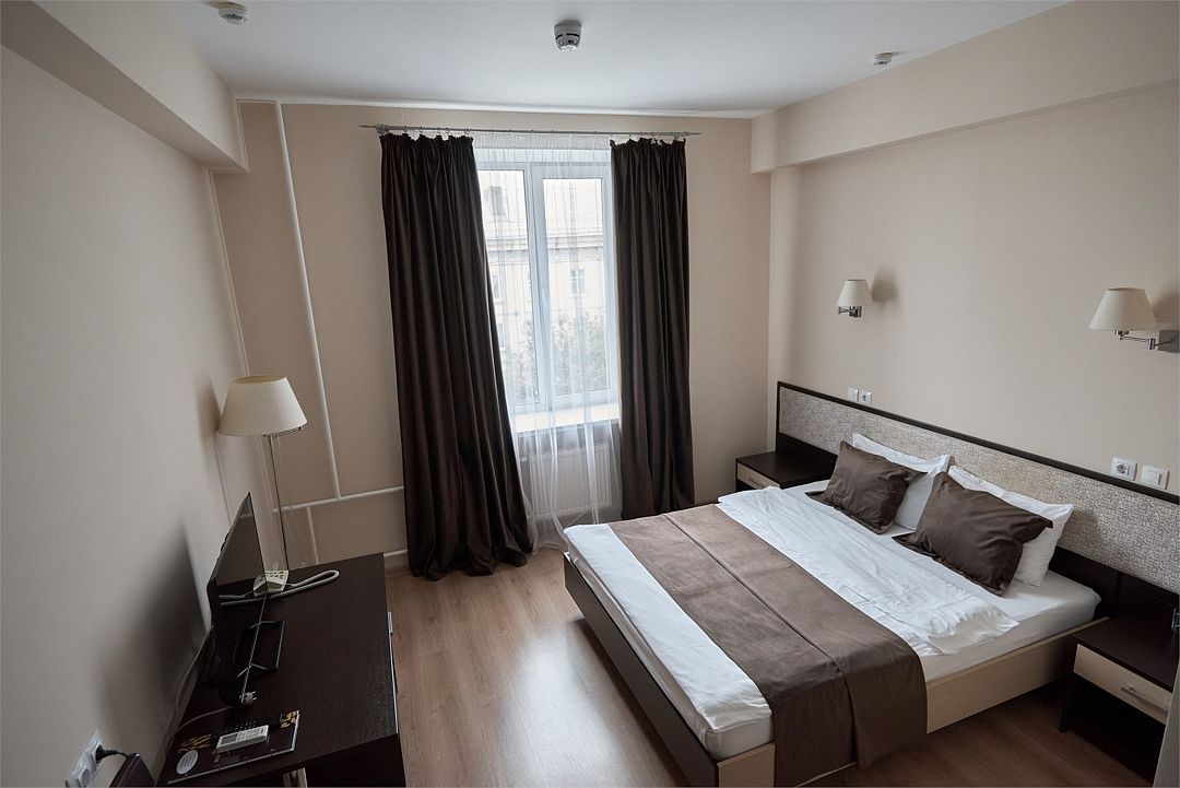 «ДВУХМЕСТНЫЙ СТАНДАРТ» (22м2, макс. 2 чел.) - представляют собой классический вариант: одна комната. Выполненный в бежевых тонах интерьер, мебель цвета венге – все это придает номеру исключительно благородный стиль. В ванной комнате: душ, комплект полотенец, косметические принадлежности, фен, набор полотенец, тапочки. «DOUBLE ROOM» одна комната, одна двуспальная кровать ЖК телевизор, высокоскоростной WI-FI Интернет, шкаф для верхней одежды, кондиционер, холодильник, сейф (бесплатно), письменный стол, душевая кабина, фен, телефон, покрытие – ламинат.Услуги и удобства
