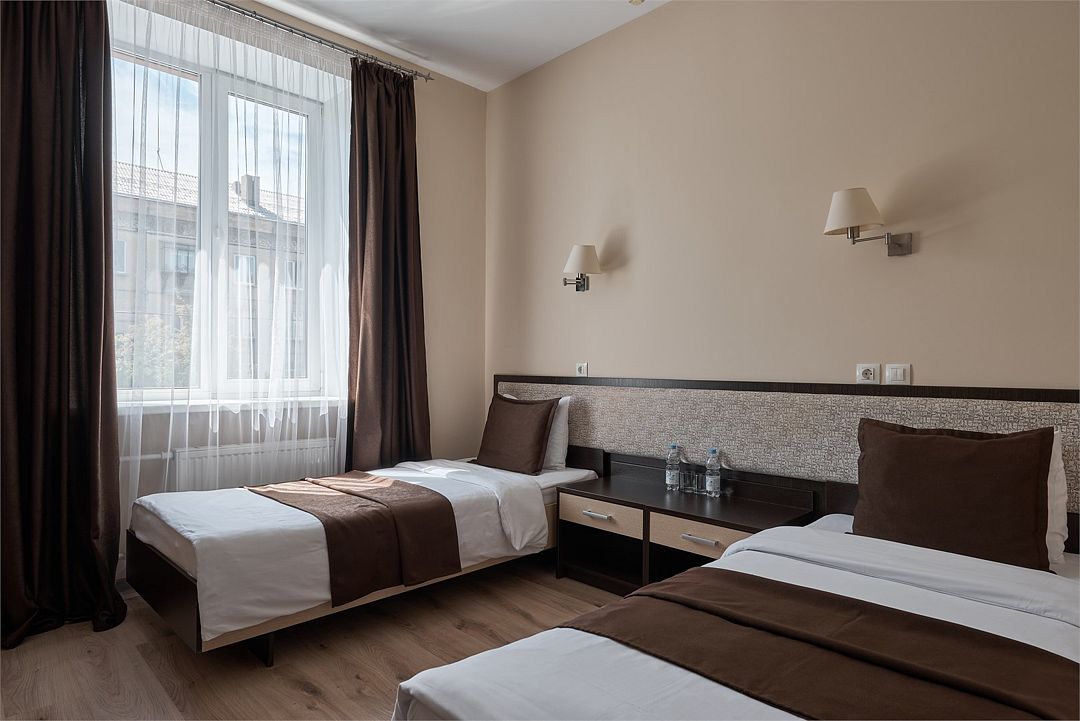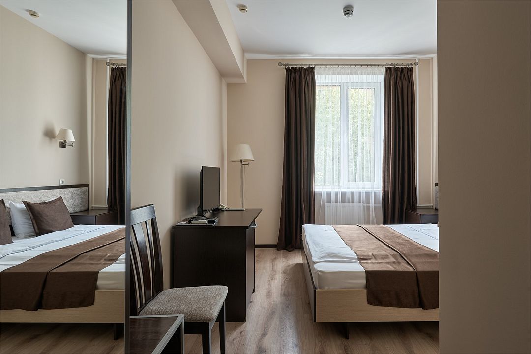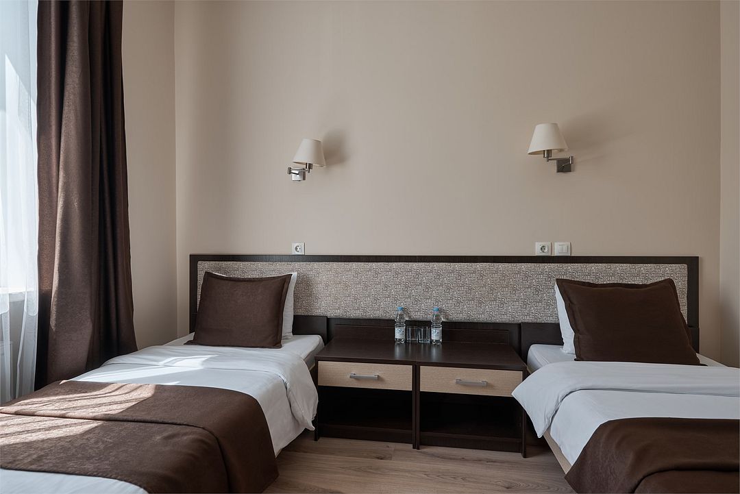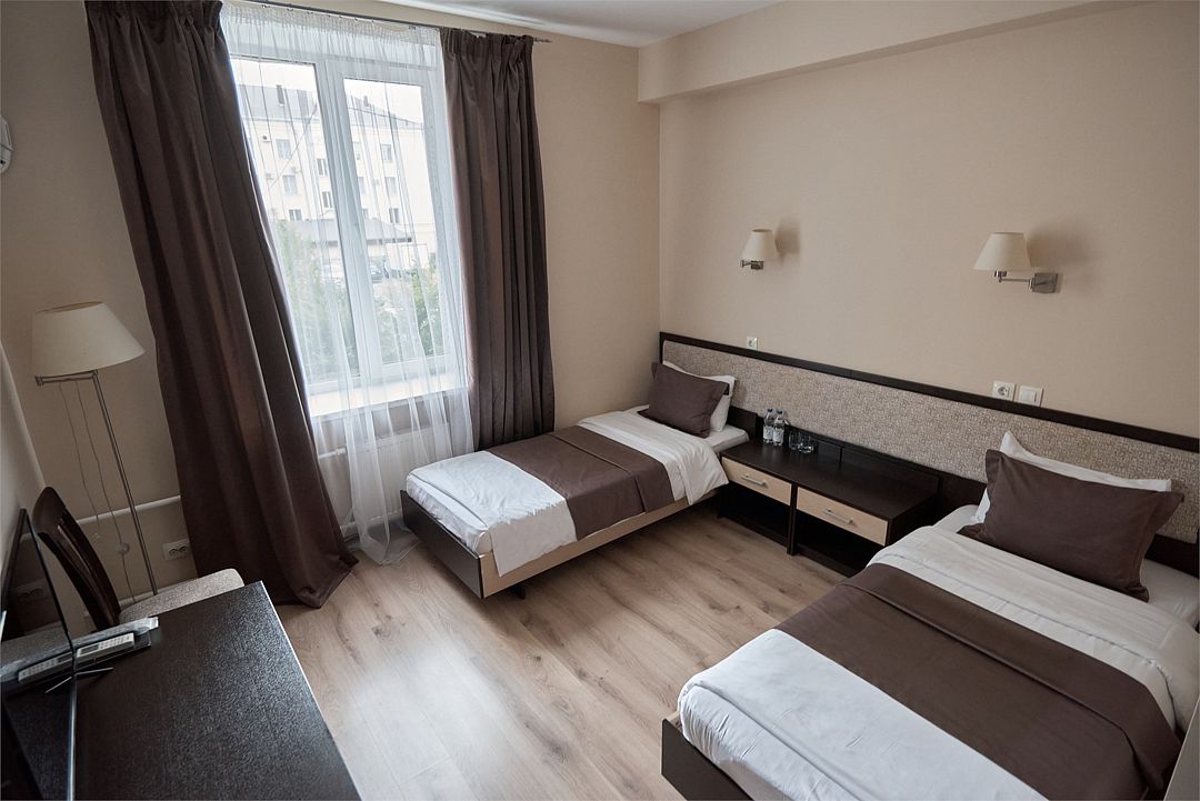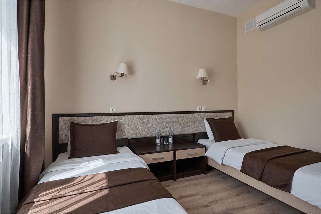«ДВУХМЕСТНЫЙ СТАНДАРТ»(19 - 22м2, макс. 2 чел.) - представляют собой классический вариант: одна комната. Выполненный в бежевых тонах интерьер, мебель цвета венге – все это придает номеру исключительно благородный стиль. «TWIN ROOM » одна комната, две односпальных кровати. Двухместный номер с двумя раздельными кроватями. В ванной комнате: душ, комплект полотенец, косметические принадлежности, фен, тапочки. ЖК телевизор , высокоскоростной WI-FI Интернет, шкаф для верхней одежды, кондиционер, холодильник, сейф (бесплатно) , письменный стол, душевая кабина, фен, телефон, покрытие – ламинат.Услуги и удобства