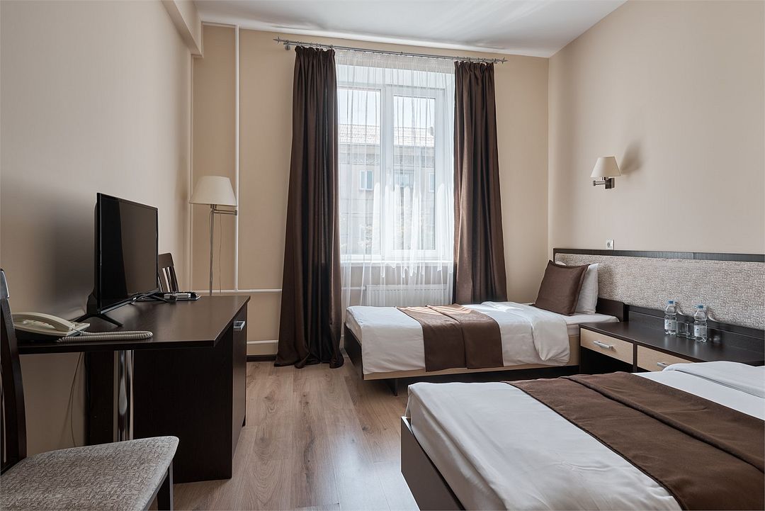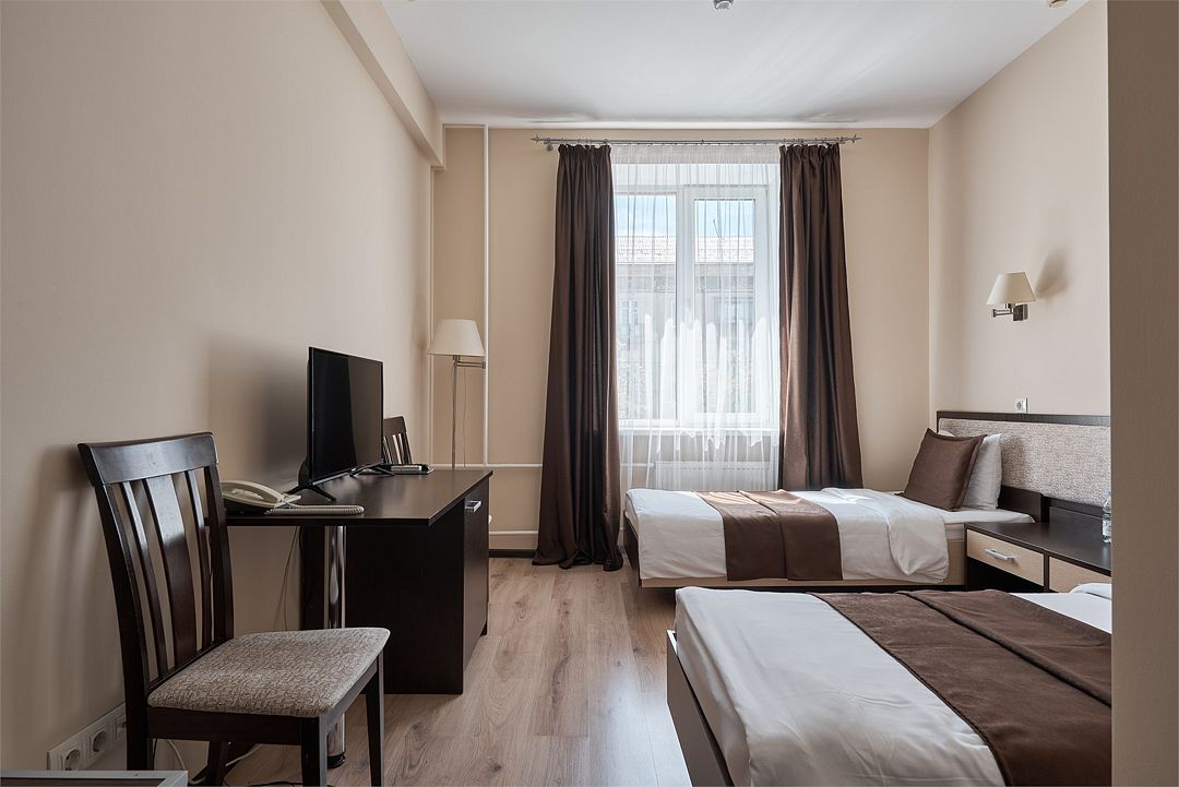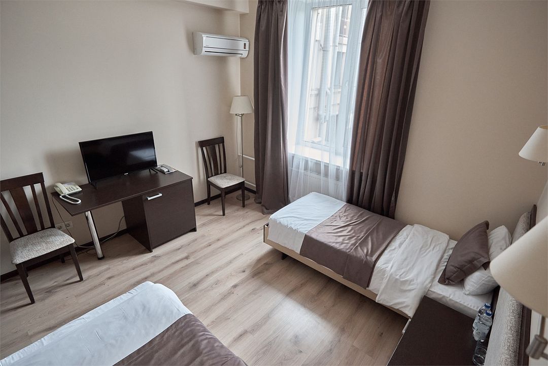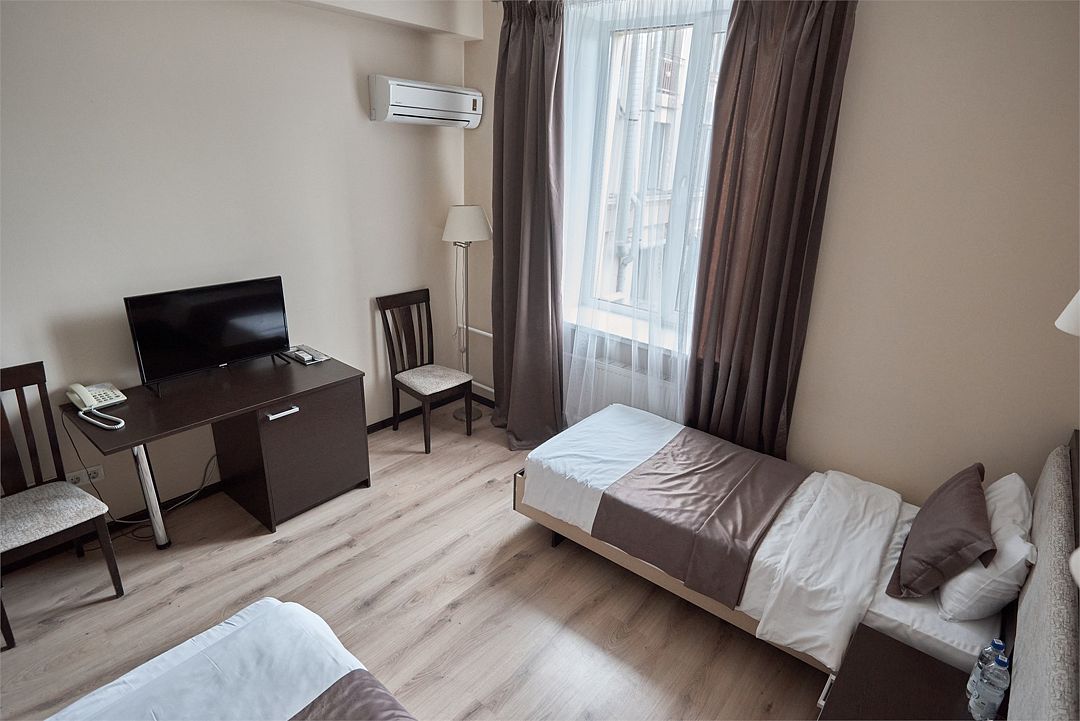 телевизор, кабельное телевидение, Wi-Fi, интернет, кондиционер, светильник, кулер, фен, система безопасности, электронные замки, душевая кабина, санузел, банные принадлежности, банные полотенца, тапочки, гигиенические средства, косметические средства, две односпальные кровати, тумбы, стулья, шкаф для одежды, письменный стол, багажная тумба, зеркало, обслуживание номеров, информационная карта, меню, сейф, унитаз, раковина, питьевая вода, отопление, душ, вид на город, кулер на этаже, вид во двор, ламинат, стаканы, туалетные средства, внутренний телефон, телевизор с плоским экраном, мини-холодильник, номер для некурящих, уборка номера, услуги прачечной (платно), вешалки-плечики, шапочка для душа, мыло, зеркало в полный рост, прачечная (за дополнительную плату), онлайн-регистрацияВ гостиничном номере