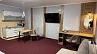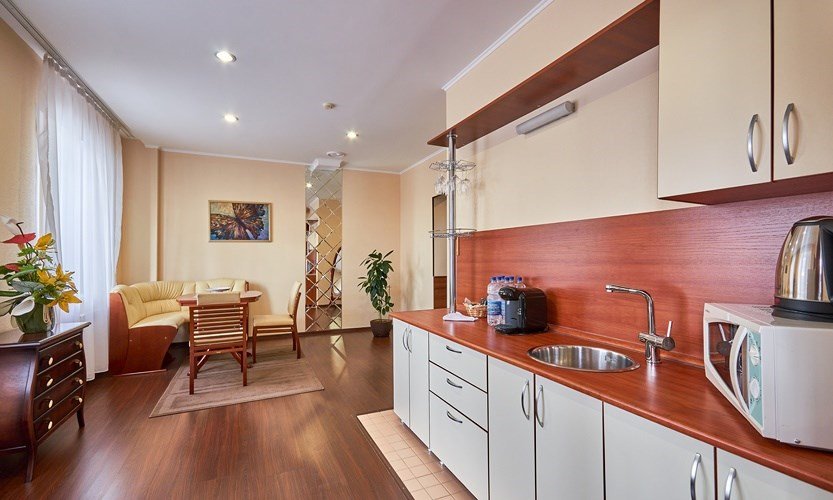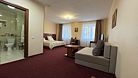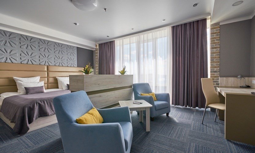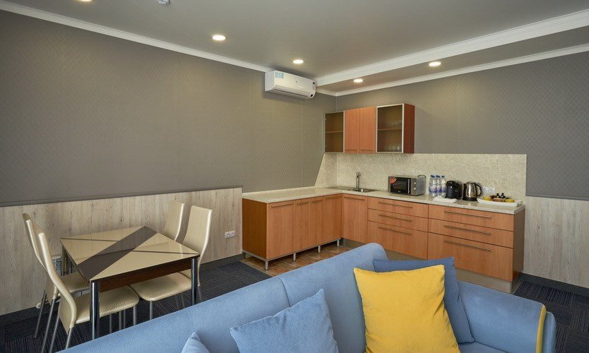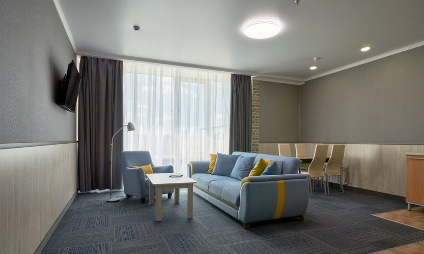 Номер оснащен всеми необходимыми деталями для полноценного и комфортного отдыха как семейных пар с детьми, так и небольшой компании друзей. Современный семейный номер с двумя изолированными комнатами: гостиной, совмещенной с кухонной зоной и спальней. Обустройство номера предполагает размещение двух взрослых и одного/двух детей. «Семейный делюкс» — идеальный выбор, если вы едете в командировку в Магнитогорск с семьей и Вам важно не расставаться с близкими.Услуги и удобства