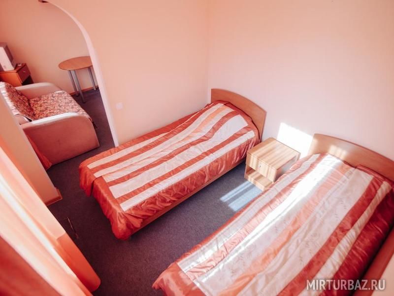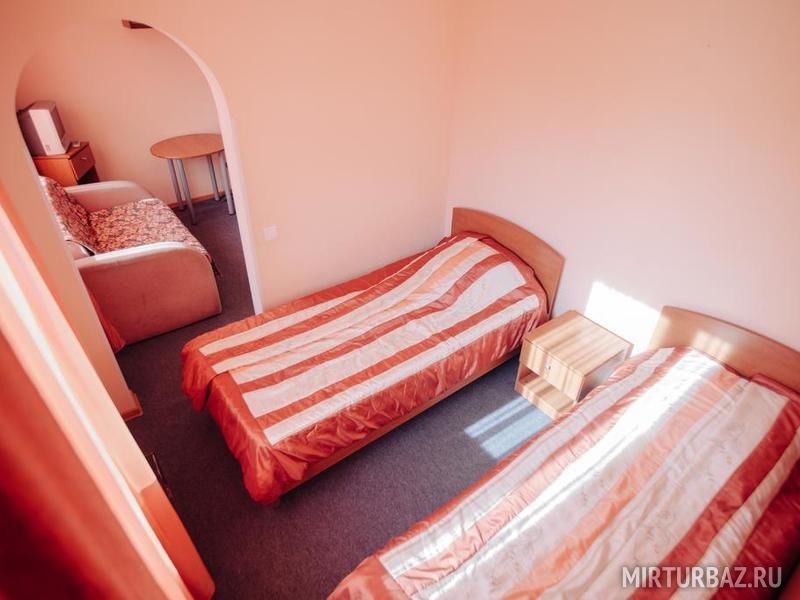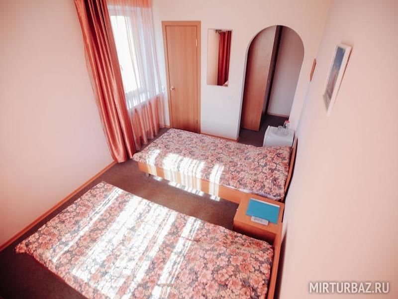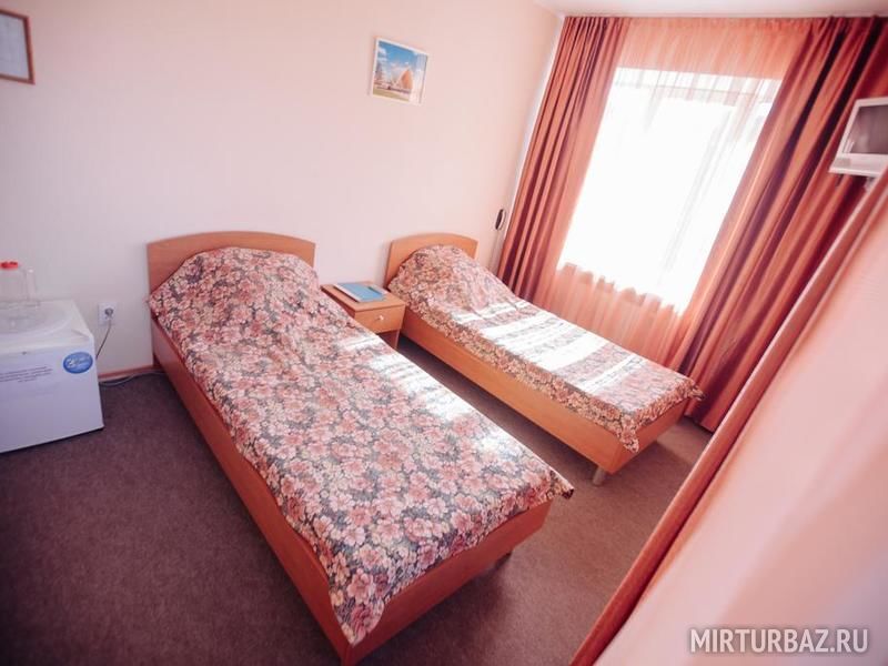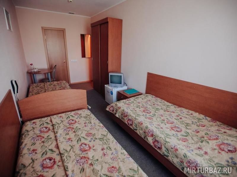 В номере: две односпальные кровати, стол, прикроватные тумбочки, вешалка, телефон, зеркало, телевизор, посуда, холодильник.