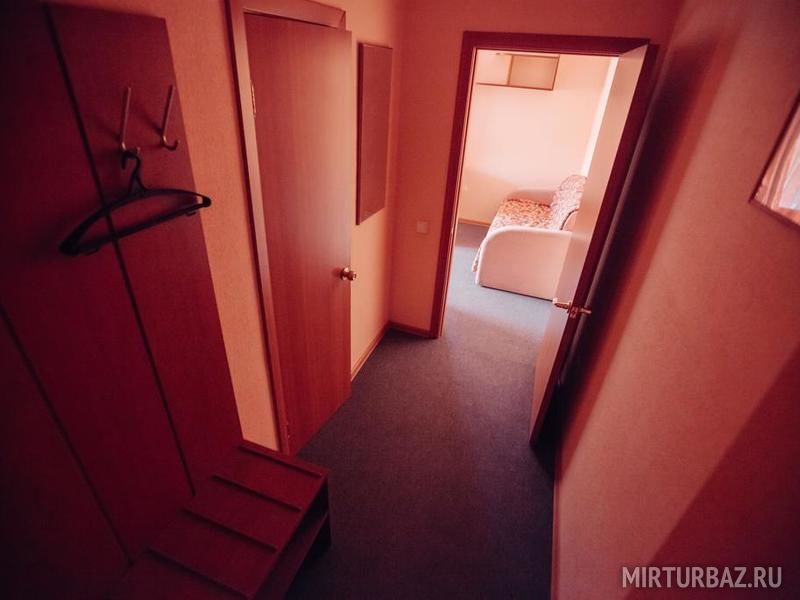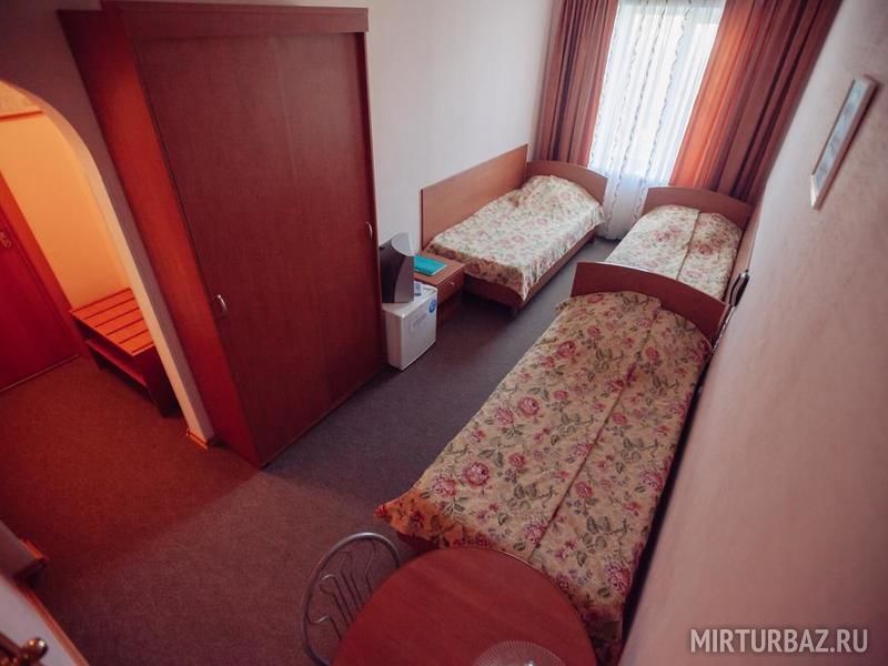 В номере: три односпальные кровати и диван-кровать, стол, стулья, прикроватные тумбочки, вешалка, телефон, зеркало, тумбочка, телевизор, посуда, холодильник.