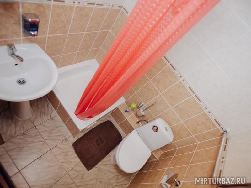 В ванной: туалет, раковина, душ, средства личной гигиены, зеркало, набор полотенец.