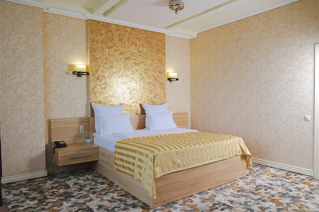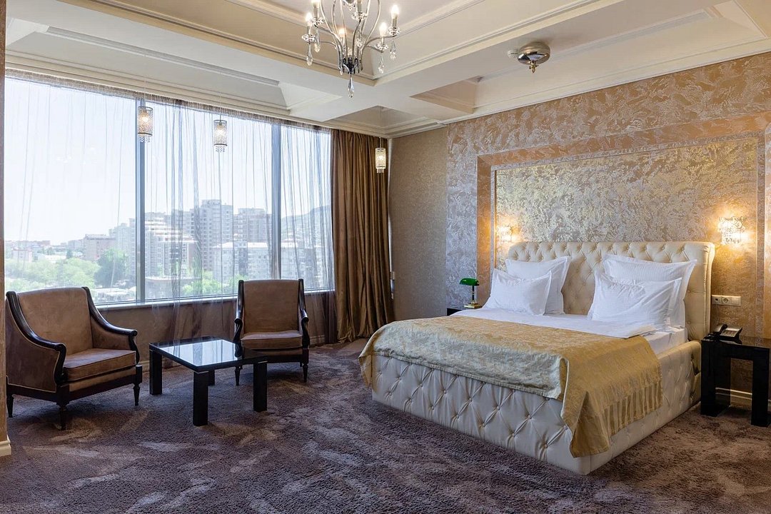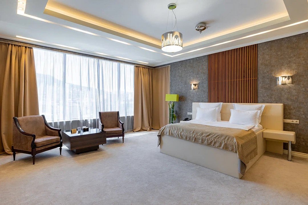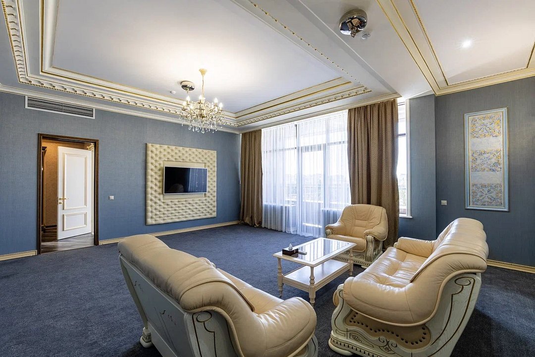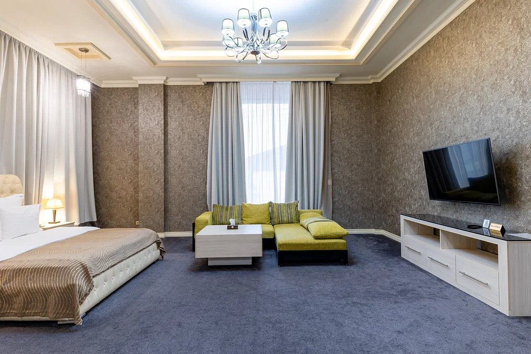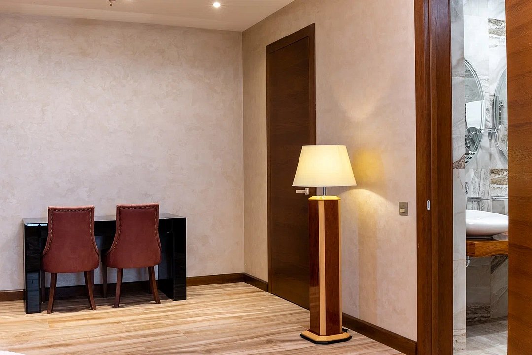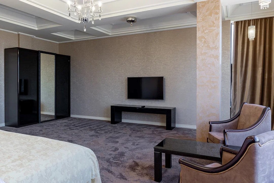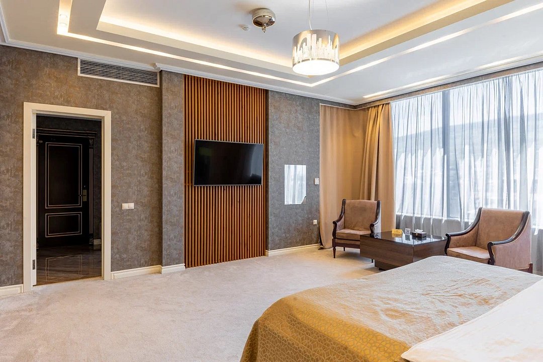 Просторный и элегантный номер, оформленный в классическом стиле, создает атмосферу утонченного комфорта. Здесь вас ждет все необходимое для незабываемого отдыха. Площадь номера составляет 85 кв.м. В спальне имеется большая двуспальная кровать с комфортным ортопедическим матрасом, мягкими подушками и одеялом высокого качества. Гости могут насладиться прекрасным видом из окна, откуда открывается панорама на городской пейзаж. Вторая комната оборудована просторным диваном и креслами, современными элементами интерьера, а также телевизором и журнальным столом. Для удобства гостей в номере имеется современный телевизор с плоским экраном и кабельными каналами, мини-бар, кондиционер, бесплатный Wi-Fi интернет, гостиные и рабочие зоны, а также отдельная ванная комната с ванной, феном, туалетными принадлежностями и мягкими полотенцами. Гостям также доступны дополнительные услуги, такие как обслуживание номеров, завтрак в номер, услуги прачечной и химчистки, трансфер, бронирование экскурсий и многое другое. Номер в нашем отеле - идеальный выбор для тех, кто ценит комфорт, уют и отличный сервис во время путешествия или командировкиУслуги и удобства