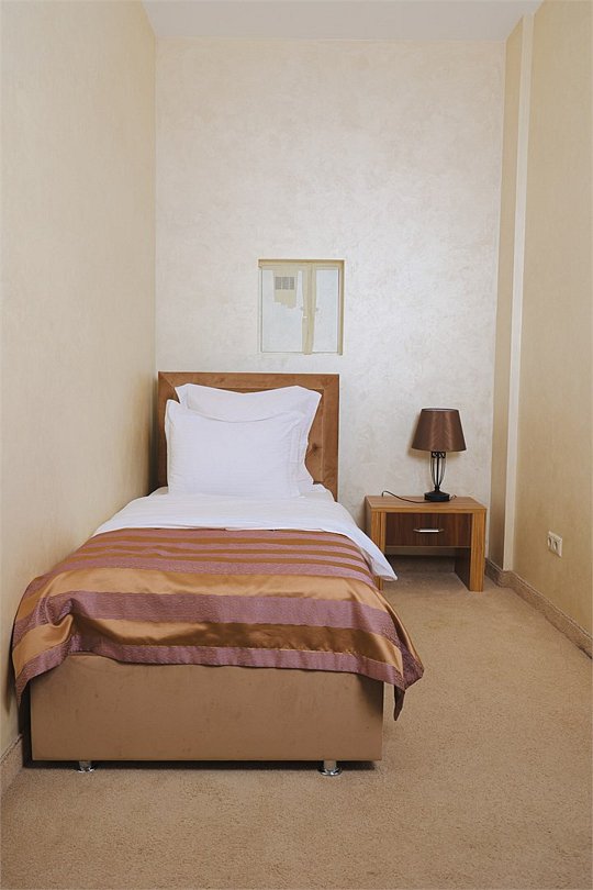 Трехместный номер стандарт– это комфортный номер с тремя спальными местами: с двуспальной кроватью и односпальной кроватью. В некоторых номерах есть балкон, в некоторых закрытая лоджия. Напольное покрытие – ковролин. В номере имеется холодильник, телевизор, кондиционер сплит-система, фен, шкаф для одежды, прикроватные тумбочки, журнальный столик, электрочайник, стаканы. В номере собственный санузел, в котором есть душ. Номера комплектуются набором полотенец на каждого гостя (банное, лицевое и полотенце для ног). В ванной комнате есть косметические принадлежности: мыло, шампунь, гель для душа. В номере без предоставления дополнительного места и без дополнительной оплаты может проживать один ребенок в возрасте до 3 лет.Услуги и удобства
