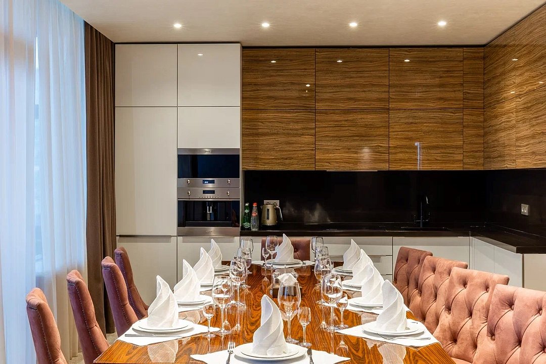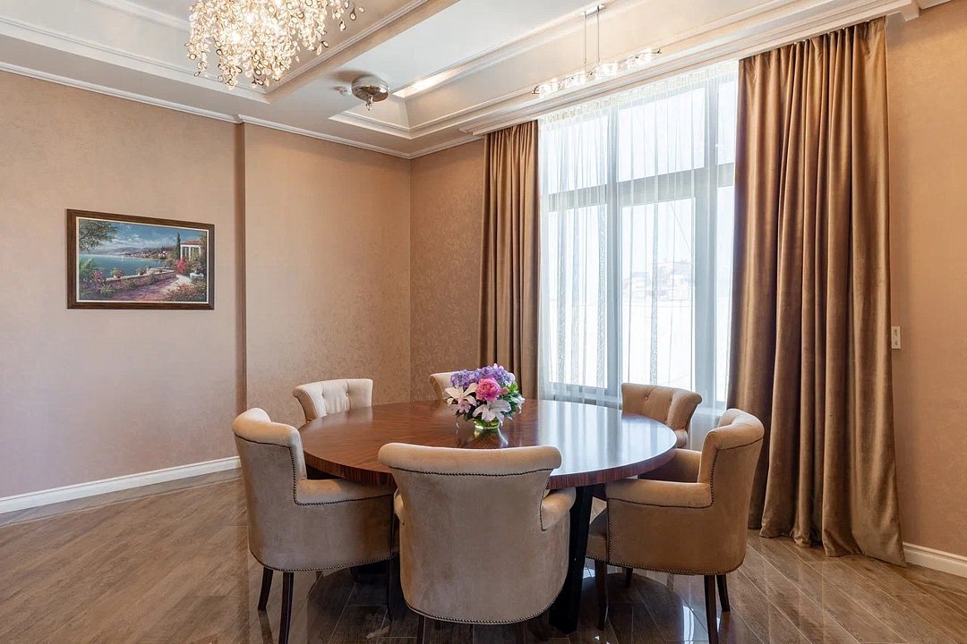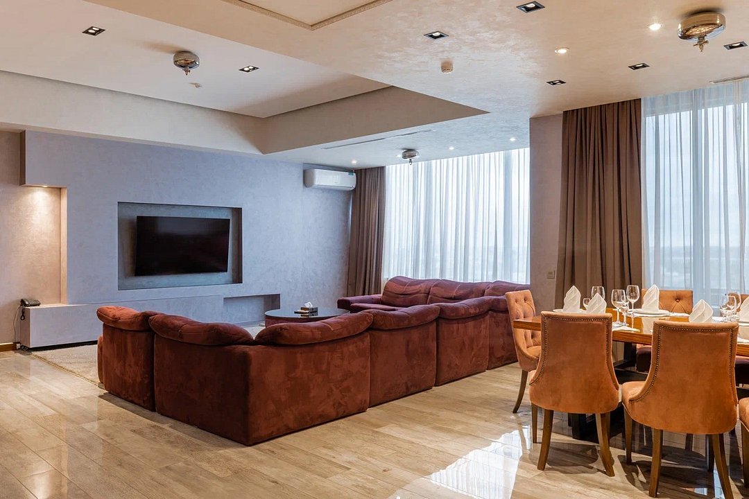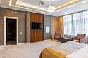 Президентский VIP площадью 200 кв.м – это воплощение роскоши, комфорта и безупречного сервиса. Просторные интерьеры, оформленные в элегантном современном стиле с элементами классики, создают атмосферу утонченной изысканности. Здесь каждая деталь продумана до мелочей, чтобы обеспечить вам поистине королевский уровень проживания. Гостей встречает просторная гостиная зона с панорамными окнами, открывающими великолепный вид на город. Мягкая мебель премиум-класса и изысканные предметы декора создают уютную атмосферу для отдыха и приема гостей. Отдельный кабинет с рабочей зоной и высокоскоростным интернетом позволит совместить деловые встречи с комфортным пребыванием. Для ценителей приватного отдыха в люксе предусмотрена собственная СПА-зона с финской сауной, просторным джакузи на несколько персон и профессиональной массажной комнатой. После релаксации вы сможете насладиться кулинарными шедеврами, приготовленными на полностью оборудованной кухне с техникой премиум-класса. Две просторные спальни с кроватями king-size и гипоаллергенным постельным бельем обеспечат поистине королевский сон. Каждая из них имеет отдельную гардеробную и ванную комнату с дизайнерской сантехникой. Особого внимания заслуживает просторная терраса с зоной отдыха, где можно насладиться утренним кофе или вечерними коктейлями под звуки города. Президентский люкс предлагает полный спектр VIP-услуг: от персонального дворецкого до эксклюзивного спа-меню. Это пространство создано для тех, кто ценит безупречный комфорт, приватность и высочайший уровень сервиса.Услуги и удобства