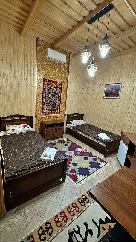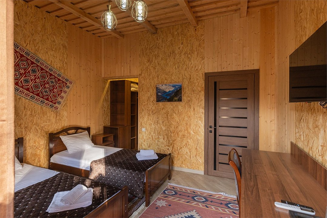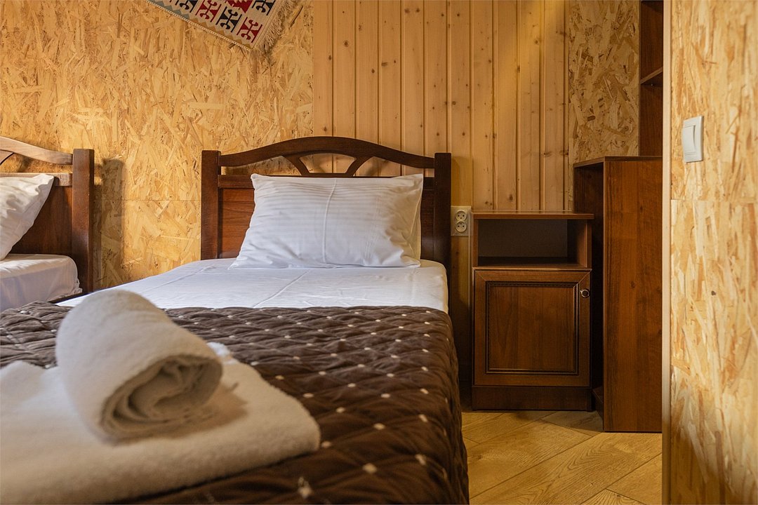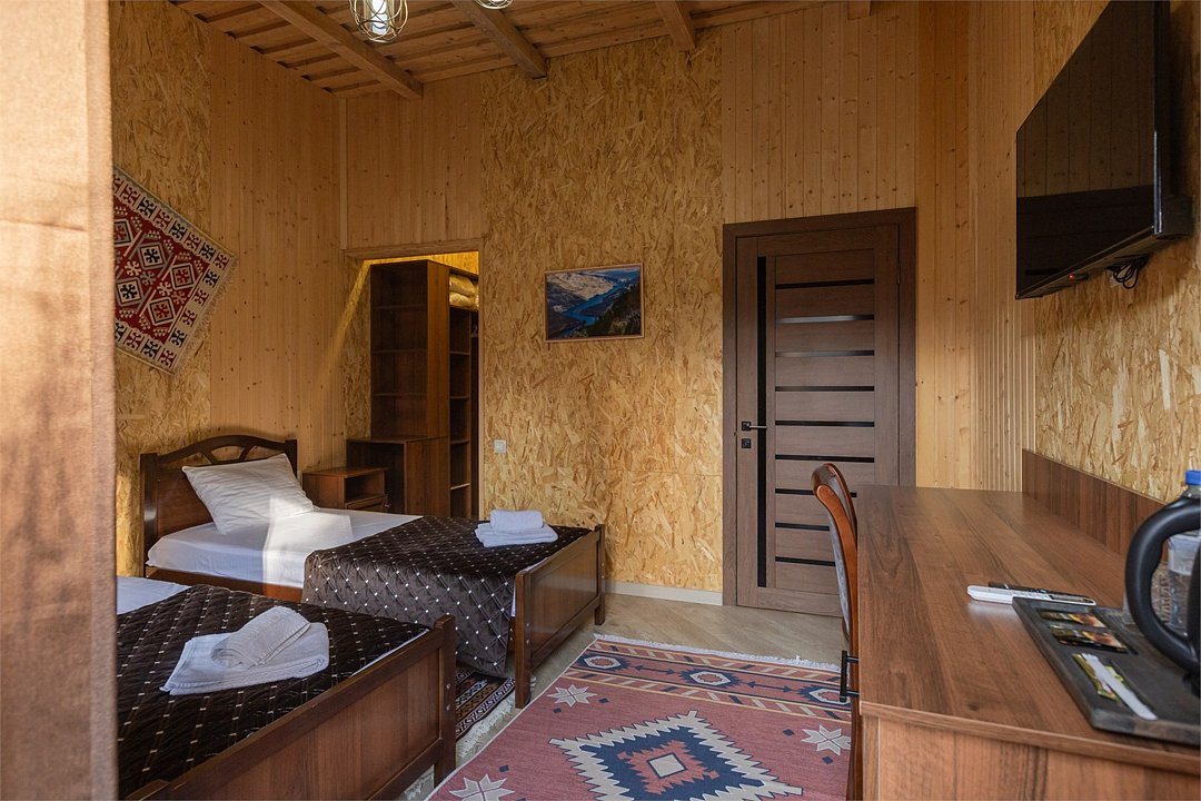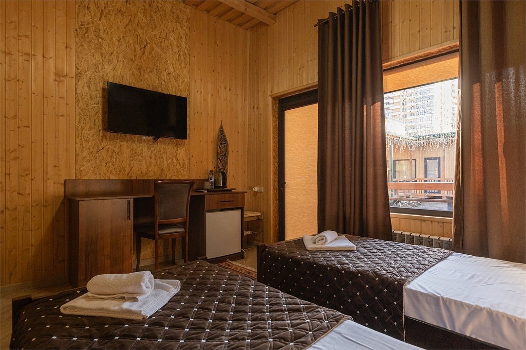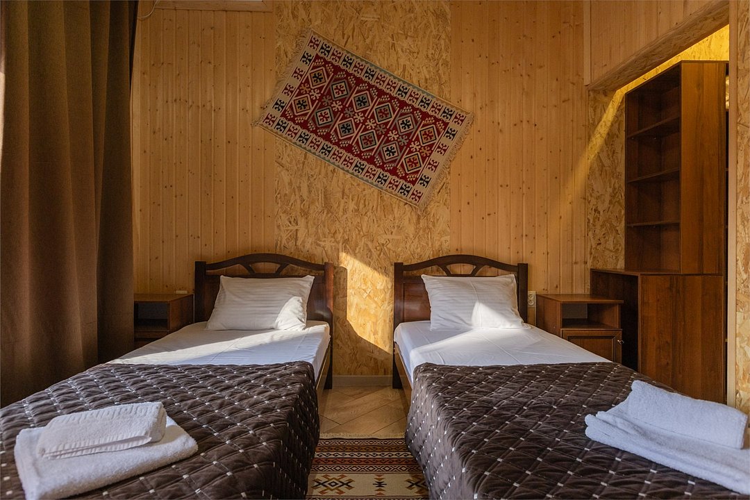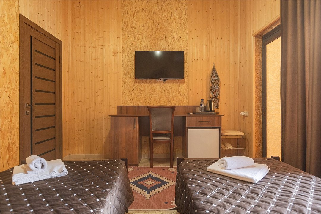 Уютный двухместный номер эконом-класса в этническом стиле, выполненный из дерева, располагает двумя раздельными кроватями. Здесь есть все необходимое для комфортного отдыха: тапочки, чайник, полотенца и ванная комната.Услуги и удобства