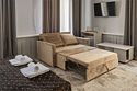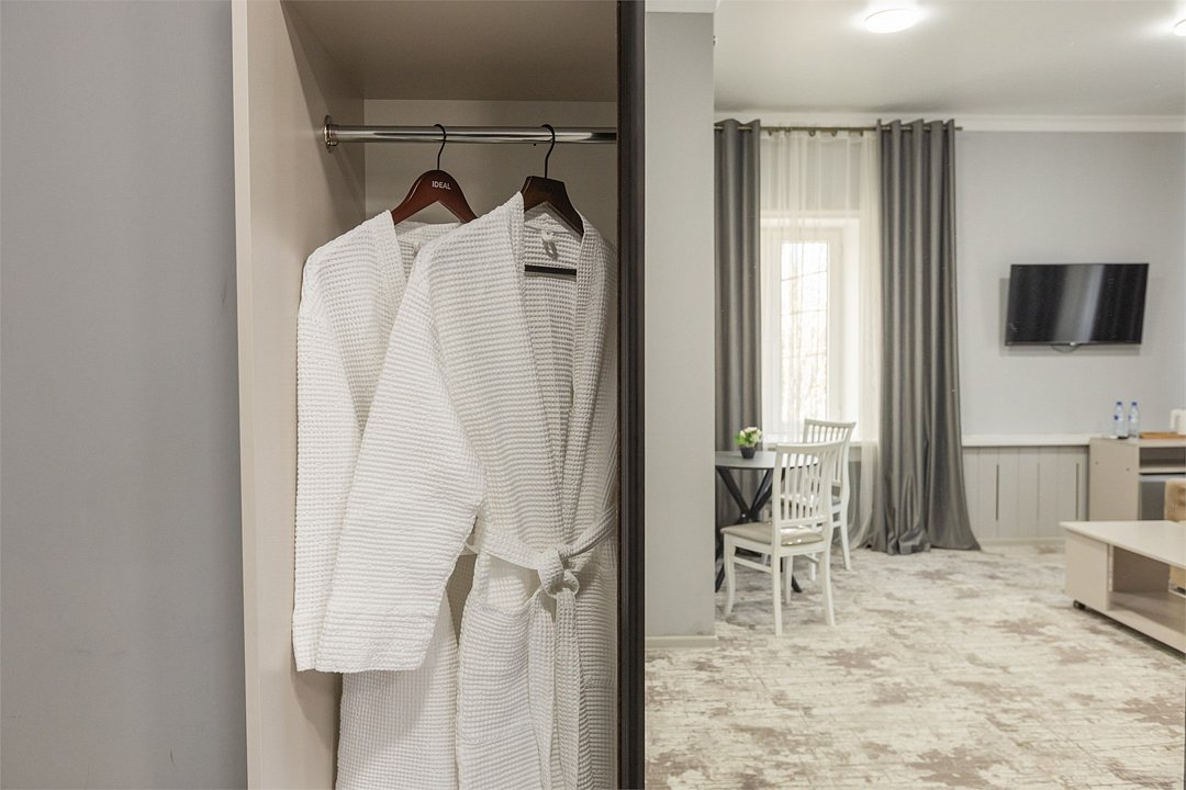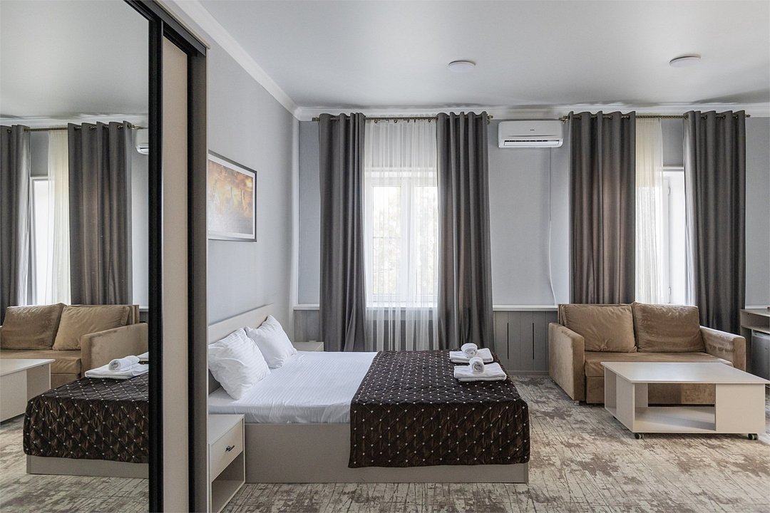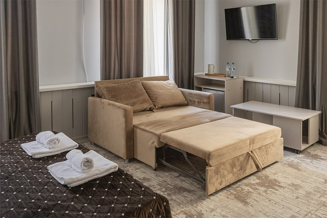 Wi-Fi, холодильник, фен, ванна, халаты, тапочки, гигиенические средства, две односпальные или большая двуспальная кровать, диван, тумбы, шкаф для одежды, вешалки, журнальный столик, обеденный стол, чайный набор, отопление, душ, вид на город, стул, вид на парк, мини-холодильник, шкаф-купе, частичный вид на море, телевизор со Smart TV, уборка номера, услуги прачечной (платно), вешалки-плечики, бутилированная вода, затемняющая штора, зеркало в полный ростВ номере