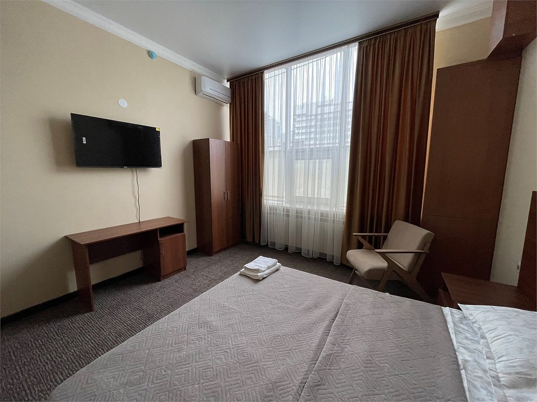 телевизор, Wi-Fi, холодильник, кондиционер, светильник, фен, плита для приготовления пищи, утюг, ванная комната, ванна, санузел, банные принадлежности, банные полотенца, тапочки, гигиенические средства, двуспальная кровать, диван, кресла, тумбы, стулья, шкаф для одежды, вешалки, обеденный стол, зеркало, унитаз, раковина, вид на город, кресло, стул, стол, туалетные средства, диван-кровать, раскладной диван, раскладное кресло, телевизор со Smart TV, духовой шкаф, духовка, кресло-кроватьВ номере
