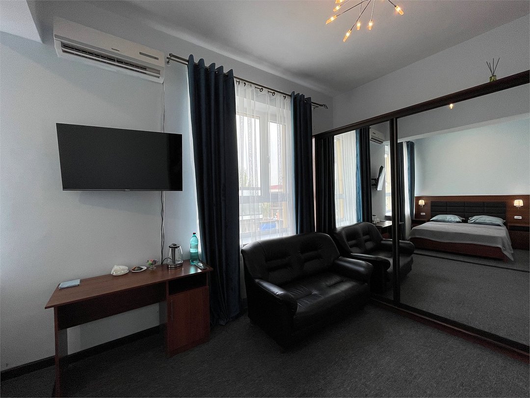 телевизор, Wi-Fi, кондиционер, светильник, фен, утюг, ванная комната, душевая кабина, ванна, ванна или душевая кабина, санузел, банные принадлежности, банные полотенца, тапочки, двуспальная кровать, односпальная кровать, диван, тумбы, стулья, шкаф для одежды, вешалки, журнальный столик, зеркало, унитаз, раковина, душ, вид на город, стул, стол, туалетные средства, туалет, диван-кровать, мини-холодильник, шкаф-купе, гостиничная парфюмерия, телевизор со Smart TV, гигиенический душ, туалетные принадлежности премиум-классаВ номере