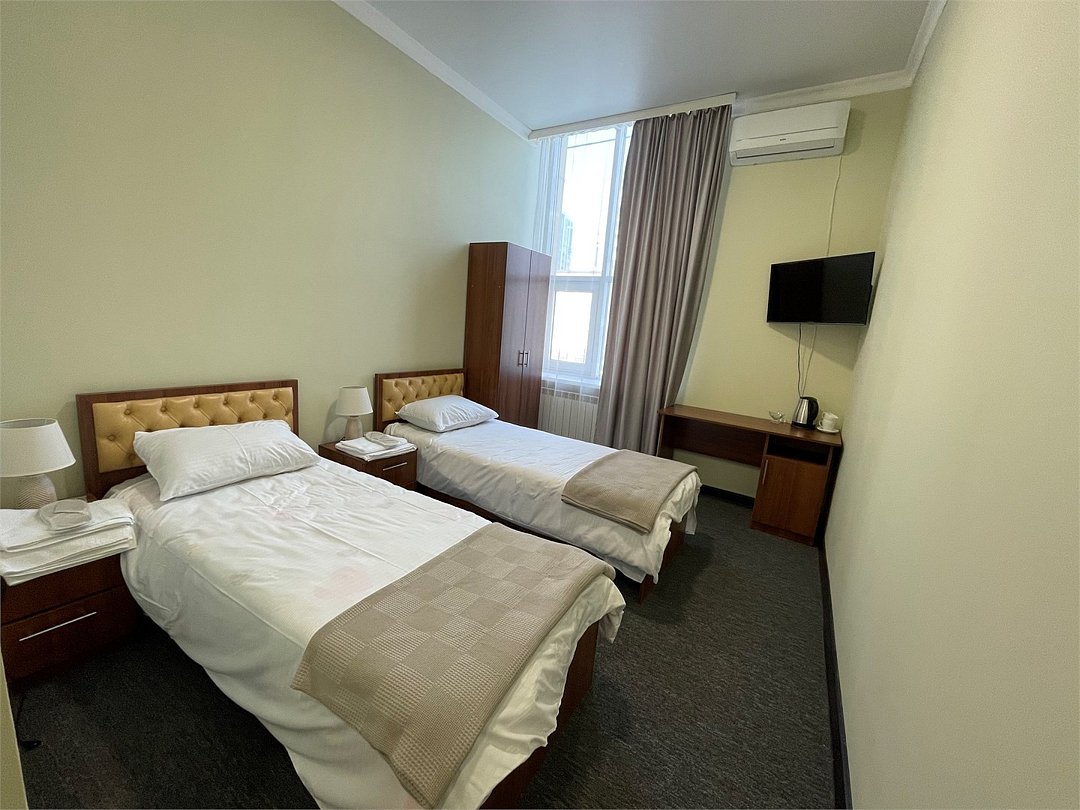 телевизор, Wi-Fi, кондиционер, фен, утюг, ванная комната, душевая кабина, ванна или душевая кабина, санузел, тапочки, две односпальные кровати, стулья, шкаф для одежды, вешалки, зеркало, унитаз, раковина, душ, вид на город, стул, стол, тумба, туалетные средства, туалет, мини-холодильник, телевизор со Smart TVВ номере