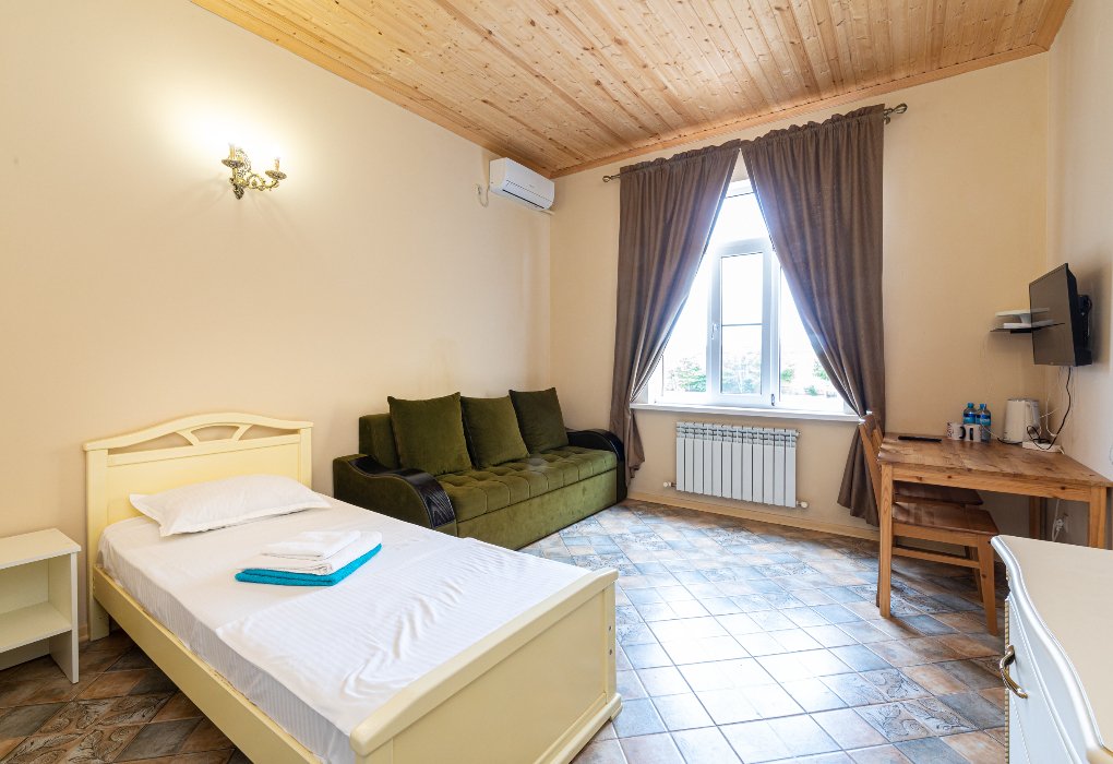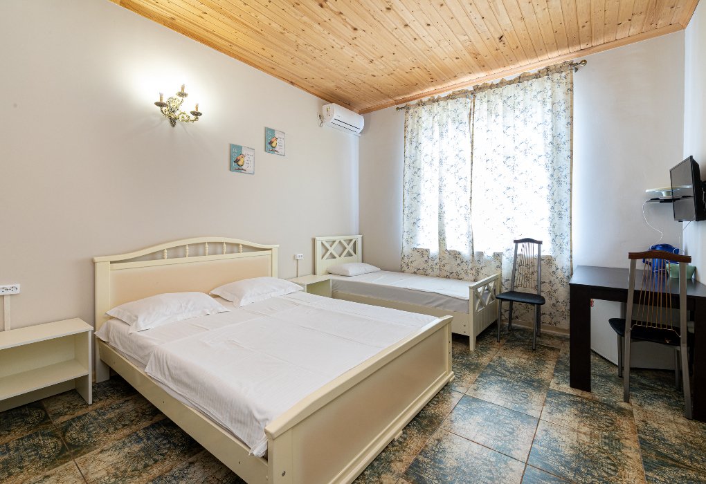 на выбор: односпальная кровать + двуспальная кровать или 3 односпальные кровати; вид во двор / на бассейн / боковой вид на мореУслуги и удобства