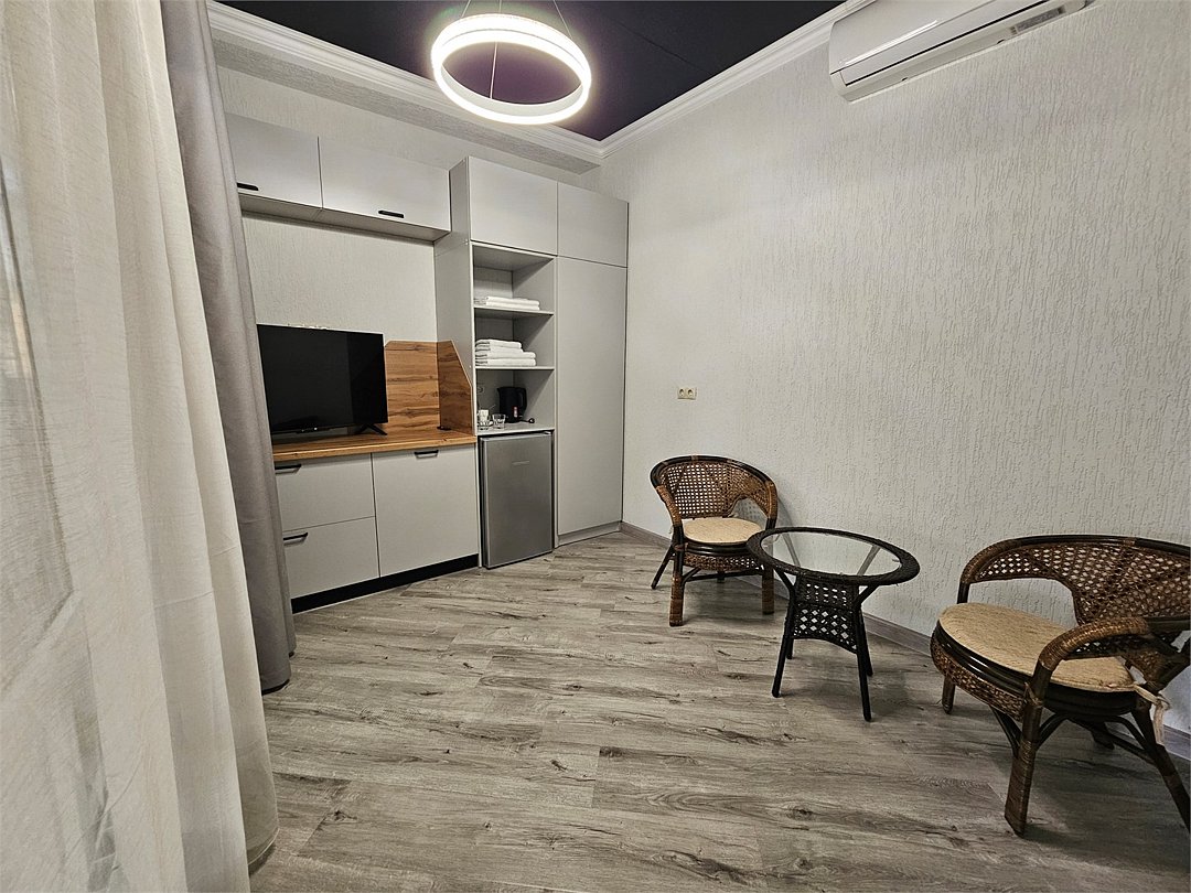 Wi-Fi, интернет, холодильник, кондиционер, фен, микроволновая печь, ванная комната, ванна, халаты, банные полотенца, тапочки, кровать «King size», ортопедический матрас, диван, кресла, шкаф для одежды, вешалки, журнальный столик, зеркало, комод, ковер, чайный набор, чайник, унитаз, раковина, мягкая мебель, отопление, вид на сад, вид во двор, стаканы, мини-холодильник, москитная сетка, угловой диван-кровать, уборка номера, услуги прачечной (платно), мыло, Android TVВ гостиничном номере