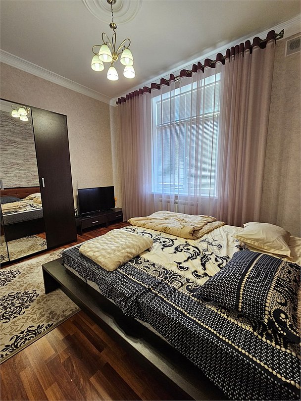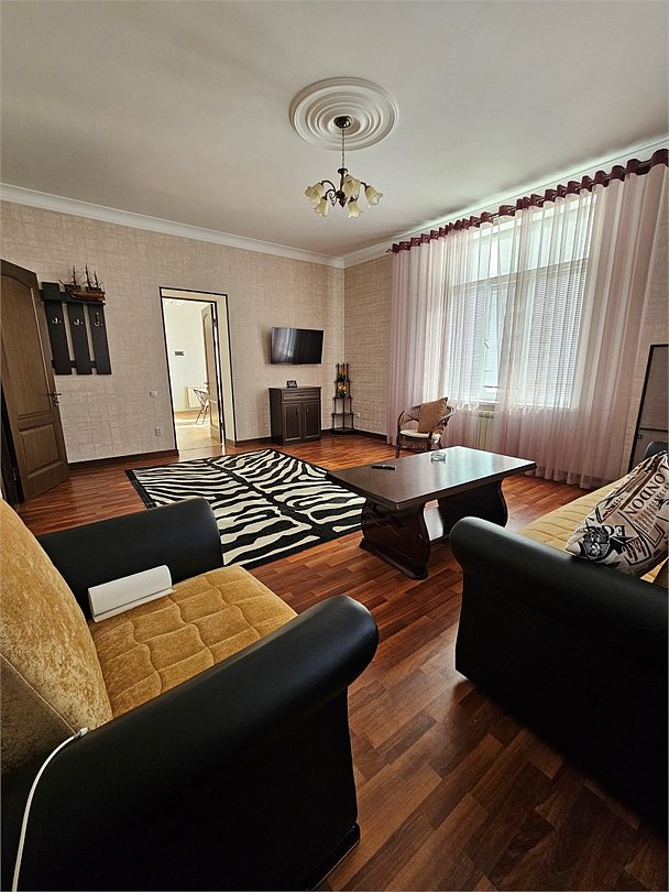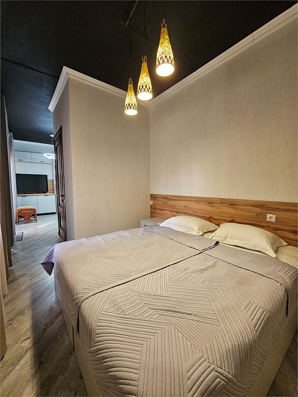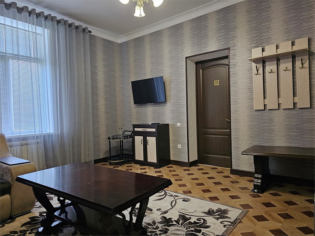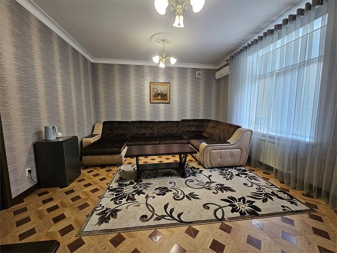 Уютный и комфортабельный двухкомнатный номер с двуспальной кроватью и раскладным диваном в гостиной для размещения от двух до четырех человек. В номере есть все, что может понадобиться для комфортного отдыха: • Удобная двуспальная кровать. • Прикроватные тумбочки. • Туалетный столик с зеркалом. • Тумба с телевизором (более 1 000 каналов). • Мягкая мебель с журнальным столиком. • Бесплатный Wi-Fi. • Холодильник. • Кондиционер. • Чайный набор (чайник, чашки). • Шкаф для одежды с вешалками. Санузел: • Ванна. • Унитаз. • Фен. • Коврик для ног. • Комплект туалетных принадлежностей: мыло, гель для душа. • Полотенца, халаты, тапочки.Услуги и удобства