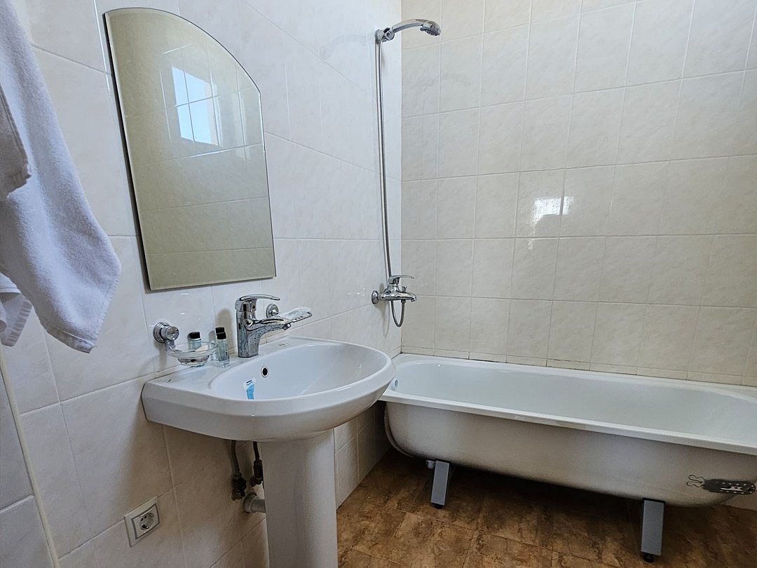 Уютный двухкомнатный номер с двумя односпальными кроватями для размещения от одного до двух человек. В номере есть все, что может понадобиться для комфортного отдыха: • Удобные кровати. • Прикроватные тумбочки. • Тумба с телевизором (более 1 000 каналов). • Мягкая мебель с журнальным столиком. • Бесплатный Wi-Fi. • Холодильник. • Кондиционер. • Чайный набор (чайник, чашки). • Шкаф для одежды с вешалками. Санузел: • Душ. • Унитаз. • Фен. • Комплект туалетных принадлежностей: мыло, гель для душа. • Полотенца, халаты, тапочки.Услуги и удобства