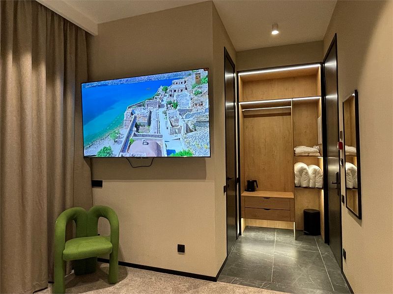 В номере двуспальная кровать, которая при необходимости трансформируется в 2 односпальные, телевизор, кондиционер, шкаф для одежды, санузел.