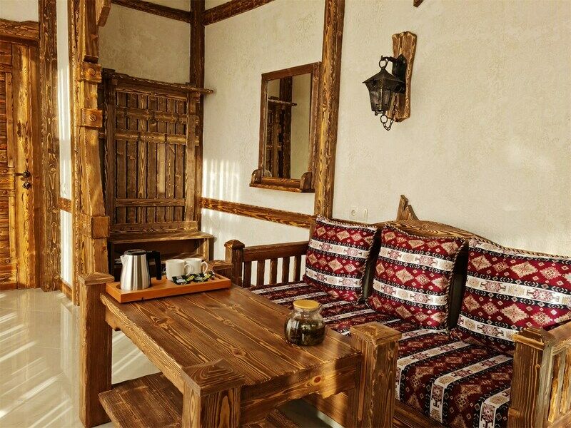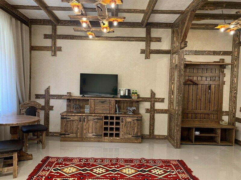 Номер Люкс состоящий из просторной гостиной и изолированной спальни. Здесь есть все для комфортного отдыха семьей или большой компанией — удобный диван, телевизор, круглый стол на 4 персоны набор посуды и чайная станция. В спальне туалетная комната. «Фишка» номера — панорамные окна с видом на Аликоновское ущелье. В стоимость номера входит аренда беседки у реки, где возможно устроить вечеринку с барбекю. Интересный вариант для молодоженов