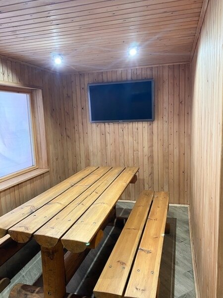 Для компании до 4 человек в мангальной зоне и спальными местами до 4 человек. Есть все необходимое: ТВ, обеденный стол. Кухня со всем необходимым. Прихожая со шкафом. Двуспальная и двухъярусная кровать. Мангал и стол для пикника на свежем воздухе.