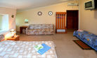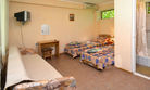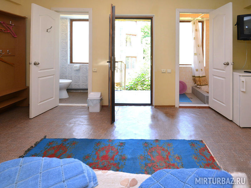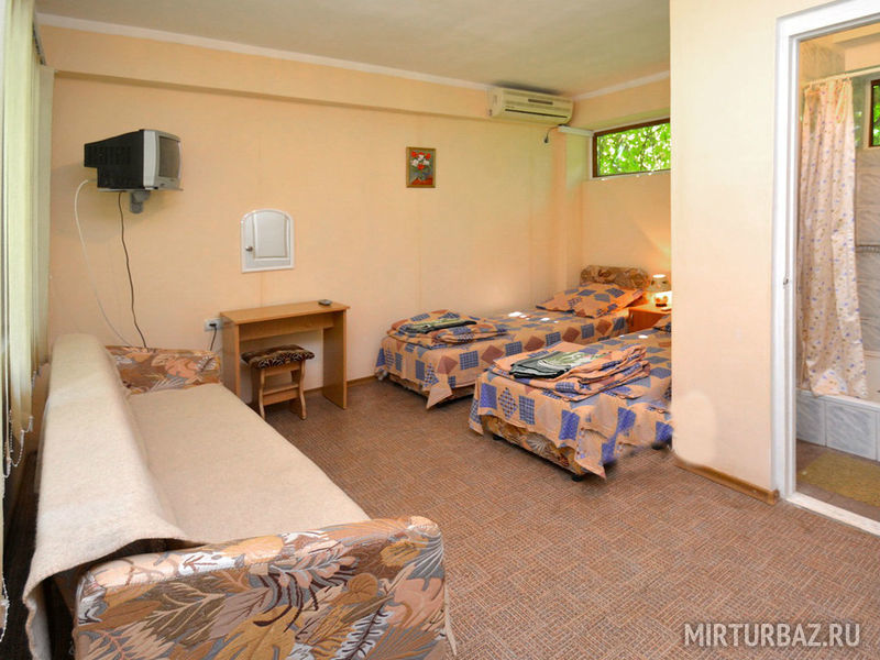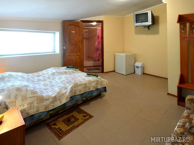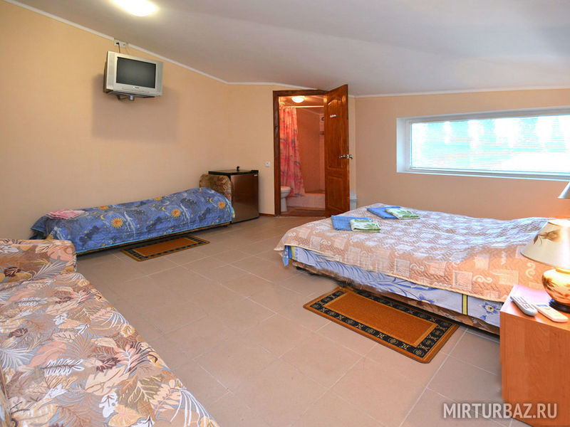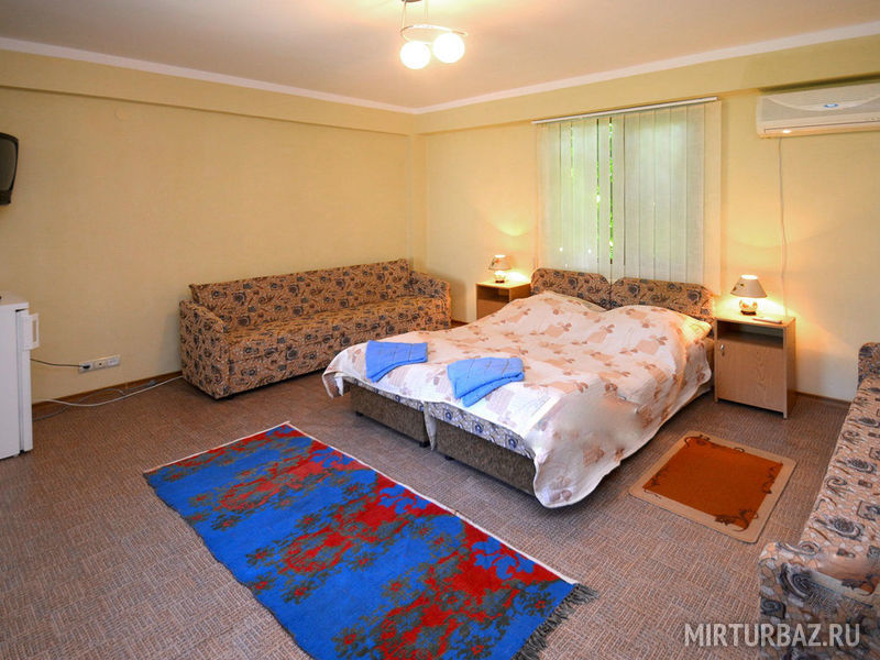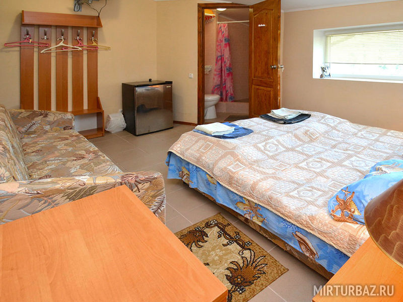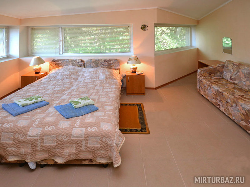 В номере 1 комната, двуспальная кровать, прикроватные тумбочки, два диван-кровати, вешалка для одежды, шкаф платяной, зеркало, санузел с душем. У номера есть маленький балкончик.