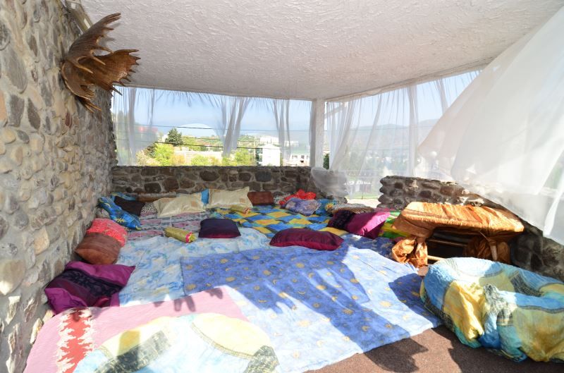 Этот уголок, скрытый от солнца навесом и нежным шифоном, обязательно понравится детям. Он оборудован разноцветными мягкими подстилками и подушками, которые одновременно создают уютную обстановку и могут поднять настроение каждому.