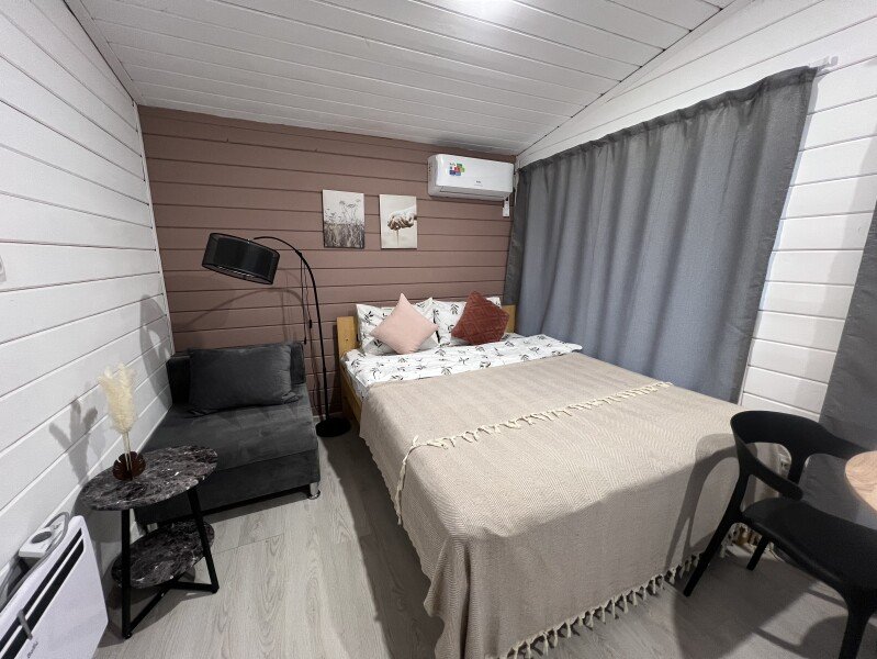 Каждый домик подготовлен для всесезонного проживания: внутри есть автономное отопление, кондиционеры, санузлы с душем, кухонная техника и приборы, комфортные кровати и теплые одеяла.