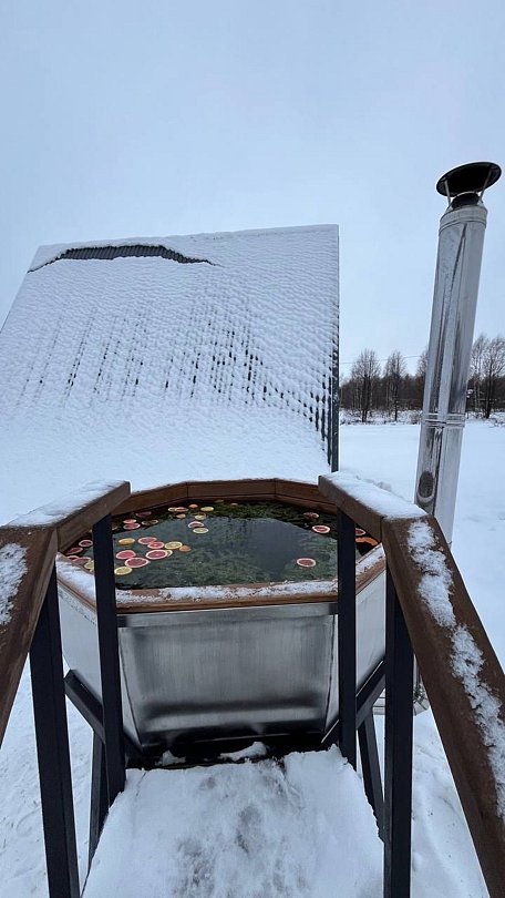Снимите напряжение в горячем банном чане под открытым небом. Свежий воздух, аромат пихты, природа.