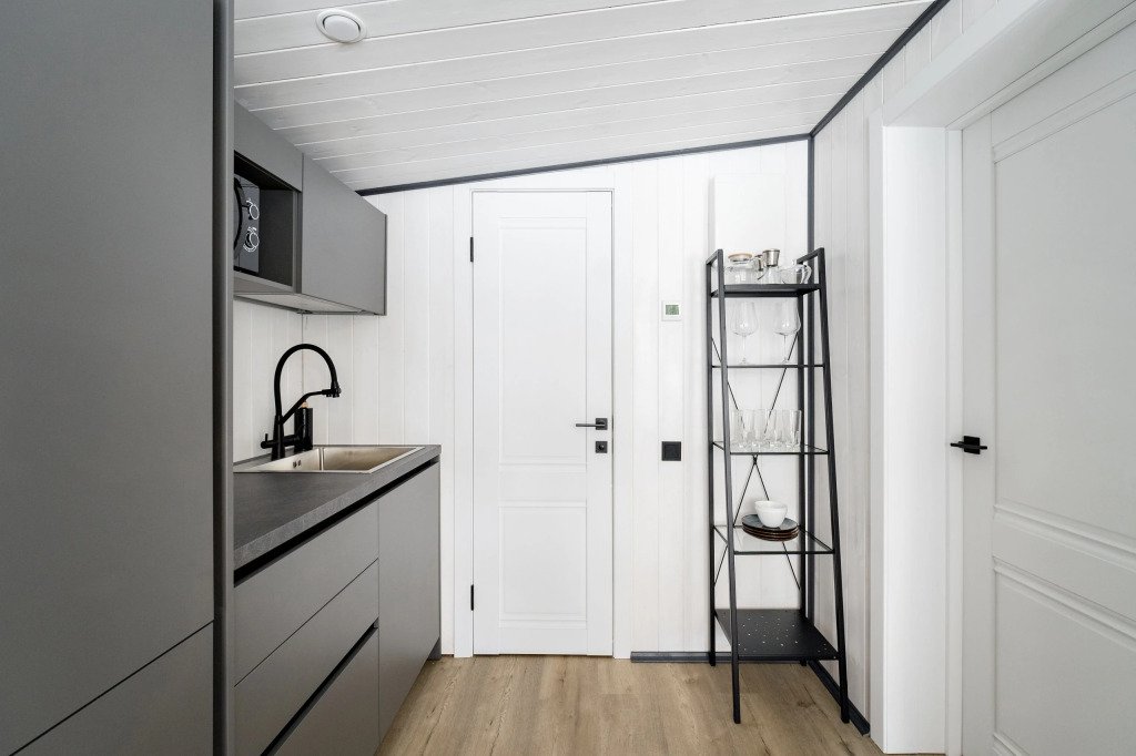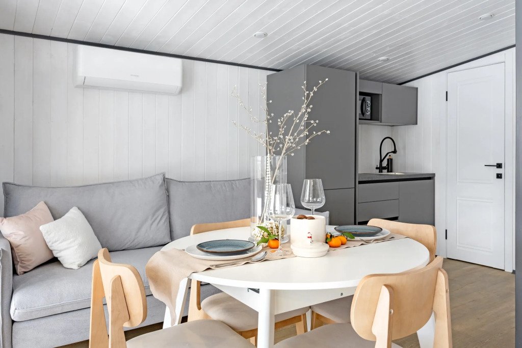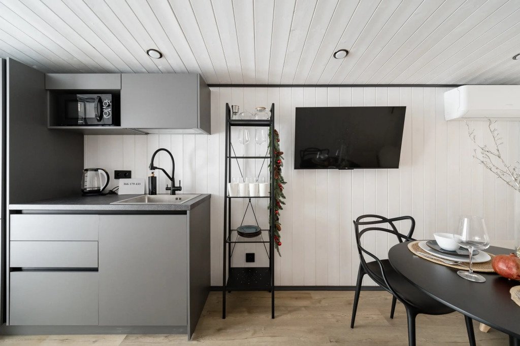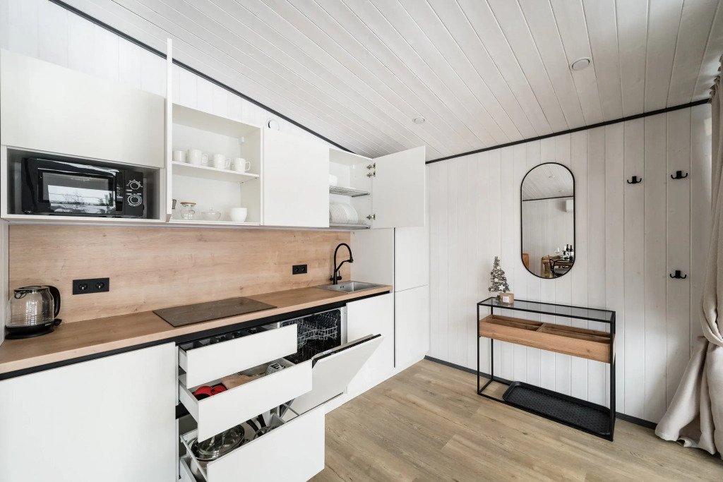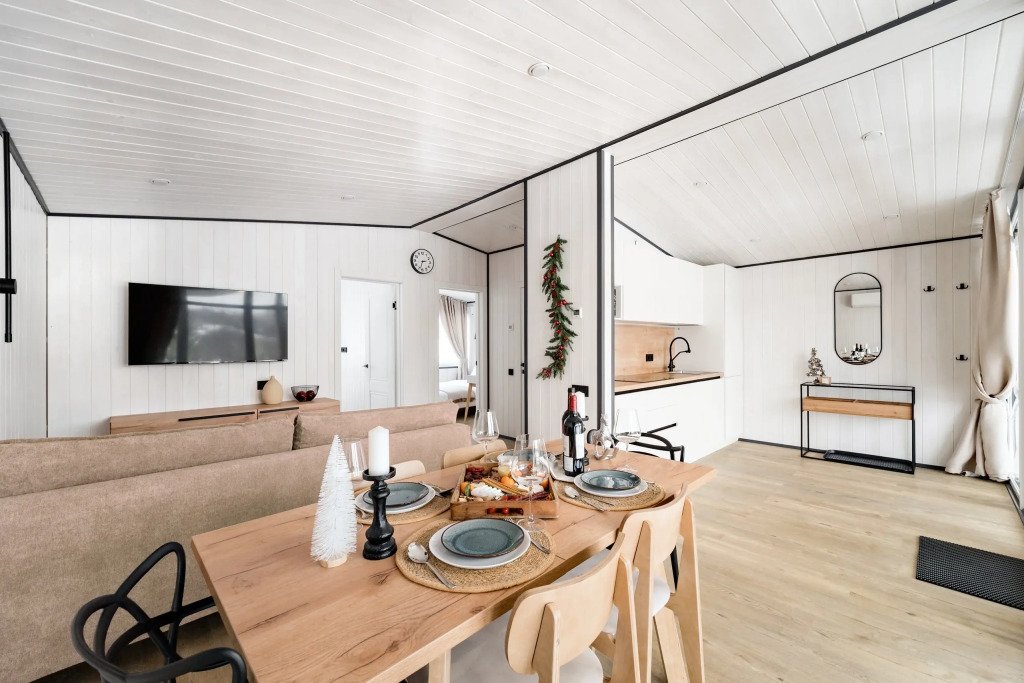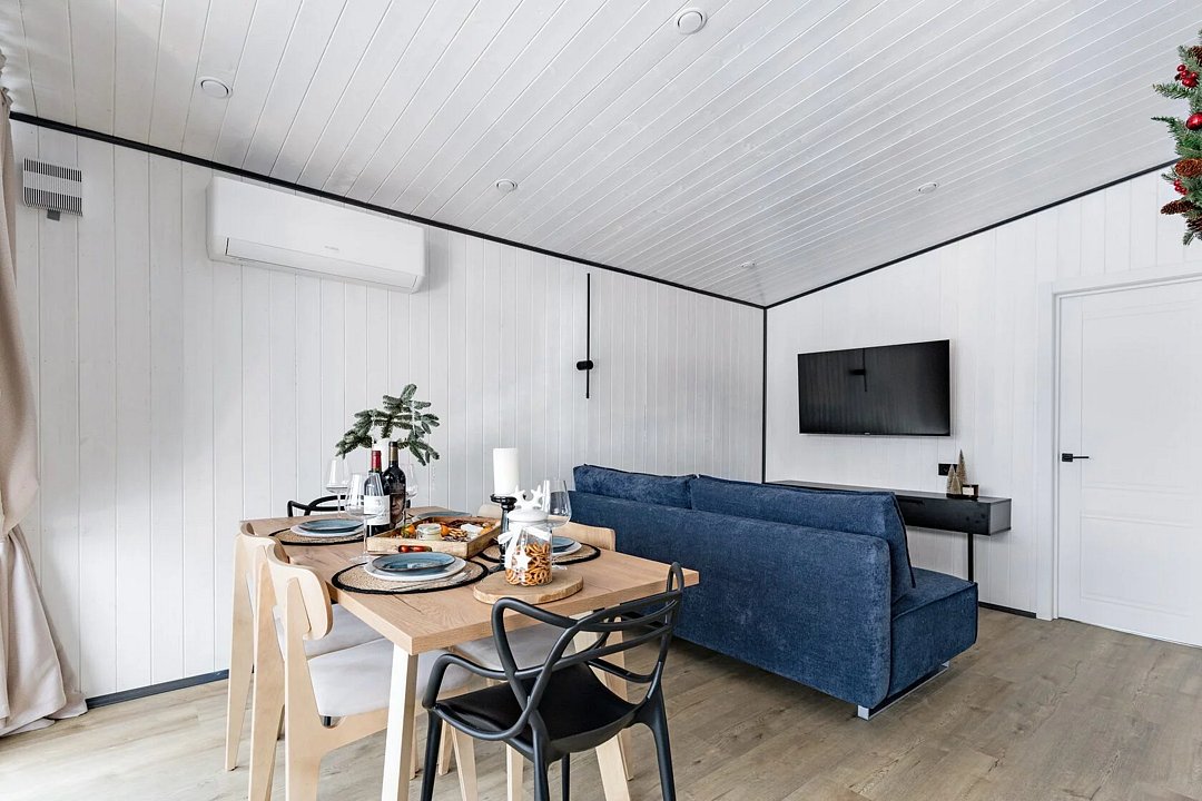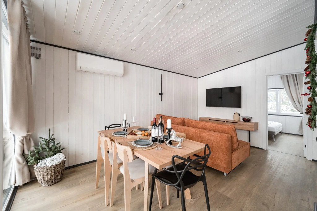 В каждом доме есть отдельная спальня, ванная комната с душевой кабиной, полотенцесушителем и феном, кухня с варочной панелью, вместительный холодильник, микроволновая печь и всё необходимое для приготовления пищи и сервировки стола. Также имеется телевизор со Smart TV, Wi-Fi до 100 Мбит/с, мангальная зона с навесом, решёткой и комплектом шампуров.