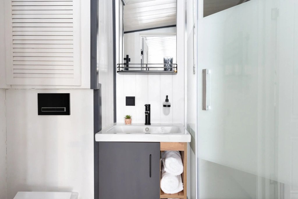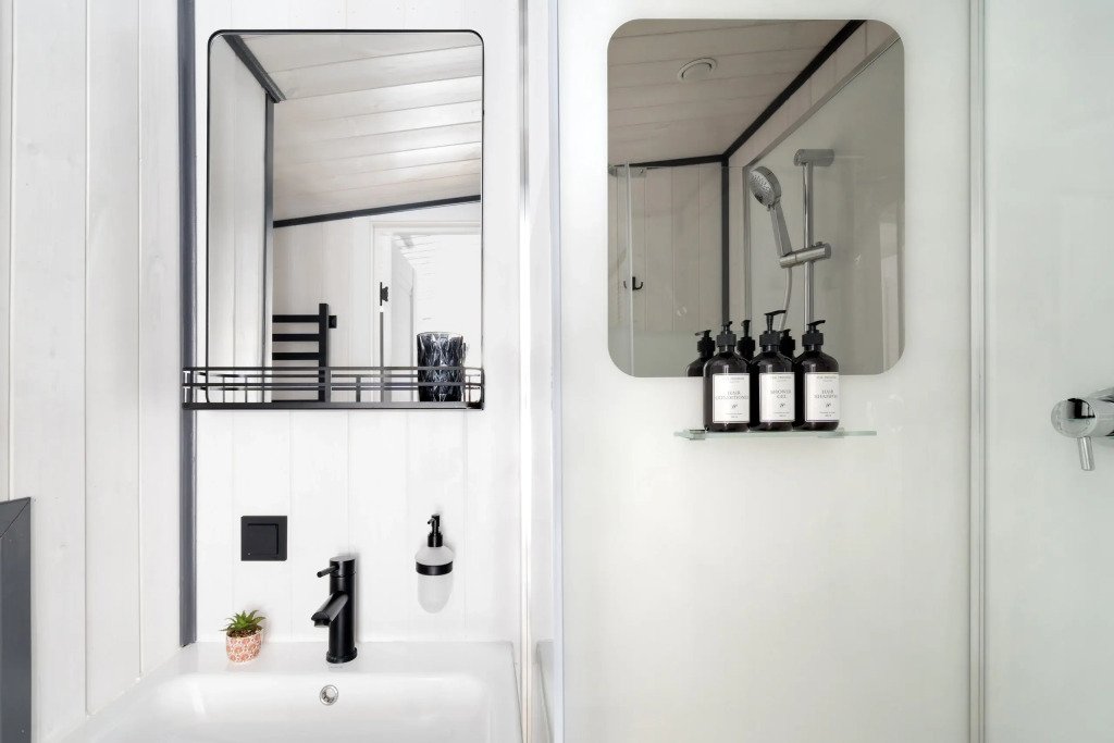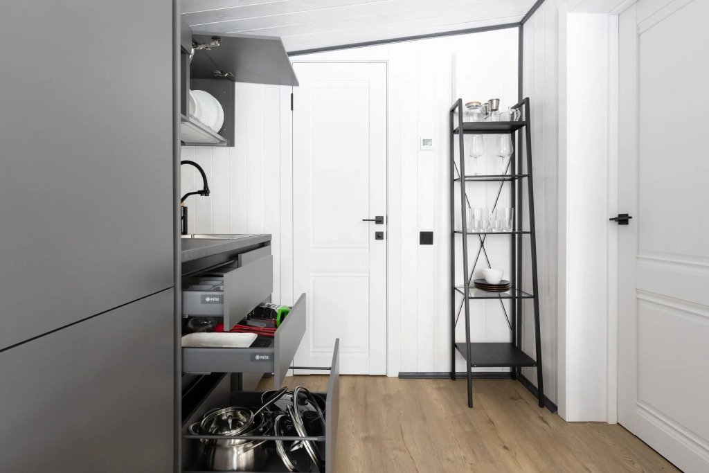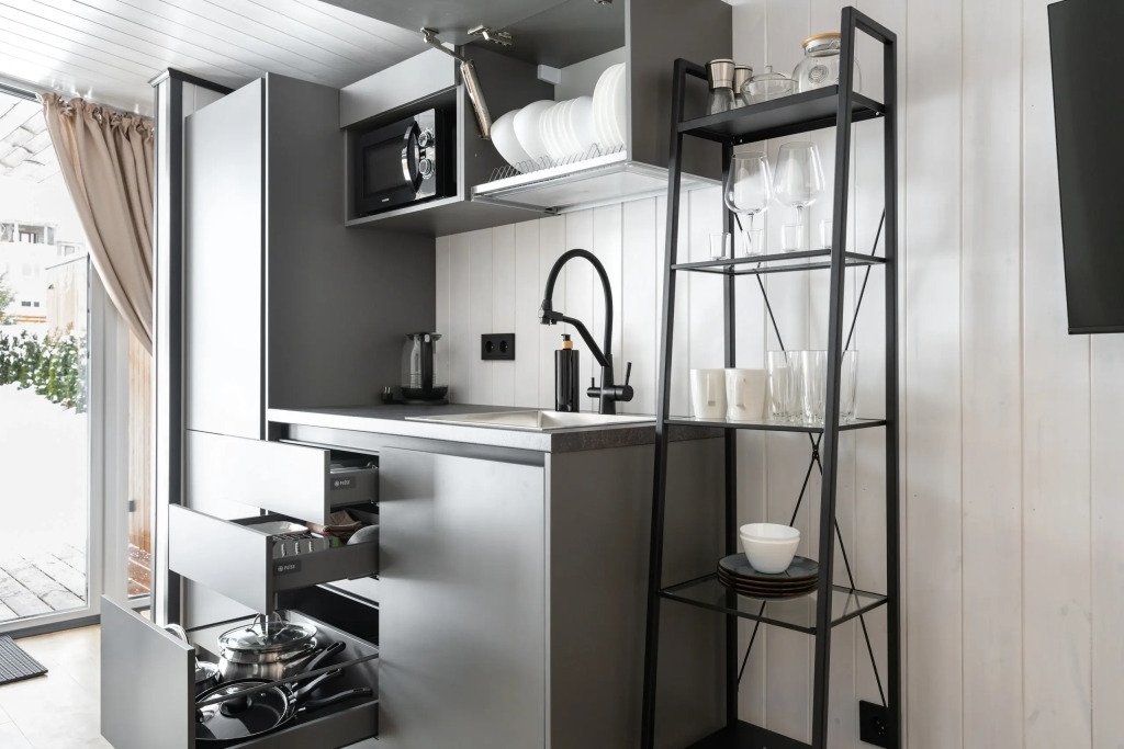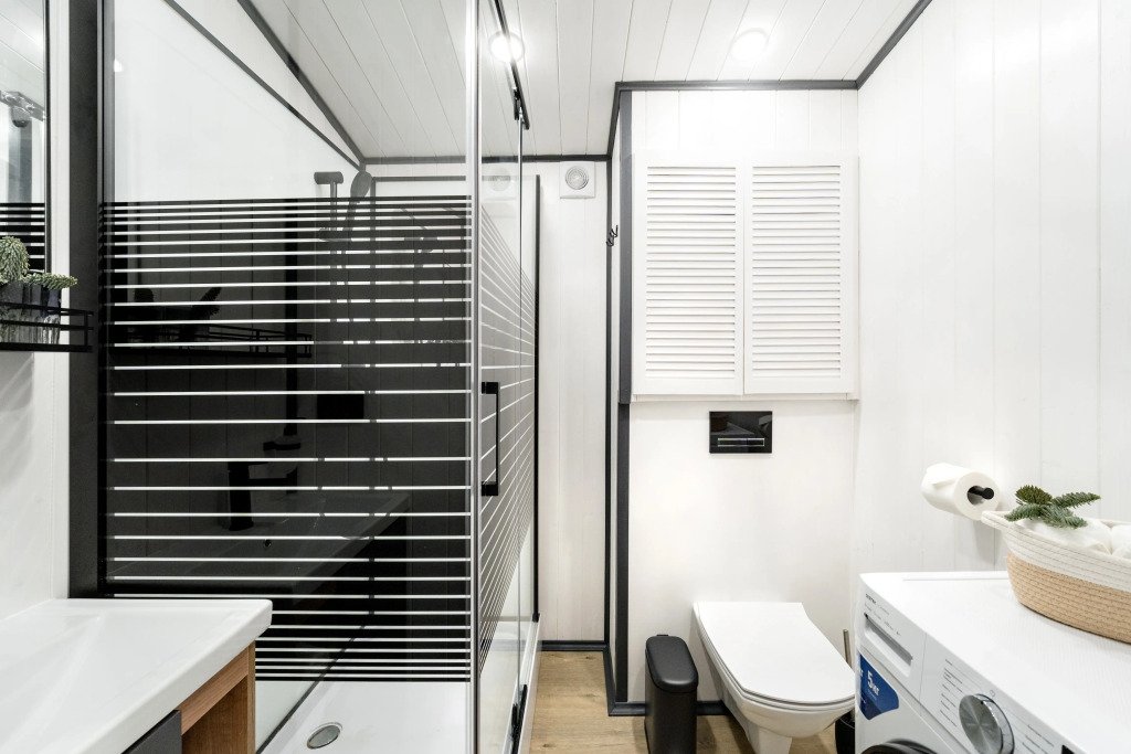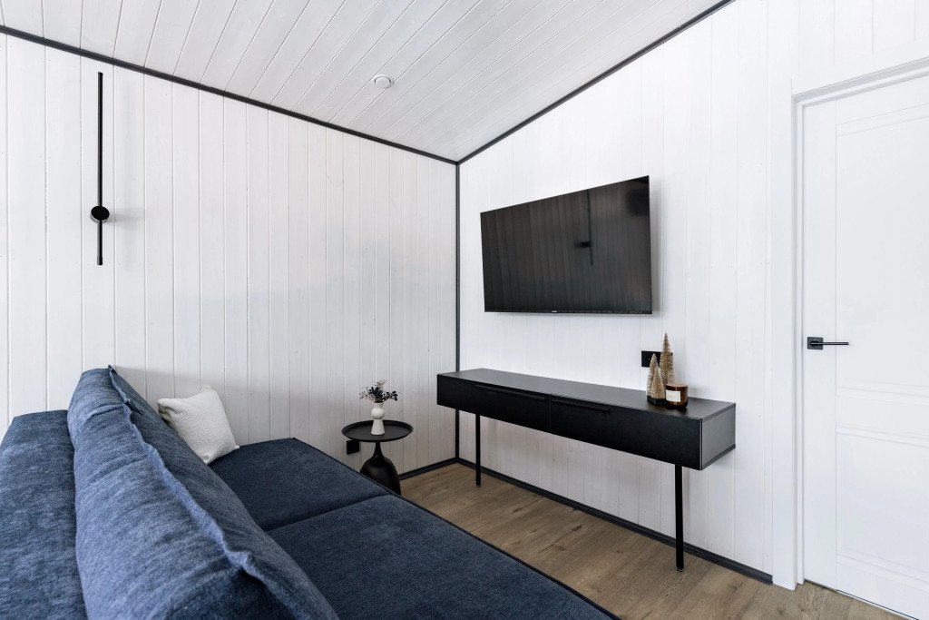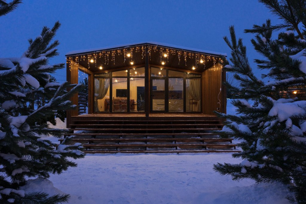 В каждом доме есть отдельная спальня, ванная комната с душевой кабиной, полотенцесушителем и феном, кухня с варочной панелью, вместительный холодильник, микроволновая печь и всё необходимое для приготовления пищи и сервировки стола. Также имеется телевизор со Smart TV, Wi-Fi до 100 Мбит/с, мангальная зона с навесом, решёткой и комплектом шампуров.