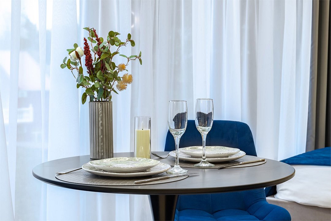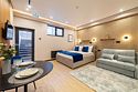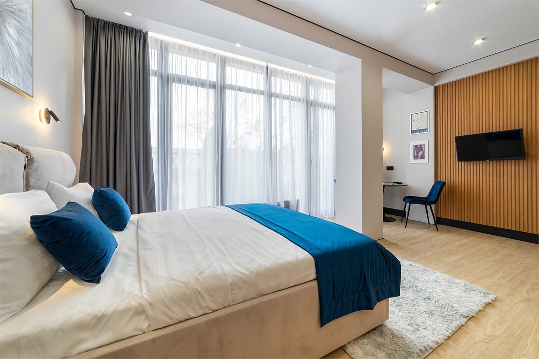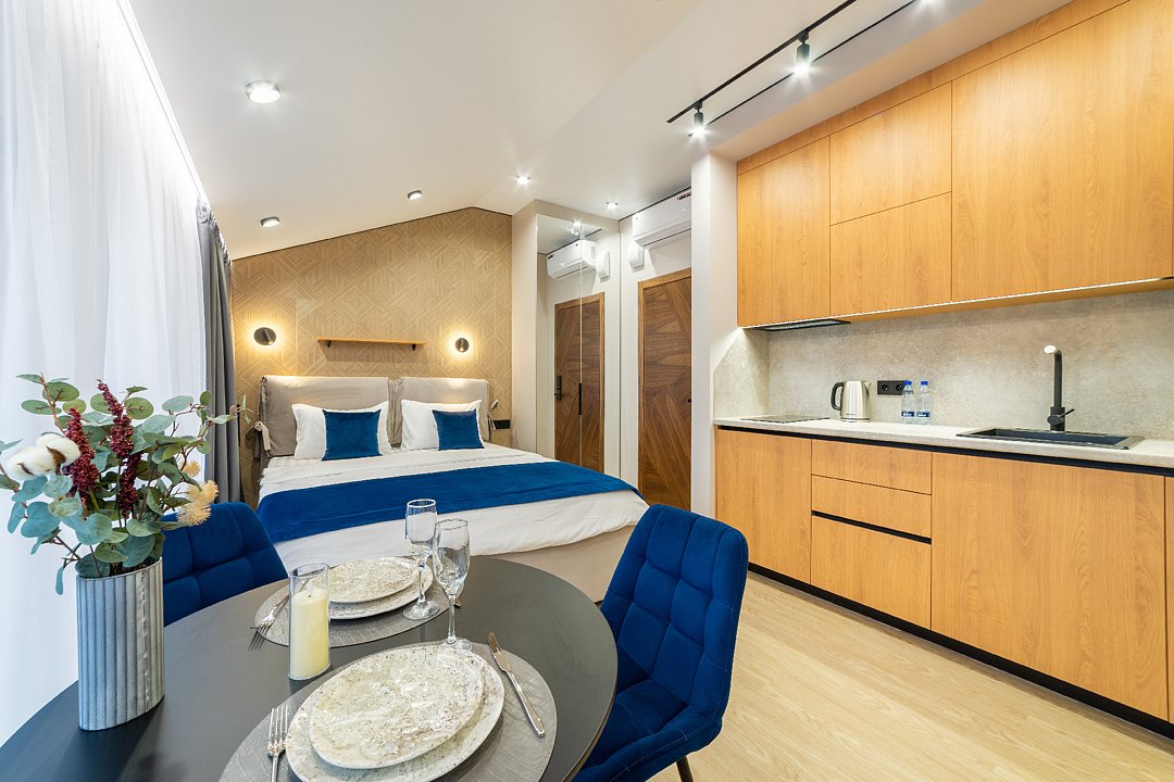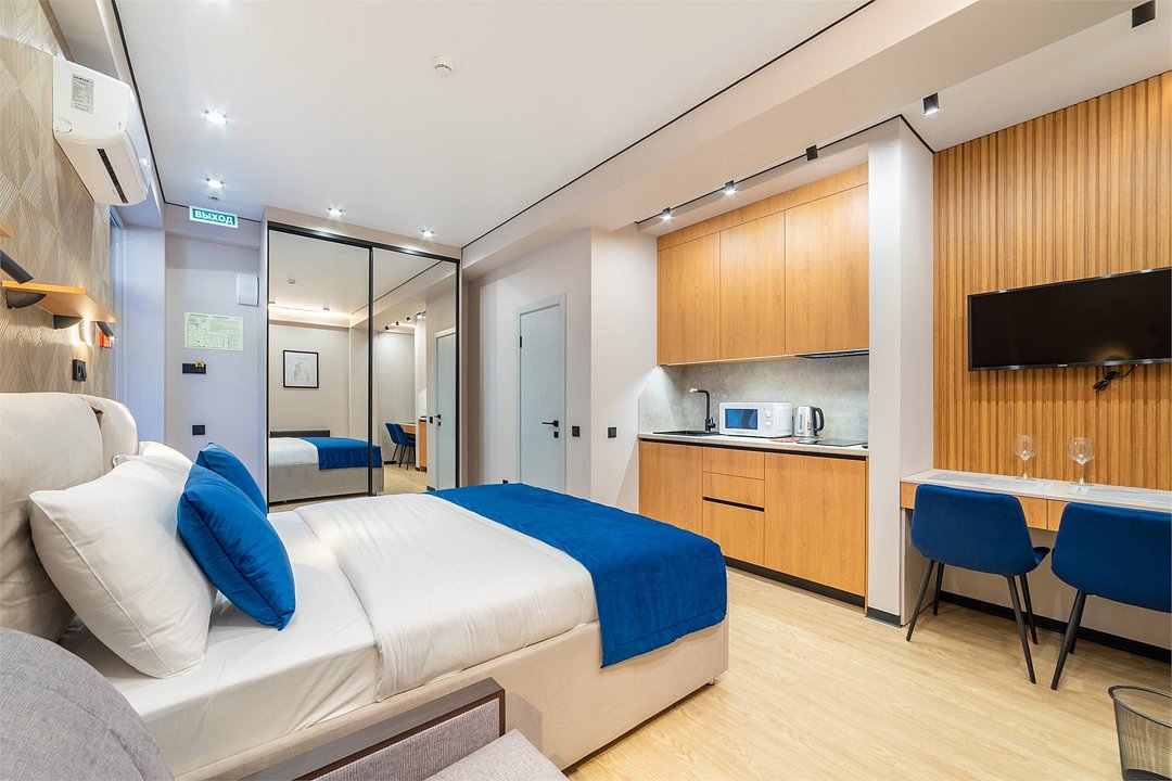 Комфортный однокомнатный номер с панорамными окнами, двуспальной кроватью и кухонной зоной.