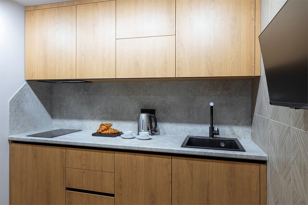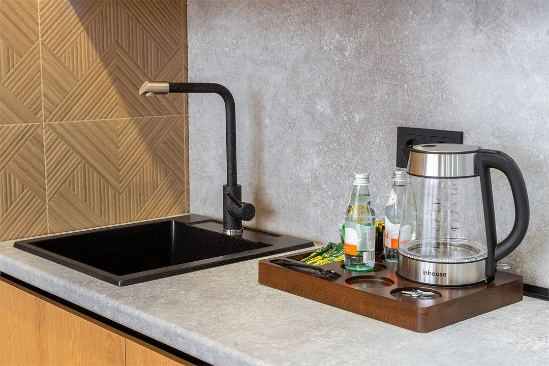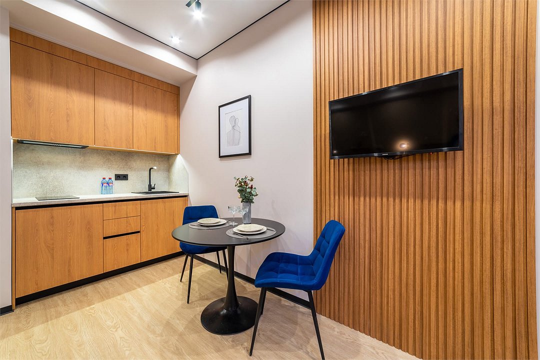 Комфортный однокомнатный номер с раскладным диваном и кухонной зоной.