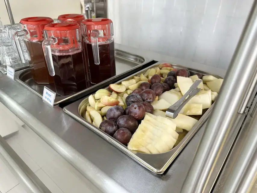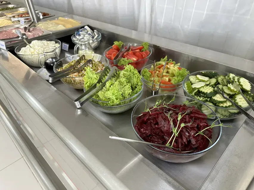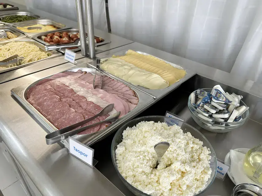 Завтрак: добротный и вкусный: яйца, творог, блинчики, запеканка, каши, сыр и колбаса несколько видов. Чай, кофе,компот и морс.