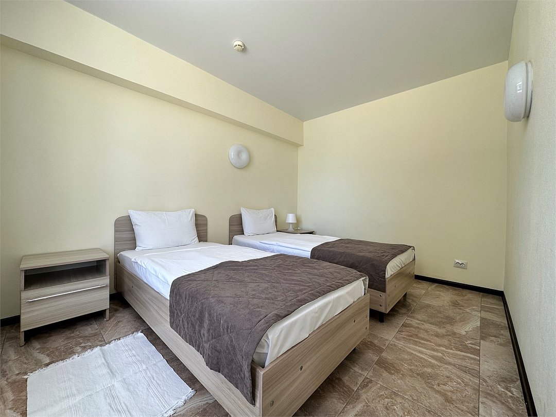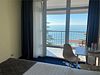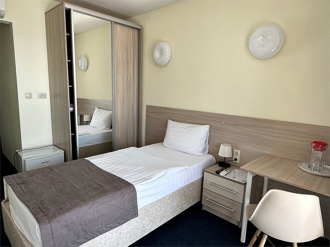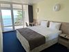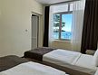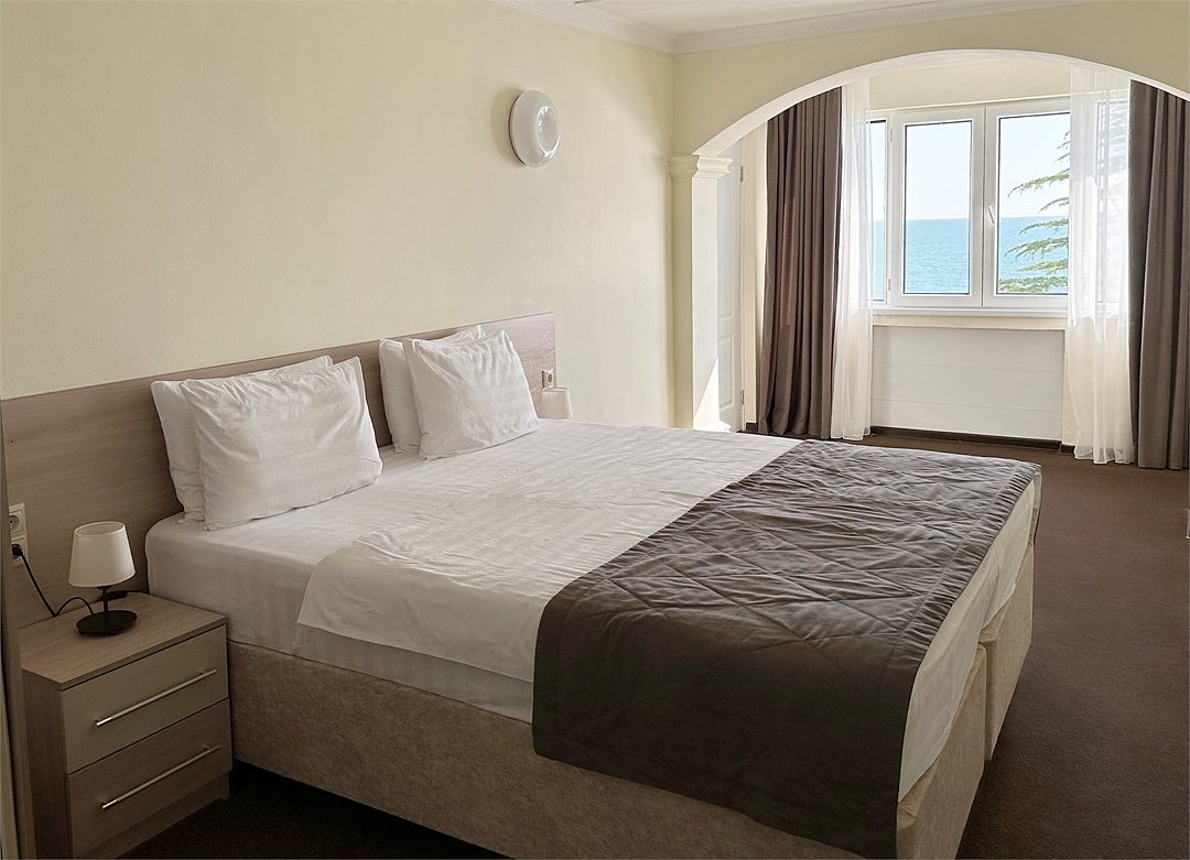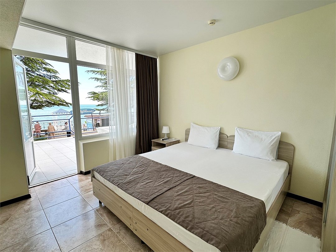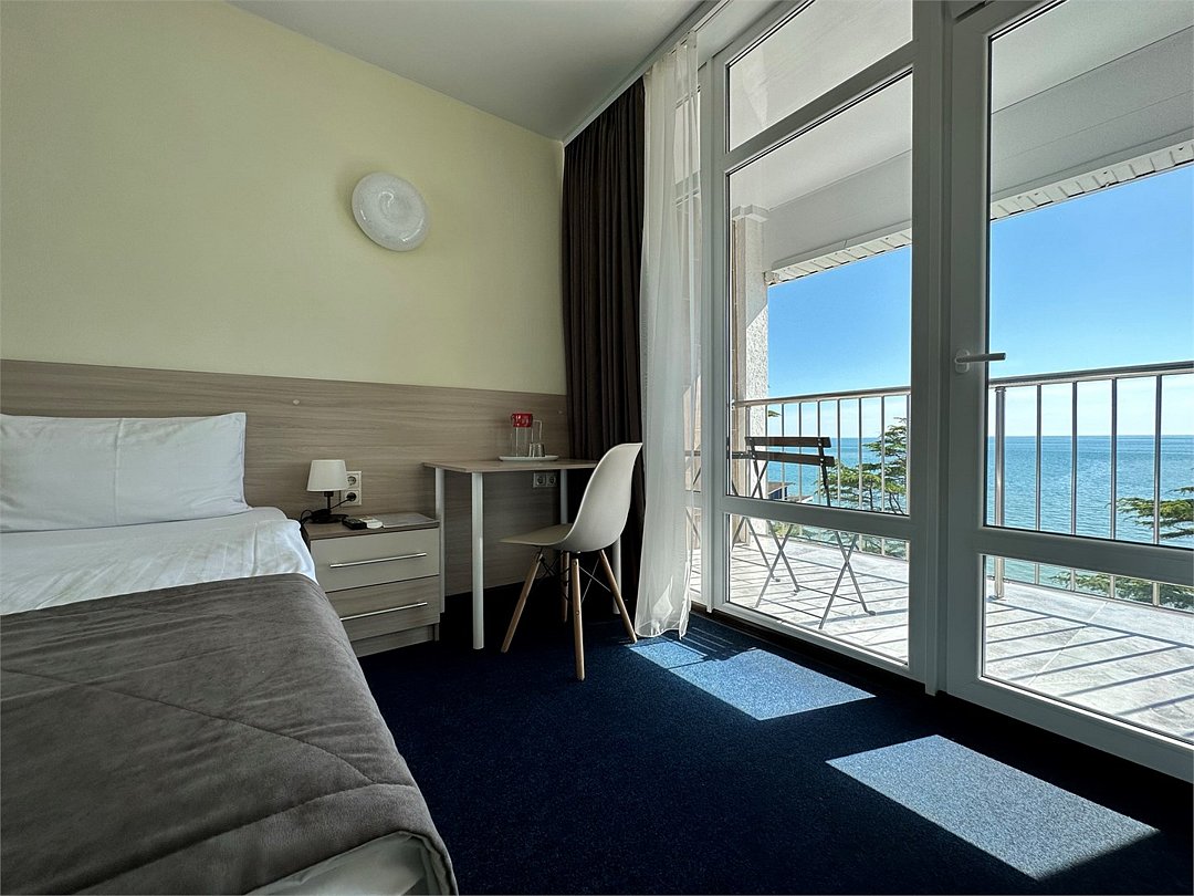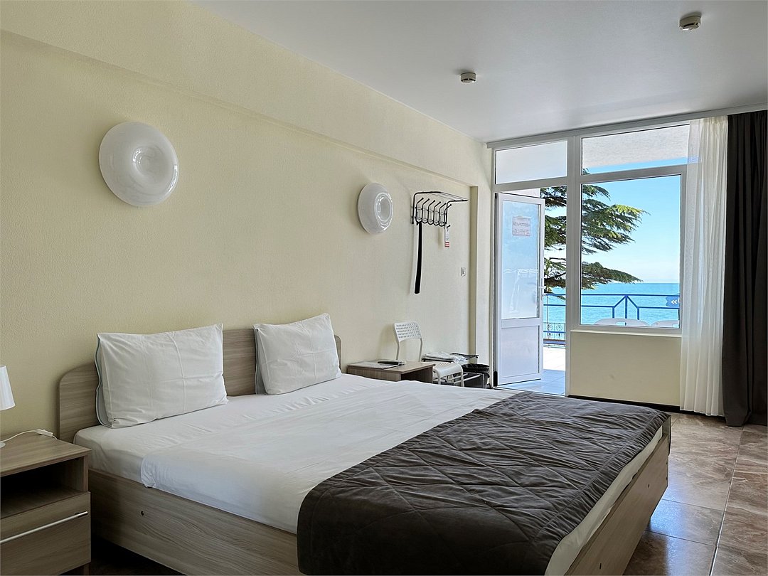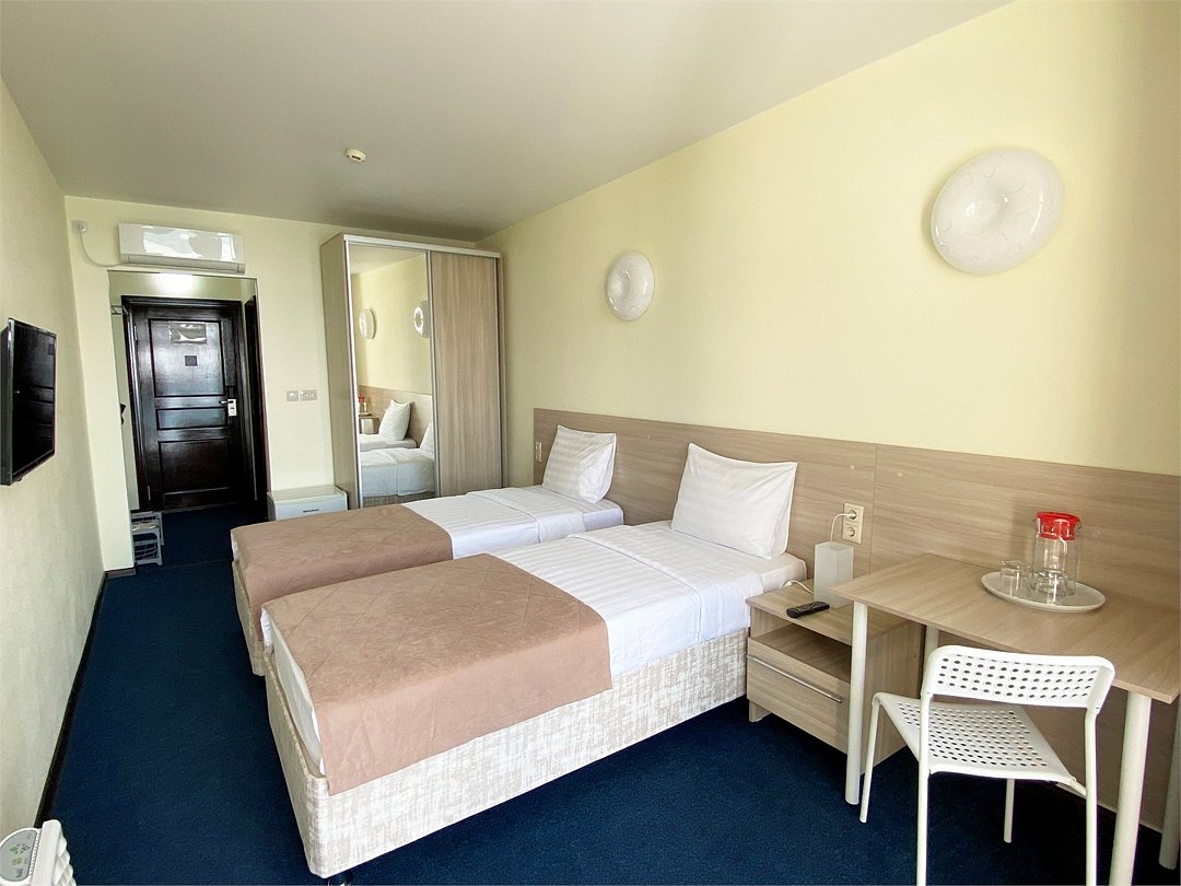 кабельное телевидение, Wi-Fi, интернет, настольные лампы, фен, электронные замки, обогреватель, банные полотенца, пляжные полотенца, тапочки, балкон, две односпальные или большая двуспальная кровать, ортопедический матрас, тумбы, стулья, вешалки, зеркало, чайник, унитаз, раковина, питьевая вода, ковровое покрытие, отопление, душ, вид на море, кулер на этаже, стаканы, стол, сплит-система, панорамные окна, сушилка для белья, телевизор с плоским экраном, мини-холодильник, шкаф-купе, гостиничная парфюмерия, номер для некурящих, уборка номера, прачечная (за дополнительную плату), без питомцевВ гостиничном номере
