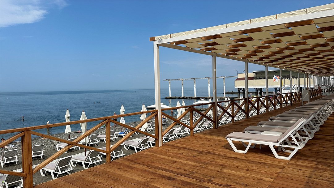 На пляже совсем немного людей, по сравнению с соседними пляжами. Лежаки самые дешевые, удобные с матрасами.