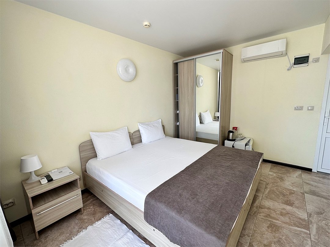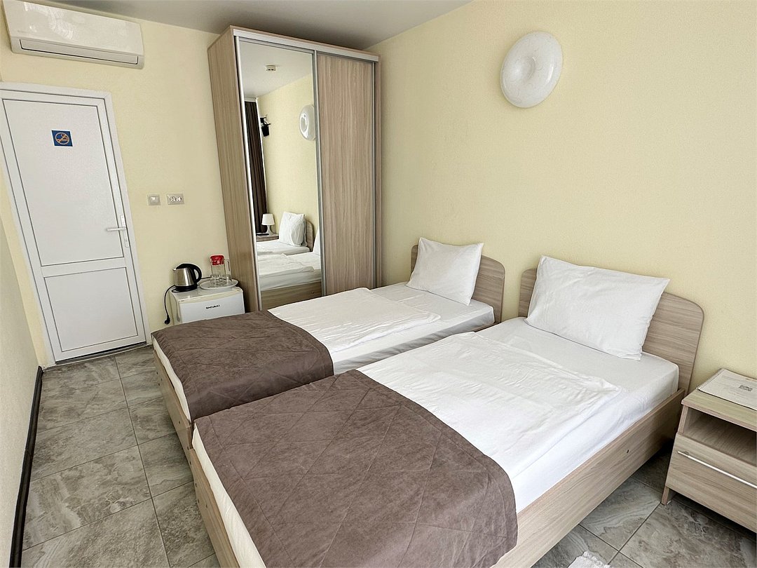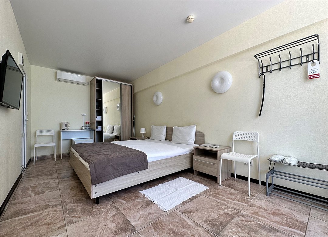 кабельное телевидение, Wi-Fi, интернет, настольные лампы, фен, обогреватель, банные полотенца, пляжные полотенца, тапочки, терраса, две односпальные или большая двуспальная кровать, тумбы, стулья, вешалки, зеркало, сейф, чайник, унитаз, раковина, отопление, отдельный вход в номер, душ, вид на море, кулер на этаже, плиточное покрытие, стаканы, стол, сплит-система, сушилка для белья, телевизор с плоским экраном, мини-холодильник, шкаф-купе, гостиничная парфюмерия, номер для некурящих, уборка номера, прачечная (за дополнительную плату), без питомцевВ гостиничном номере