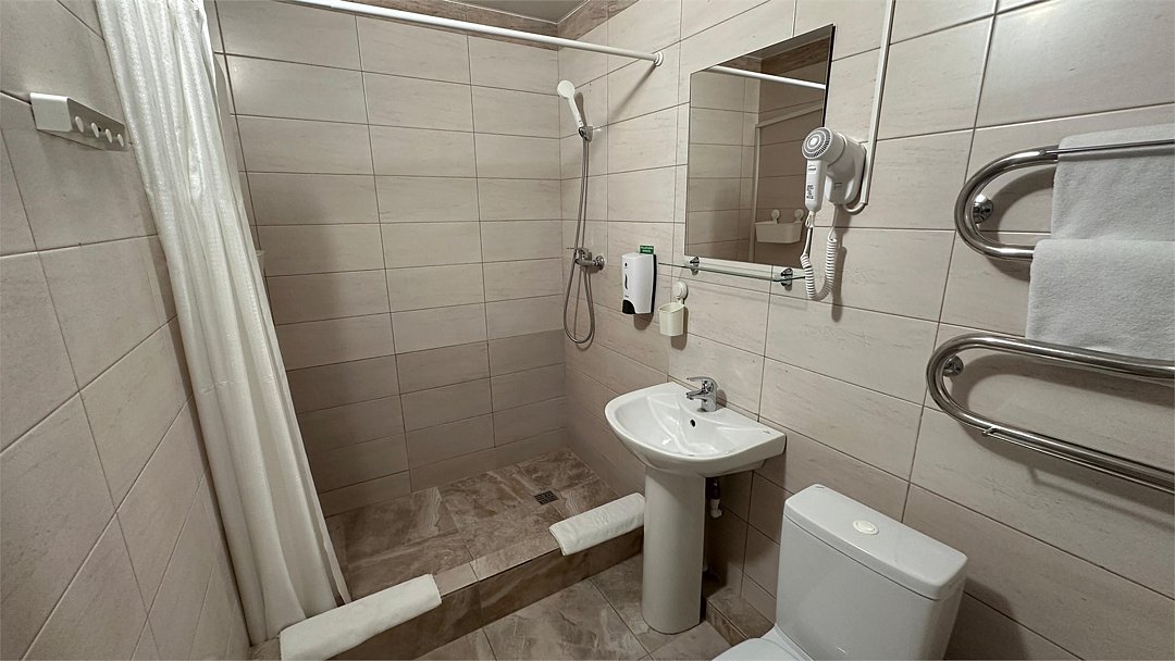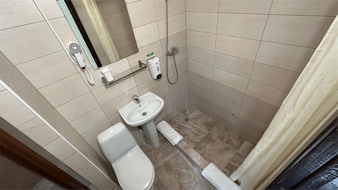 Номер: хорошо продуман- в ванной есть крючки и подставка для шампуней, в комнате большой шкаф, холодильник, вешалка и обувница.