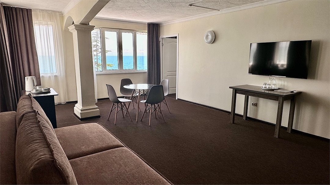 кабельное телевидение, Wi-Fi, интернет, светильник, фен, электронные замки, обогреватель, ванна, санузел, биде, банные полотенца, пляжные полотенца, тапочки, две односпальные или большая двуспальная кровать, диван, тумбы, стулья, шкаф для одежды, вешалки, письменный стол, зеркало, две комнаты, сейф, чайник, унитаз, раковина, ковровое покрытие, отопление, душ, вид на море, кулер на этаже, стаканы, стол, туалет, сплит-система, сушилка для белья, диван-кровать, раскладной диван, телевизор с плоским экраном, мини-холодильник, шкаф-купе, гостиничная парфюмерия, номер для некурящих, уборка номера, затемняющая штора, прачечная (за дополнительную плату), без питомцевВ гостиничном номере