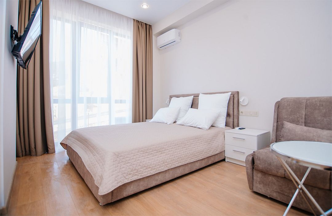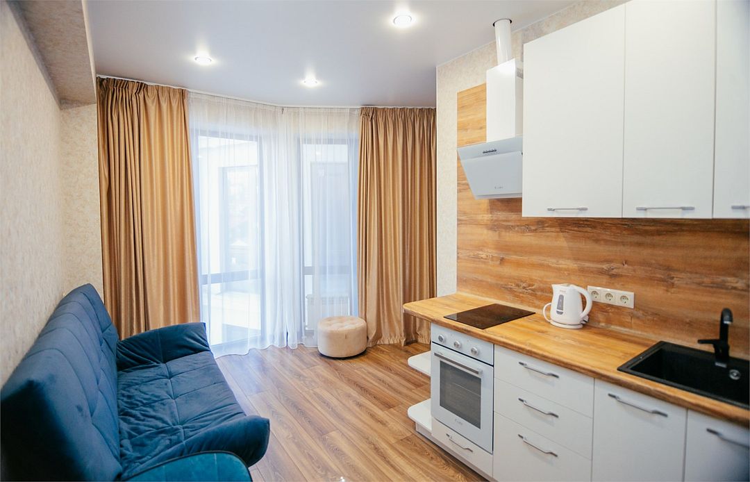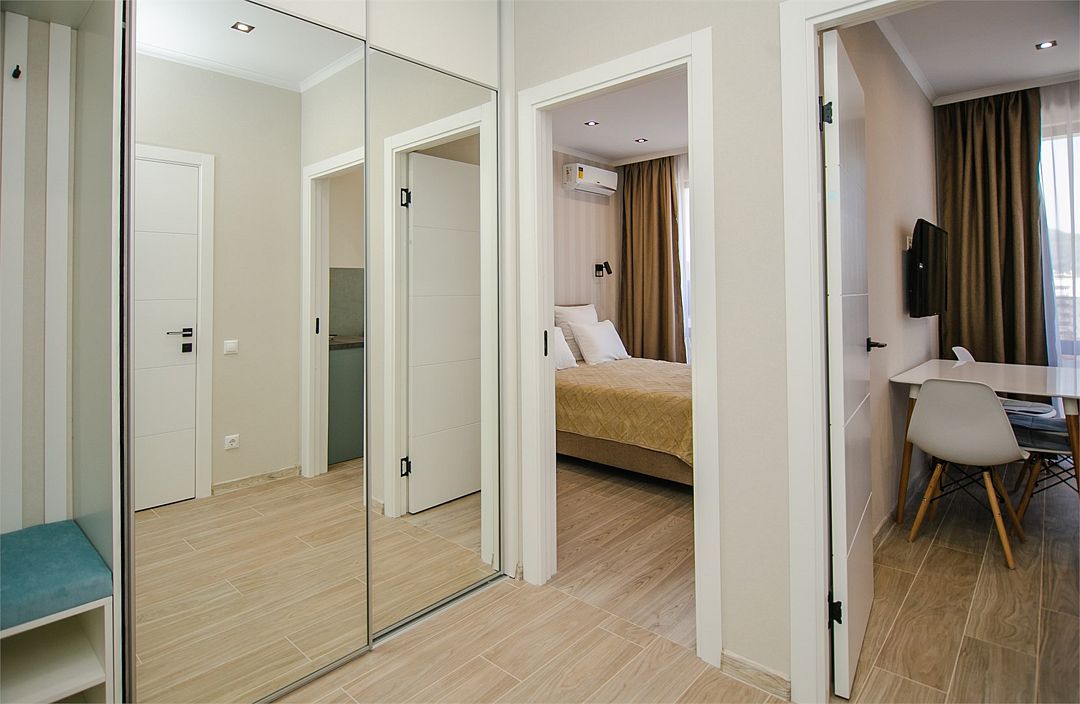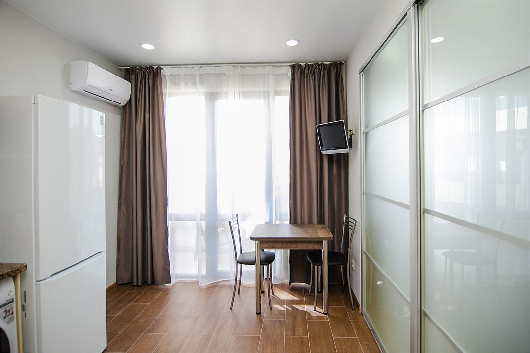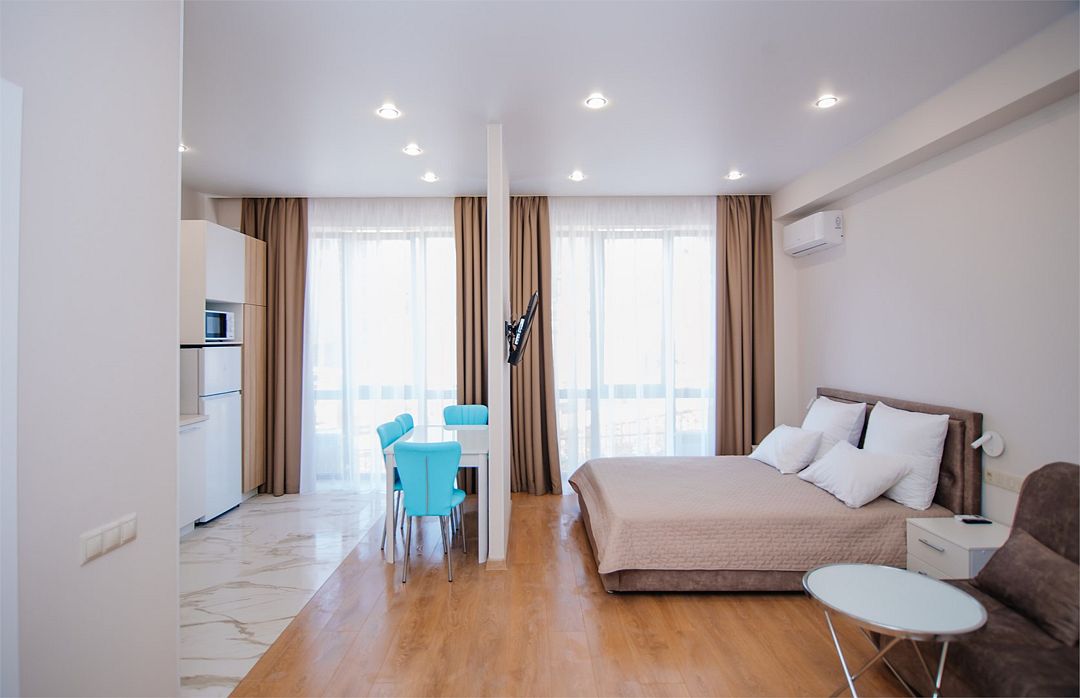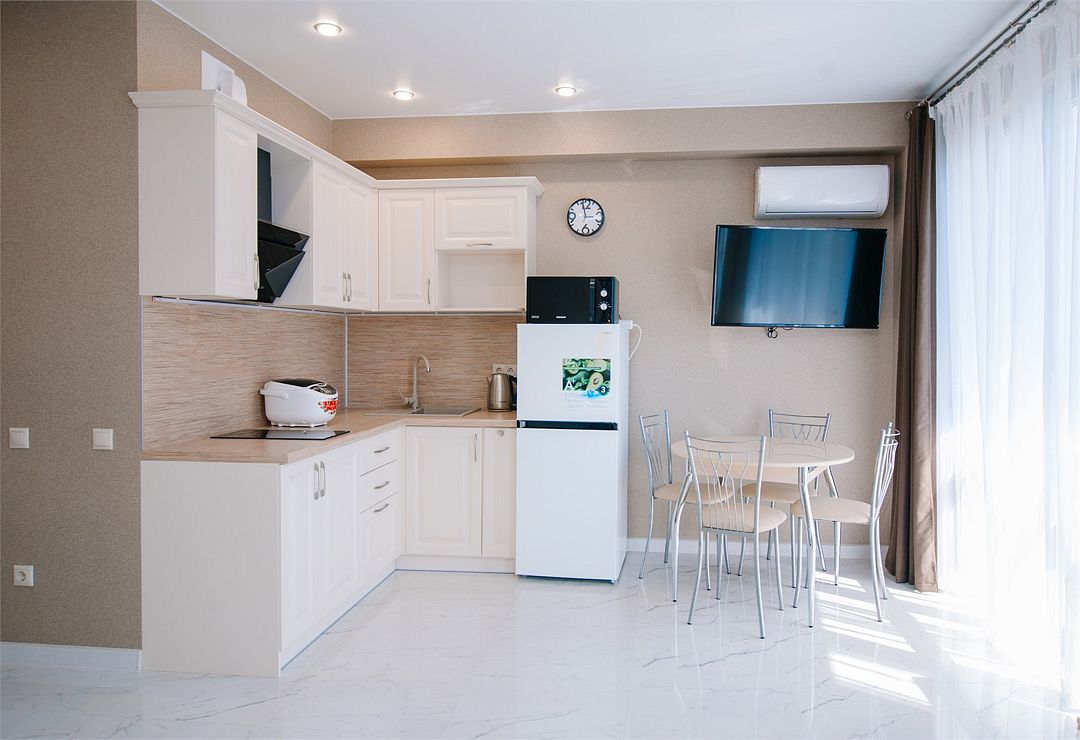 Апартаменты с мини-кухней без балкона. В номере есть шкаф для одежды, двуспальная кровать, диван, телевизор, утюг, кондиционер. На мини-кухне имеется набор посуды, плита для приготовления, электрический чайник, холодильник, микроволновая печь. В санузле имеется душ, фен, стиральная машина, набор полотенец, халат, гигиенические принадлежности. Номер рассчитан на комфортное проживание 1-3 человек. Площадь номера - 25 кв.м. При бронировании подтверждается только категория апартамента, конкретный номер не гарантирован. Номера данной категории различаются в оформлении.Услуги и удобства