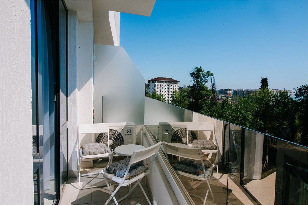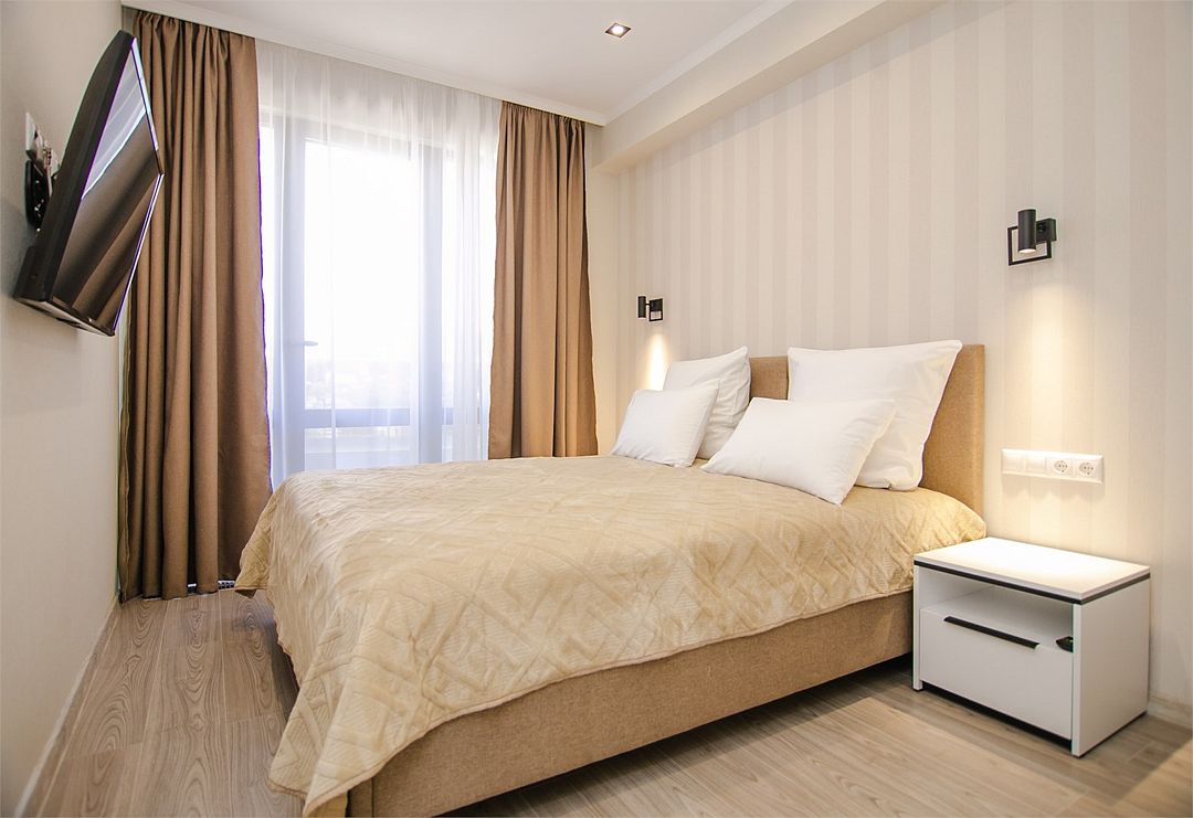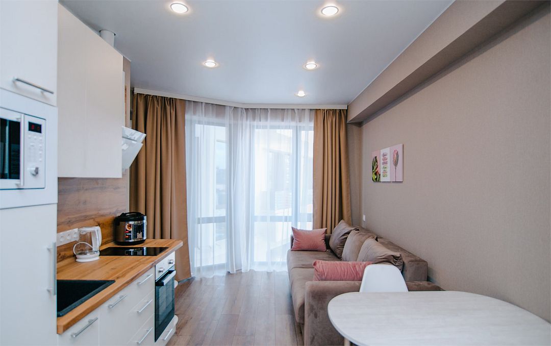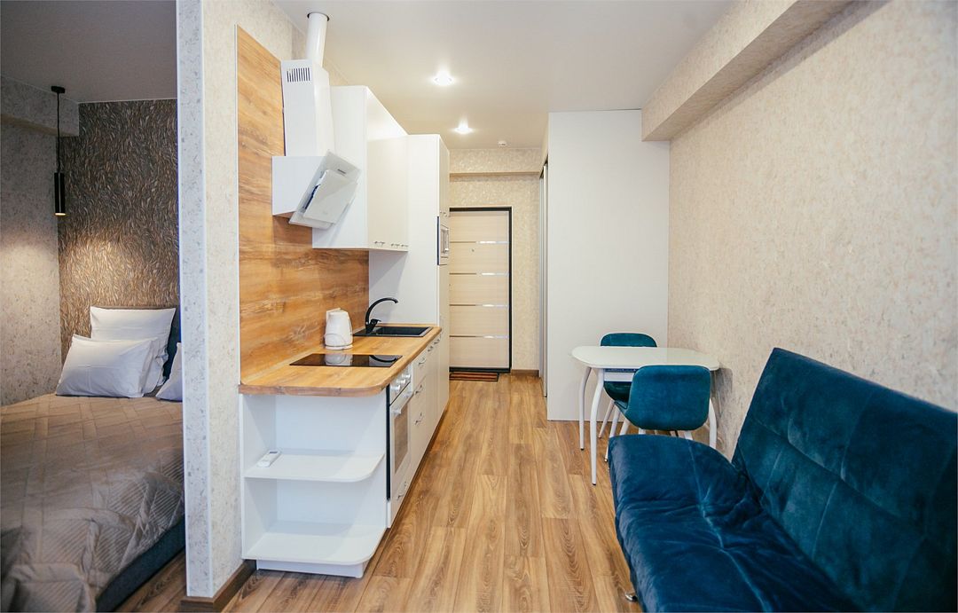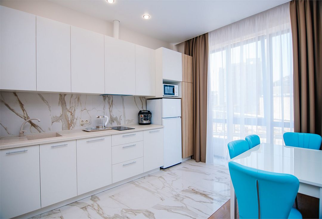 Апартаменты с мини-кухней без балкона. В номере есть шкаф для одежды, двуспальная кровать, диван, телевизор, утюг, кондиционер. На мини-кухне имеется набор посуды, плита для приготовления, электрический чайник, холодильник, микроволновая печь. В санузле имеется душ, фен, стиральная машина, набор полотенец, халат, гигиенические принадлежности. Номер рассчитан на комфортное проживание 1-3 человек. Площадь номера - 25 кв.м. При бронировании подтверждается только категория апартамента, конкретный номер не гарантирован. Номера данной категории различаются в оформлении.Услуги и удобства