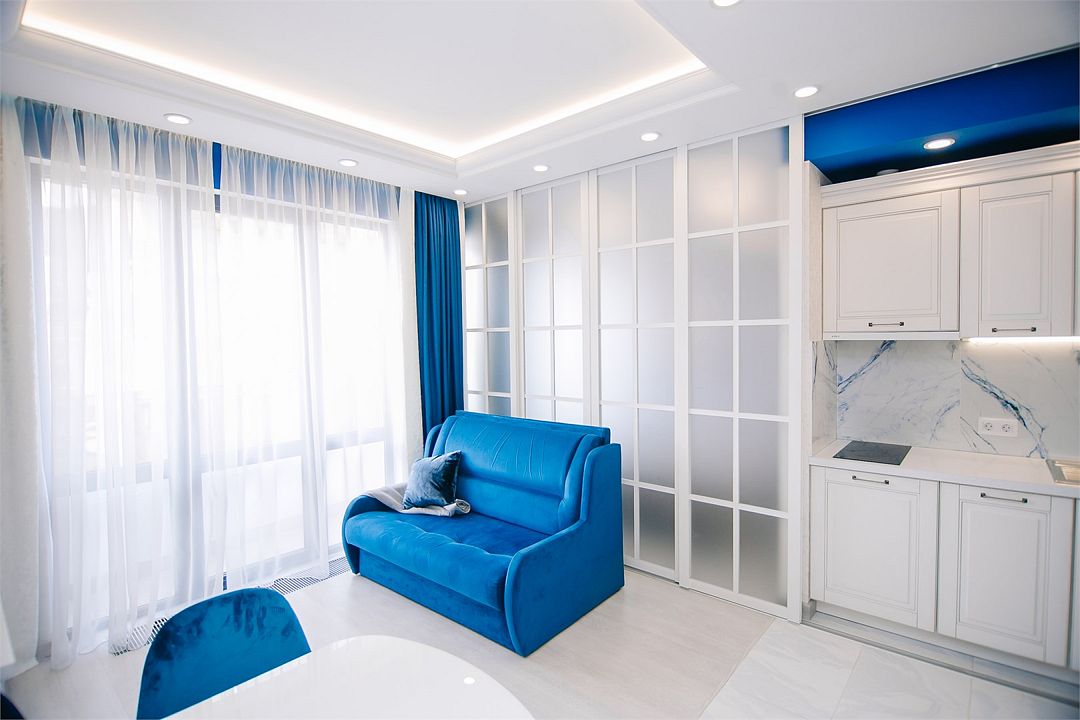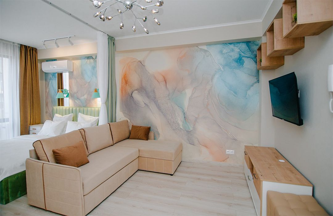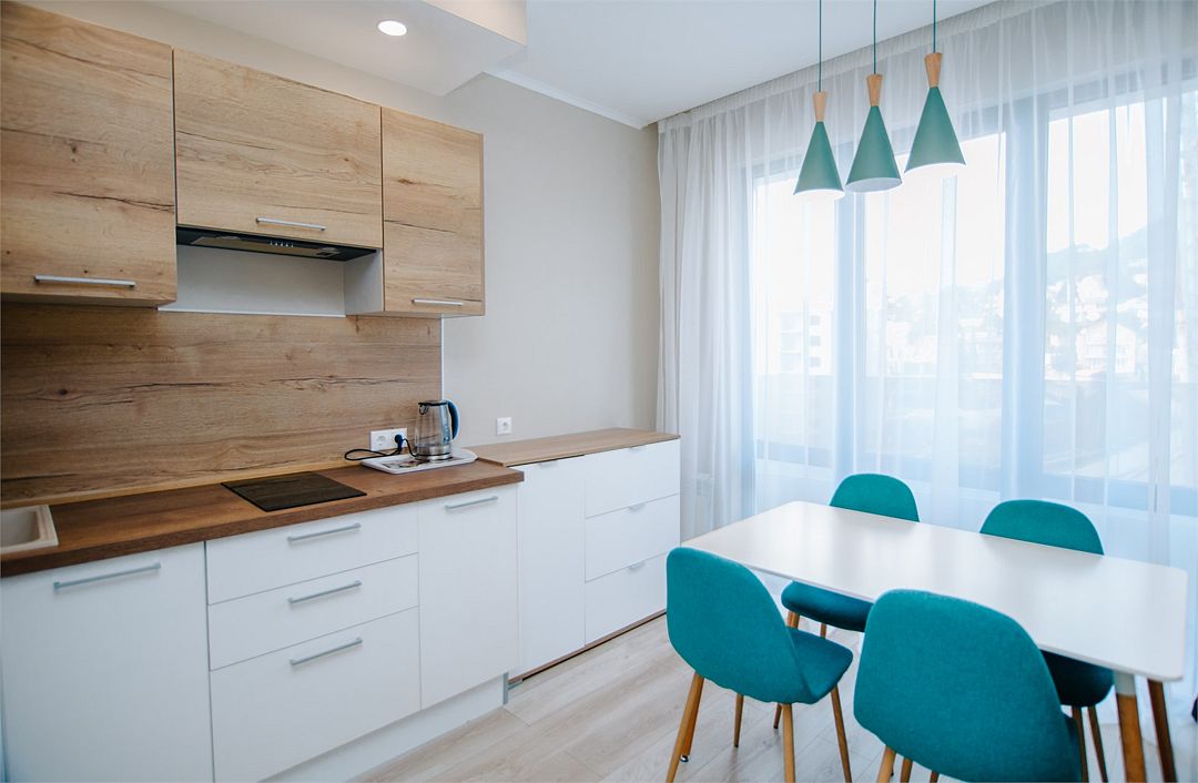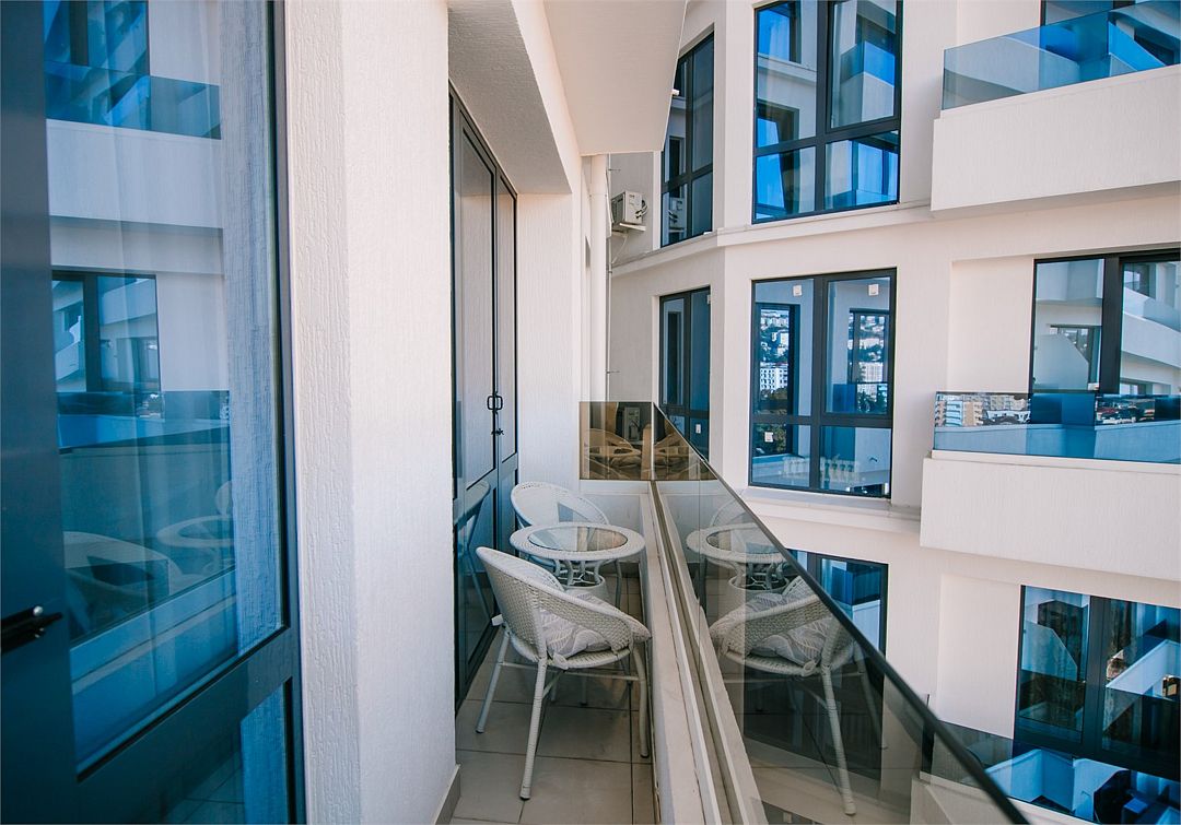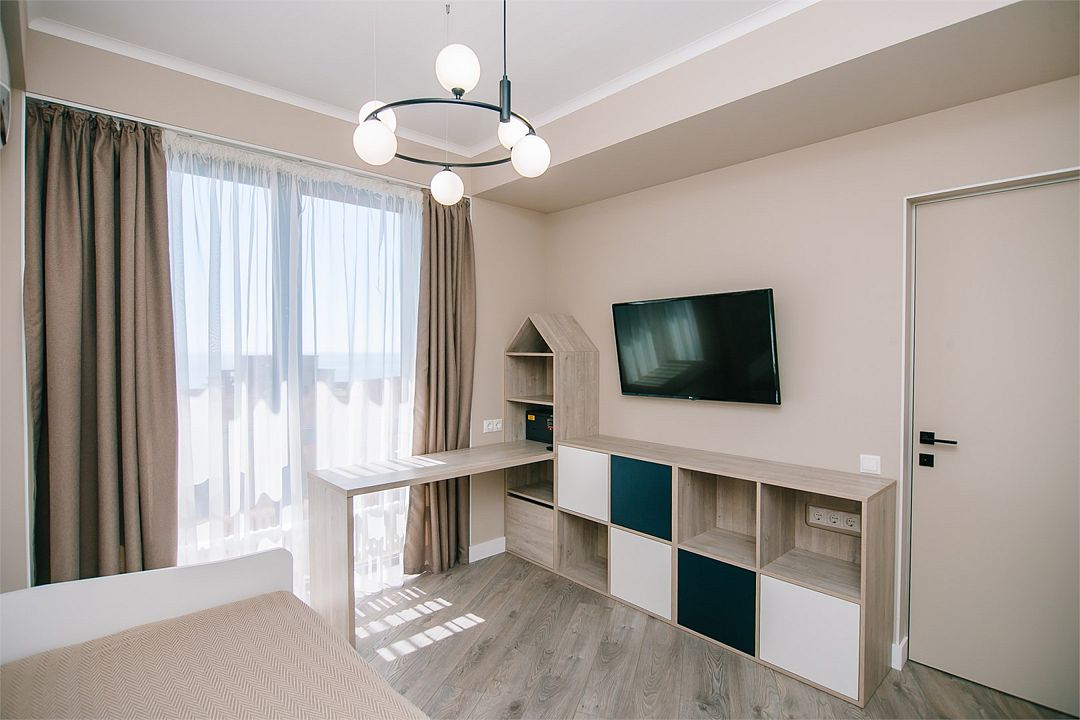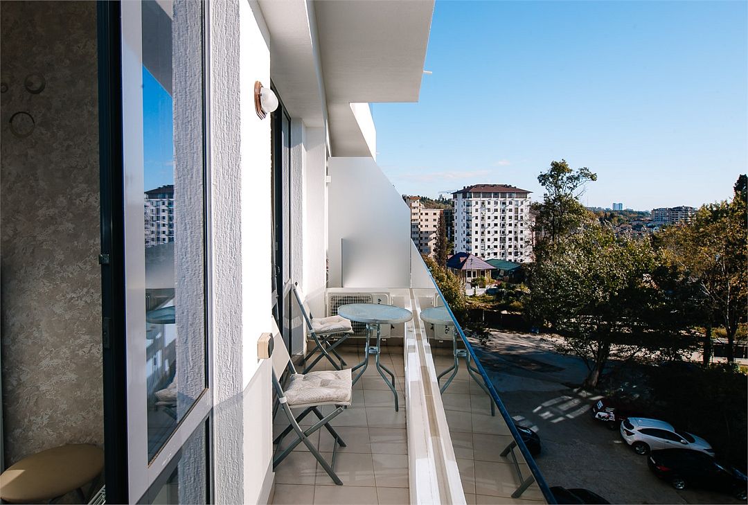 Апартаменты с мини-кухней без балкона. В номере есть шкаф для одежды, двуспальная кровать, диван, телевизор, утюг, кондиционер. На мини-кухне имеется набор посуды, плита для приготовления, электрический чайник, холодильник, микроволновая печь. В санузле имеется душ, фен, стиральная машина, набор полотенец, халат, гигиенические принадлежности. Номер рассчитан на комфортное проживание 1-3 человек. Площадь номера - 25 кв.м. При бронировании подтверждается только категория апартамента, конкретный номер не гарантирован. Номера данной категории различаются в оформлении.Услуги и удобства