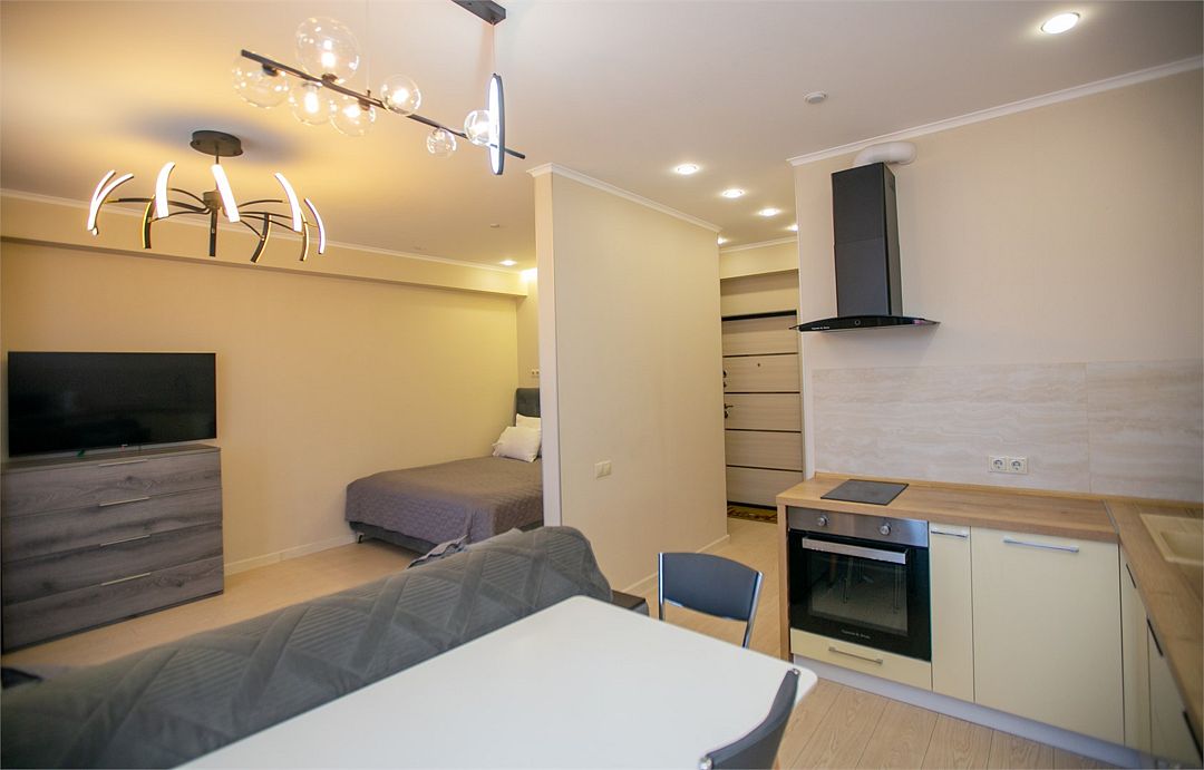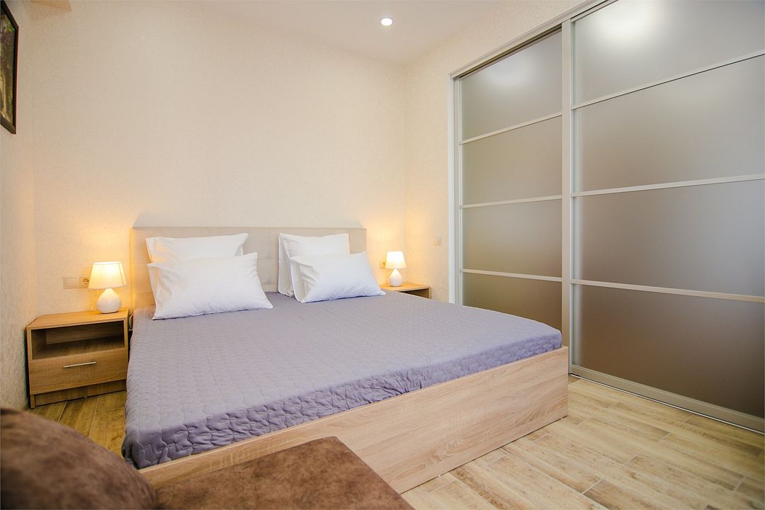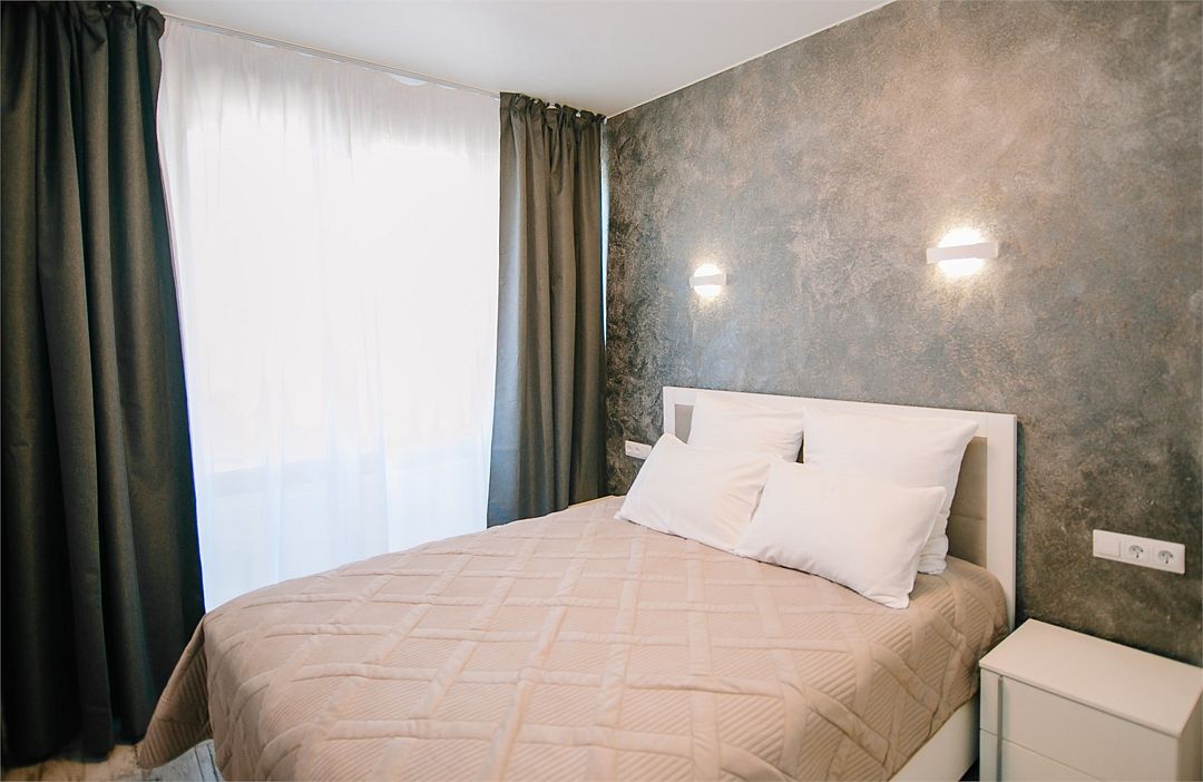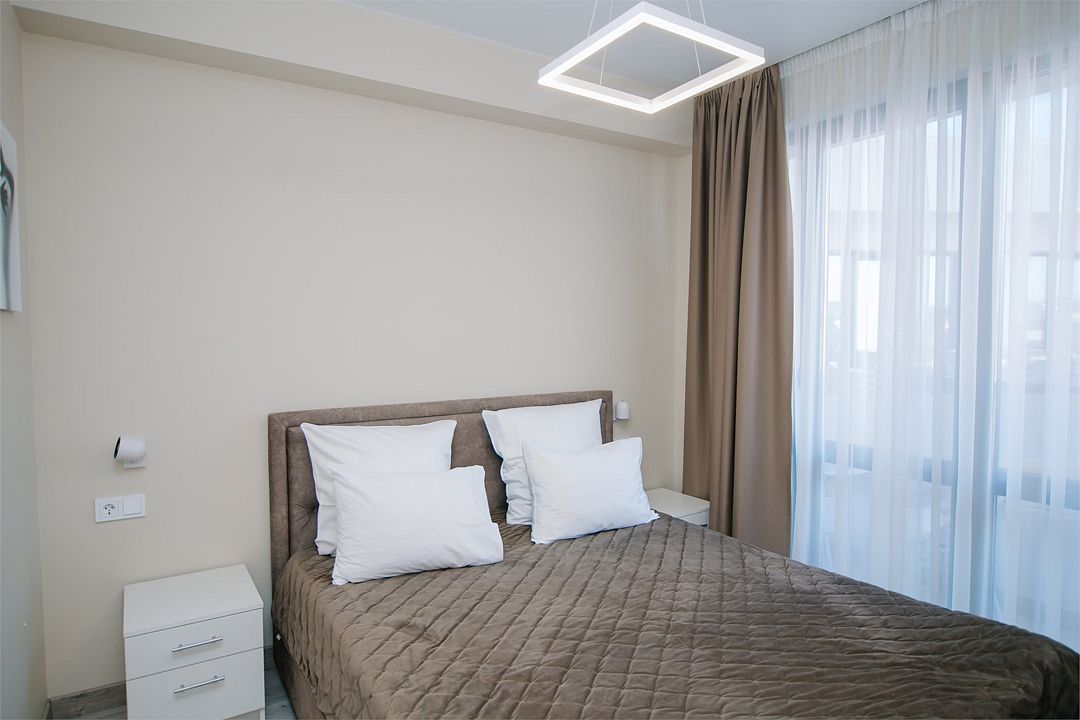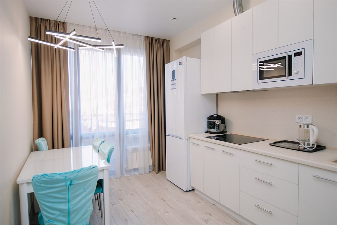 - Апартамент с полным оснащением: кондиционер, ТВ, Wi-Fi, электроплита, микроволновая печь, чайник, холодильник, мультиварка, посуда, стиральная машина, фен и другие удобства.
