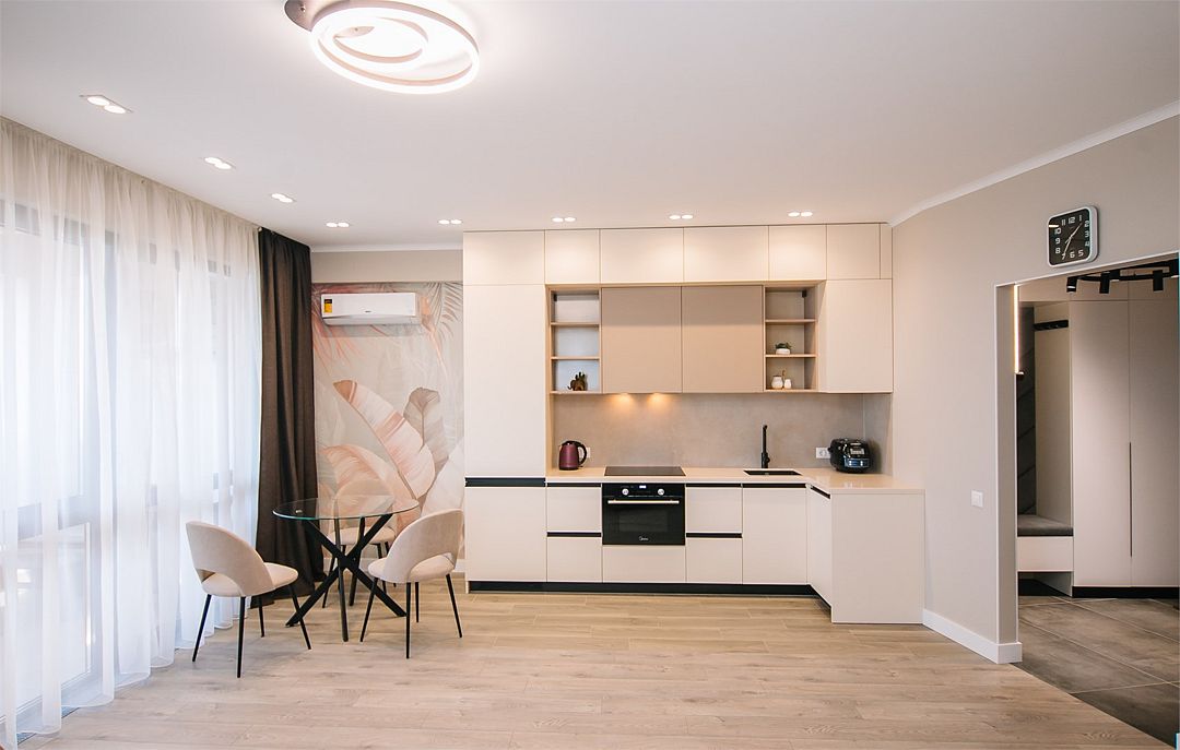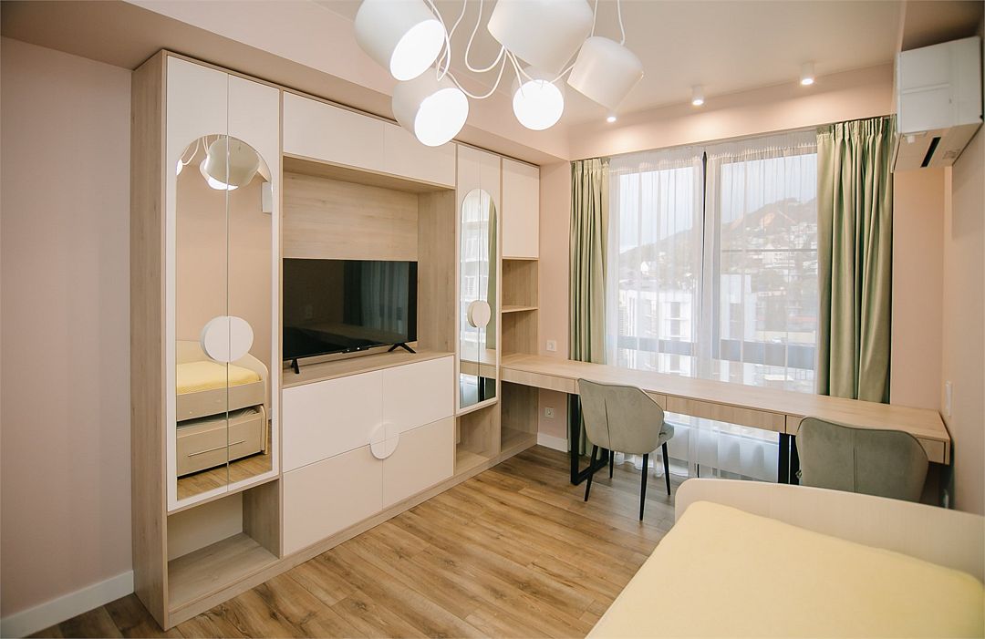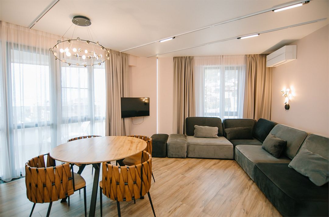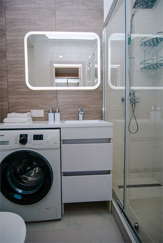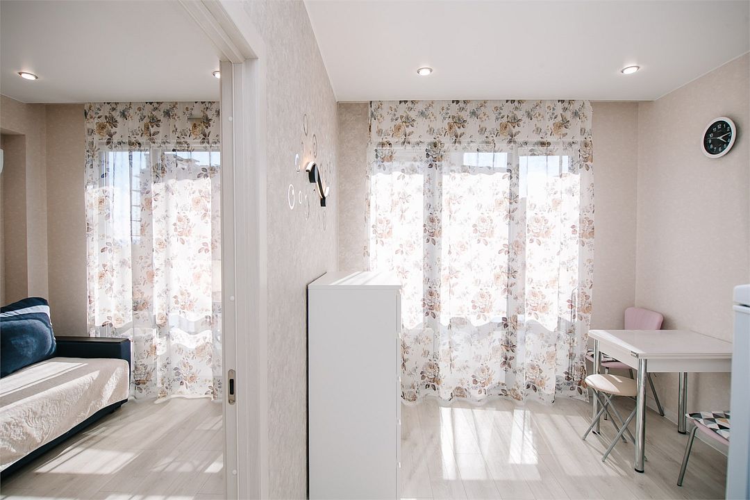 - Апартамент с полным оснащением: кондиционер, ТВ, Wi-Fi, электроплита, микроволновая печь, чайник, холодильник, мультиварка, посуда, стиральная машина, фен и другие удобства.