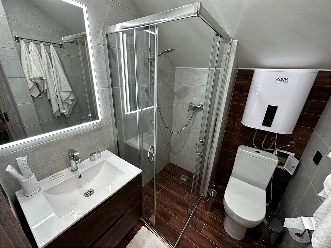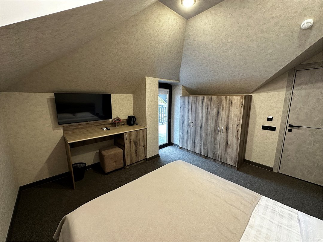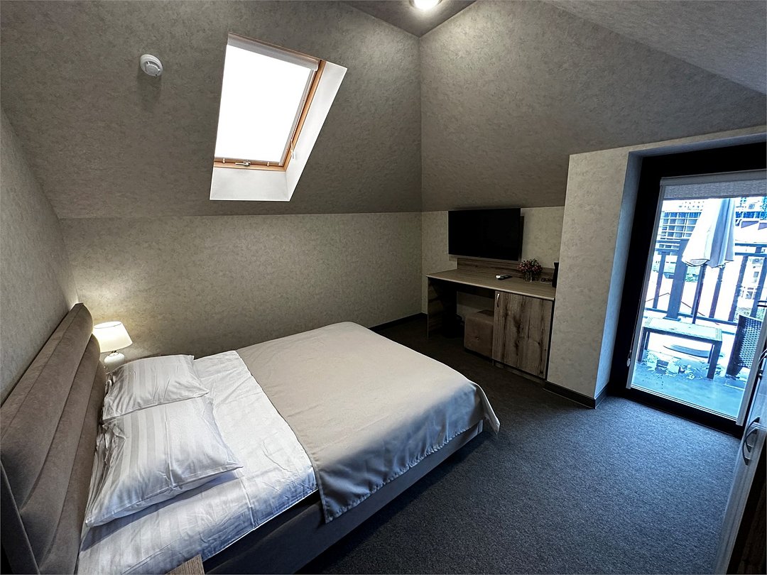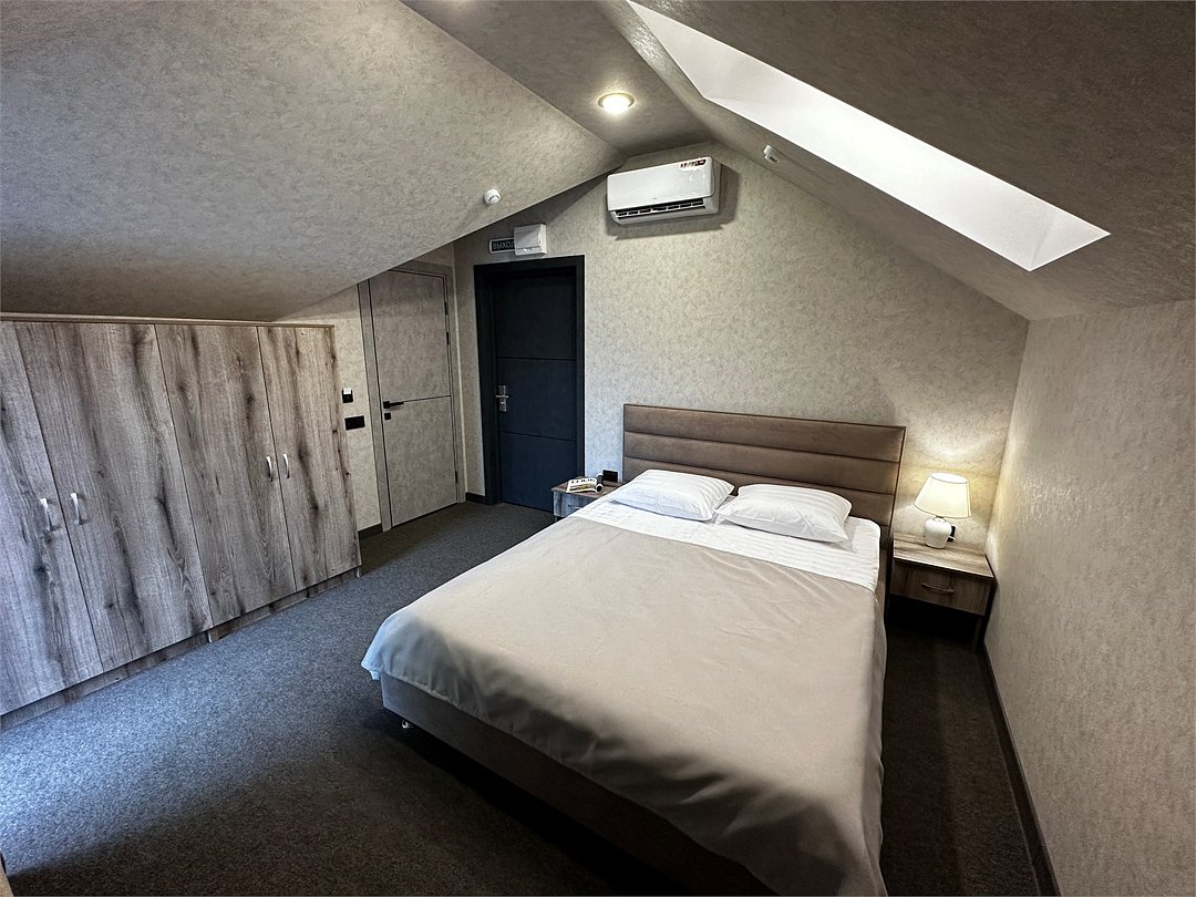 Стандартный Комфорт с 1 большой кроватью, и с террасой на крыше. Номер оборудован сан. узлом с душевой кабиной. В номере имеется косметический столик, шкаф, сейф, телевизор. Номер расположен на последнем этаже здания.Услуги и удобства