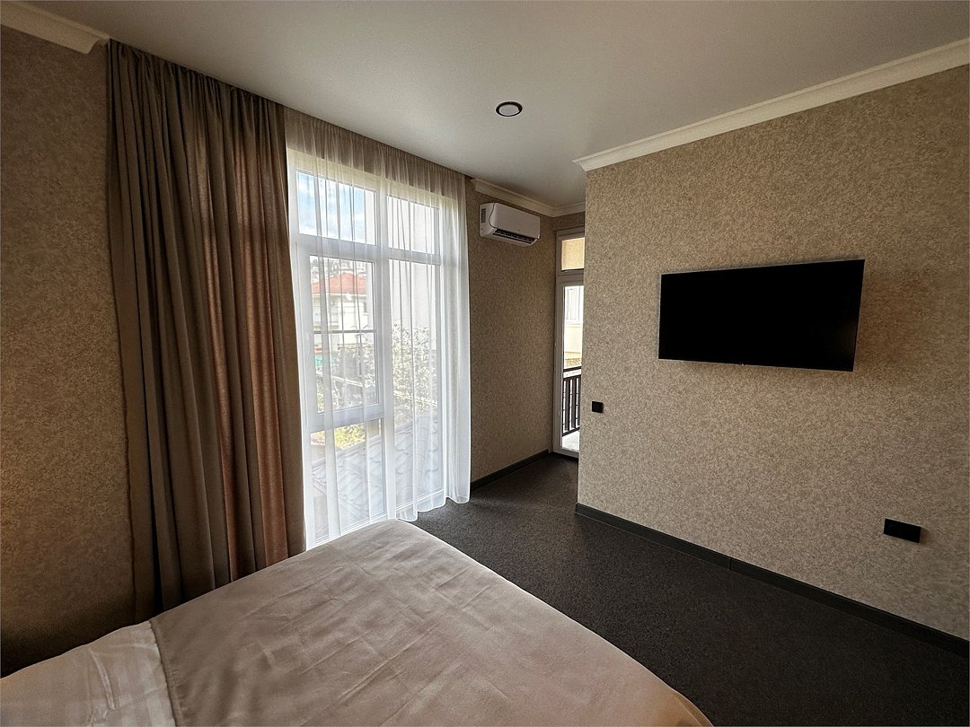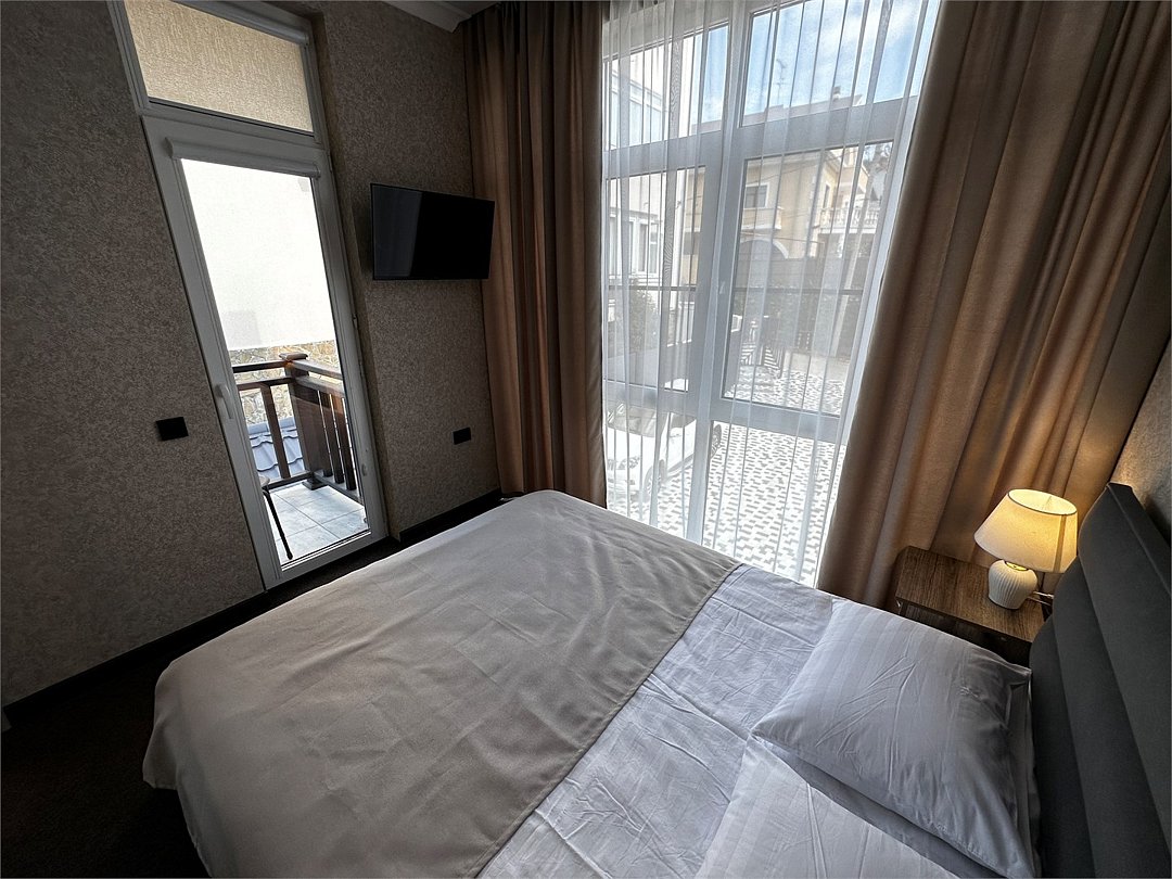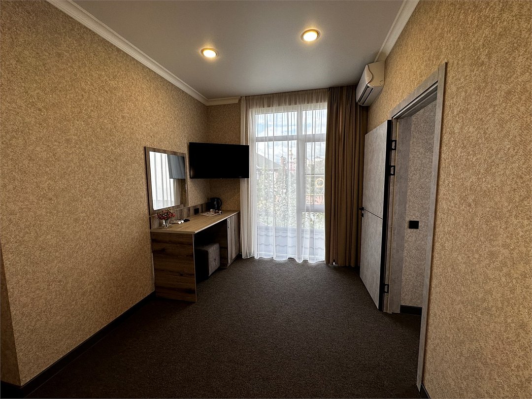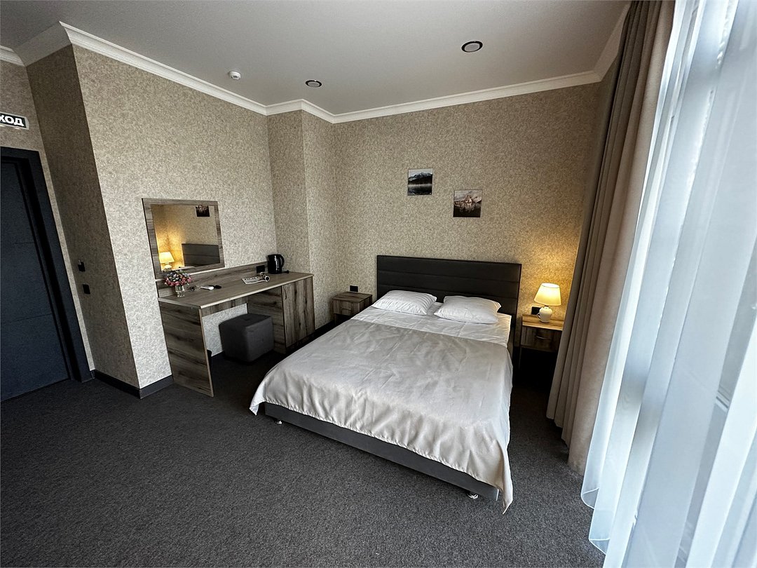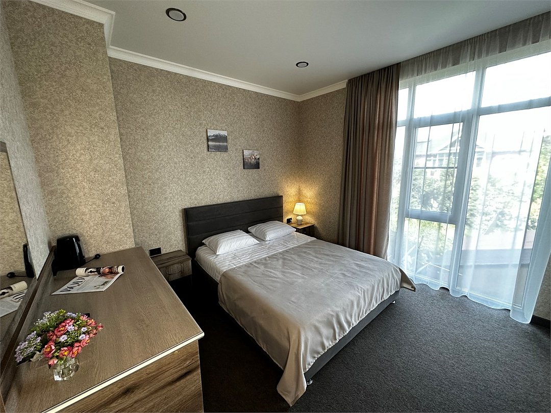 Стандартный номер с 1 большой кроватью, балконом и панорамным остеклением. Номер оборудован сан. узлом с душевой кабиной. В номере имеется косметический столик, шкаф, сейф, телевизор. Номера расположены с первого по третий этаж.Услуги и удобства