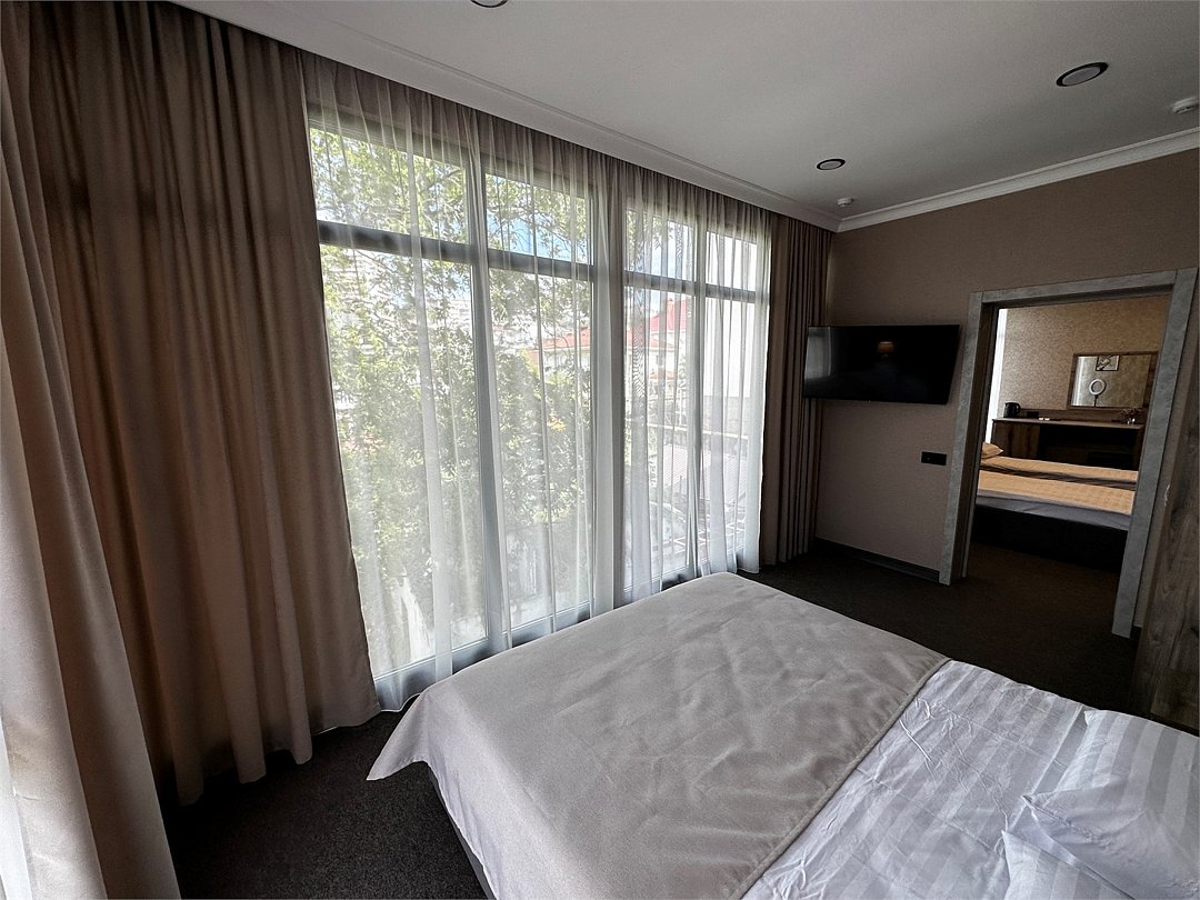 Люкс 2-х комнатный. Номер с 1 большой кроватью и 2 раздельными в гостинной или диваном. Номера имеют панорамное остекление. Могут быть с балконом и без него. Номер оборудован сан. узлом с душевой кабиной. В номере имеется косметический столик, шкаф, сейф, телевизор. Номера расположены с первого по третий этаж.Услуги и удобства