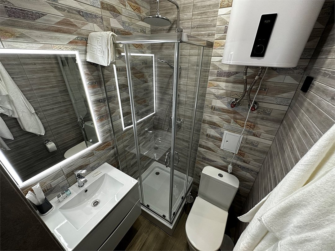 Wi-Fi, душевая кабина, банные принадлежности, двуспальная кровать, две односпальные кровати, диван, зеркало, мебельный гарнитур, вид на город, вид во двор, туалетные средства, туалет, сплит-система, панорамные окна, цифровое тв, телевизор с плоским экраном, мини-холодильник, вид на горы, без питомцевВ гостиничном номере